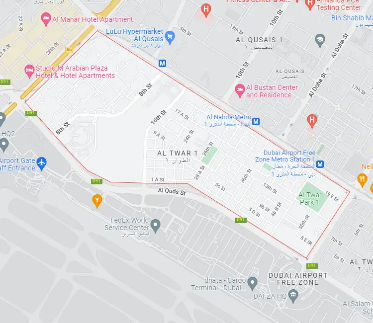 Al Twar 1 is a locality in the emirate of Dubai and a sub-community of Al Twar. Numerous businesses from Dubai reside there and it is regarded as an exclusive residential area. Al Nahda Street and Al Quds Street provide access to this primarily residential area. Al Nahda Metro Station, Dubai International Airport, Al Bustan Center & Residence, business centres, retail stores, and many other services are all within walking distance of the neighbourhood.