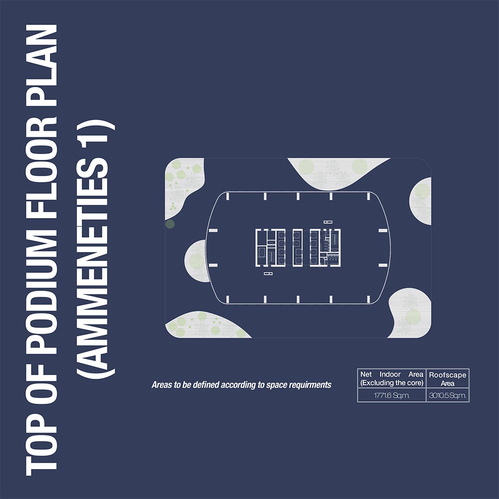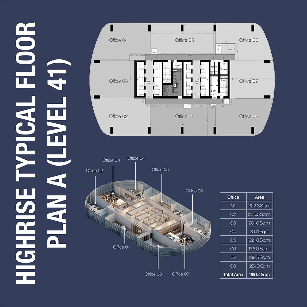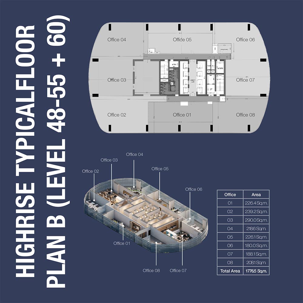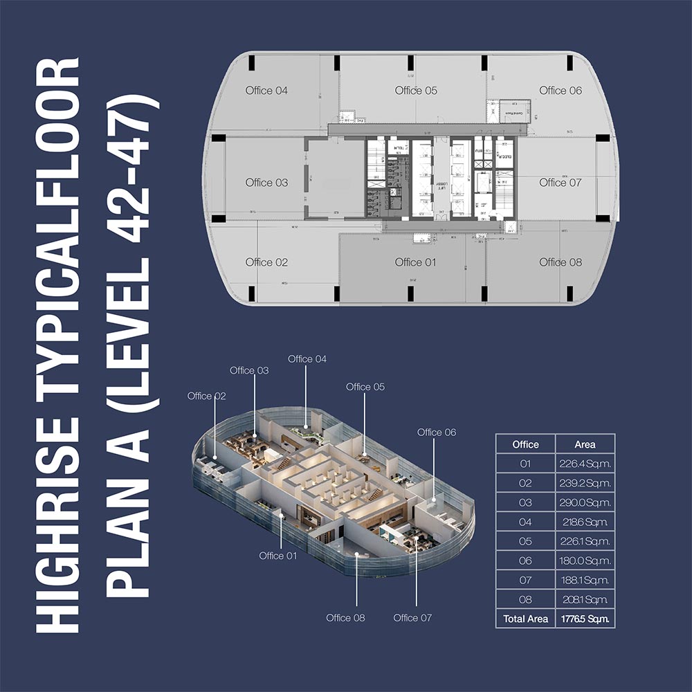 The floor plan of 1970 Office Tower offers one basement level, a ground floor, seven podium levels, and 50 upper floors, all designed to provide ample space for parking, access, and everyday operations. The building is thoughtfully designed with a smart unit layout, combining both work and lifestyle spaces for better comfort and functionality. It features sky garden floors that bring in greenery, fresh air, and relaxing areas, along with typical office floors for daily work. Additional sky gardens add more open and natural spaces throughout the tower. A dedicated amenities floor provides facilities for comfort and convenience. The podium levels are mainly used for parking to ensure easy access and smooth movement, while the ground level includes the main entrance and retail spaces, creating a lively and welcoming atmosphere.