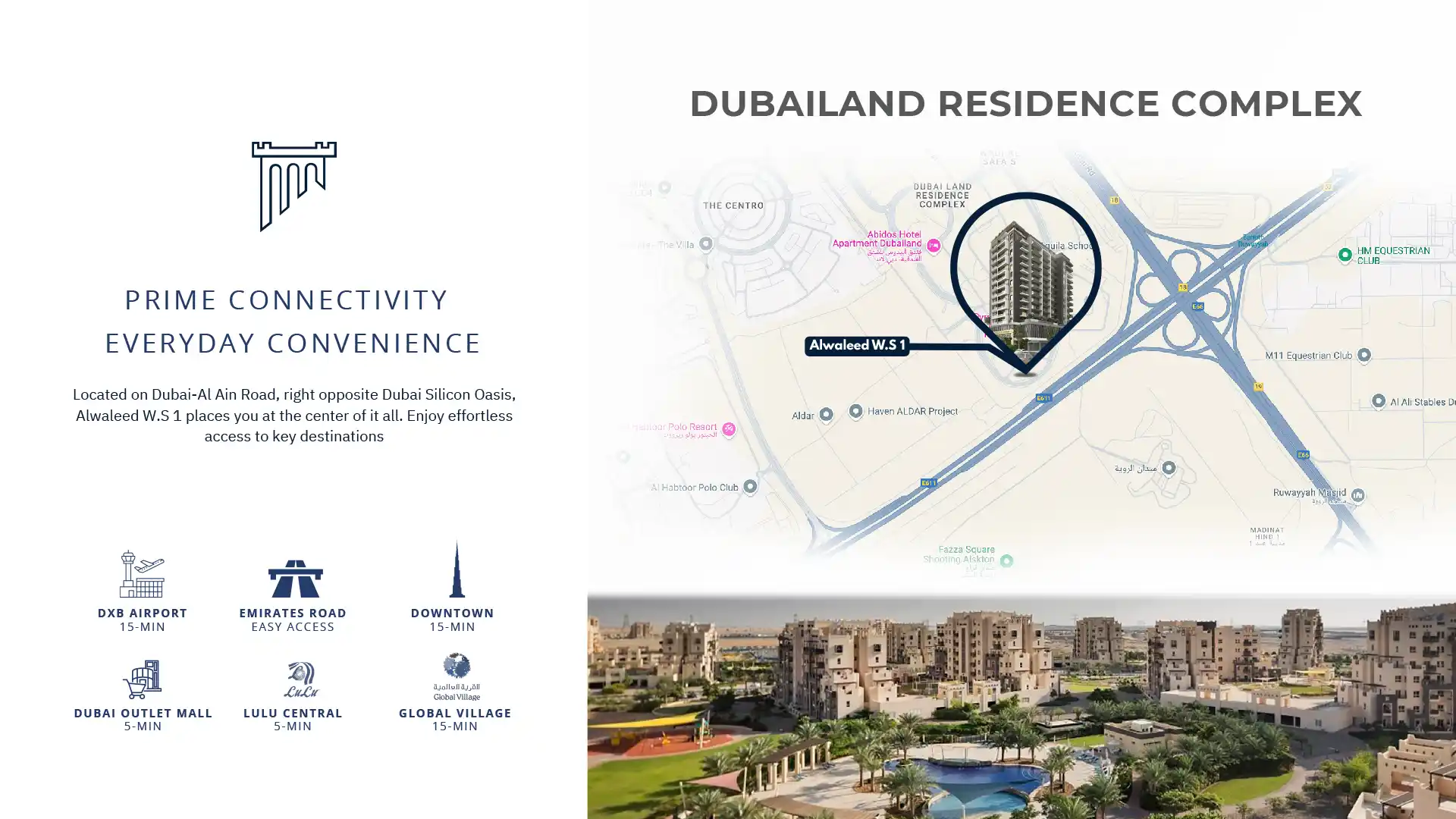- Located on Dubai-Al Ain Road opposite Dubai Silicon Oasis with excellent connectivity across Dubai.