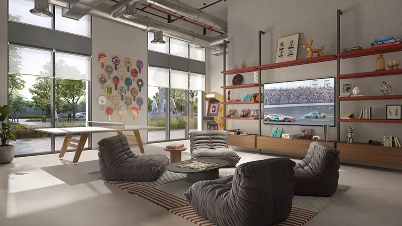 Both amenity and specification strategy are intertwined with that of practices and sustainability. Efficient water fixtures, smart water and energy meters, waste management systems and preferred parking with electric vehicle charging points are all examples of a responsible, future-oriented resource utilization and convenience for residents. Other elements include secure bike parking, extended communal rooms, ample storage options and more. The lobby lounge becomes a warm arrival point and meeting space for residents, whilst building-level amenities have been dedicated to residents so that common amenity spaces feel unique and accessible.