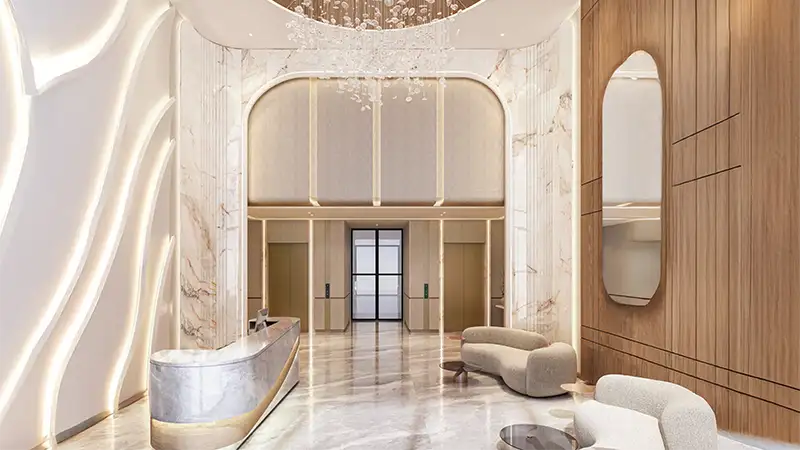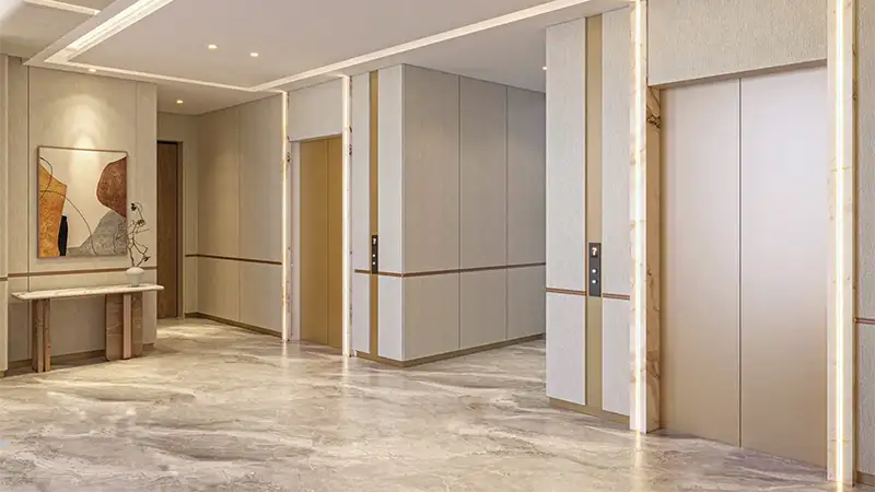 - Featuring a luxurious entrance lobby, designer lift lobbies, fluted wall panels, premium flooring, and sophisticated lighting that set a tone of prestige.