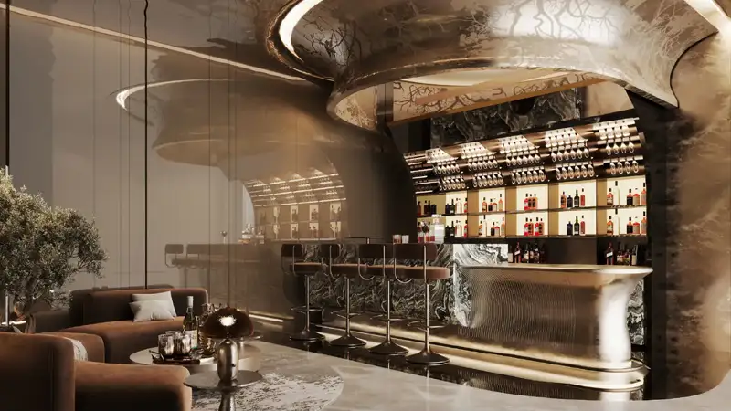 Standing apart with a unique and captivating facade style, this low-rise bespoke innovation boasting a ground, 2 podiums, 10 floors of exquisite homes, and a rooftop. Defined by the meticulously carved lines, huge curves, stretched-out balconies, soft & pastel hues, and gleaming glass exterior, it is an address of extraordinary craftsmanship, style, and functionality. As you enter the grand arrival lobby with concierge, you will be captivated by the rich and elegant layouts, where every opulent element speaks of luxury, smooth finishes, and furnished seating area offer a calm and stunning environment. A business lounge and a cigar lounge on the ground and mezzanine floors are for exclusive professional meetings.
