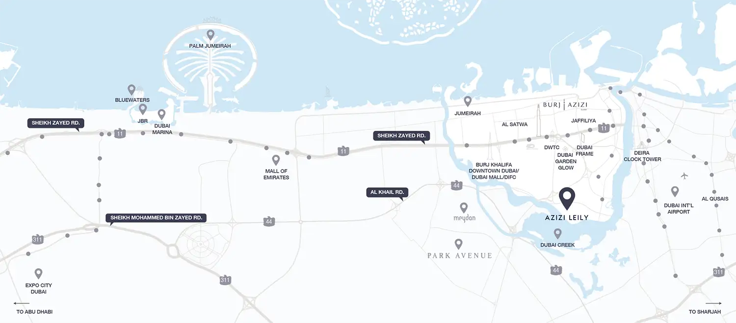 - Seamless access to Sheikh Zayed Road, Al Khail Road, and Creek Metro Station, connecting residents effortlessly to every part of Dubai.