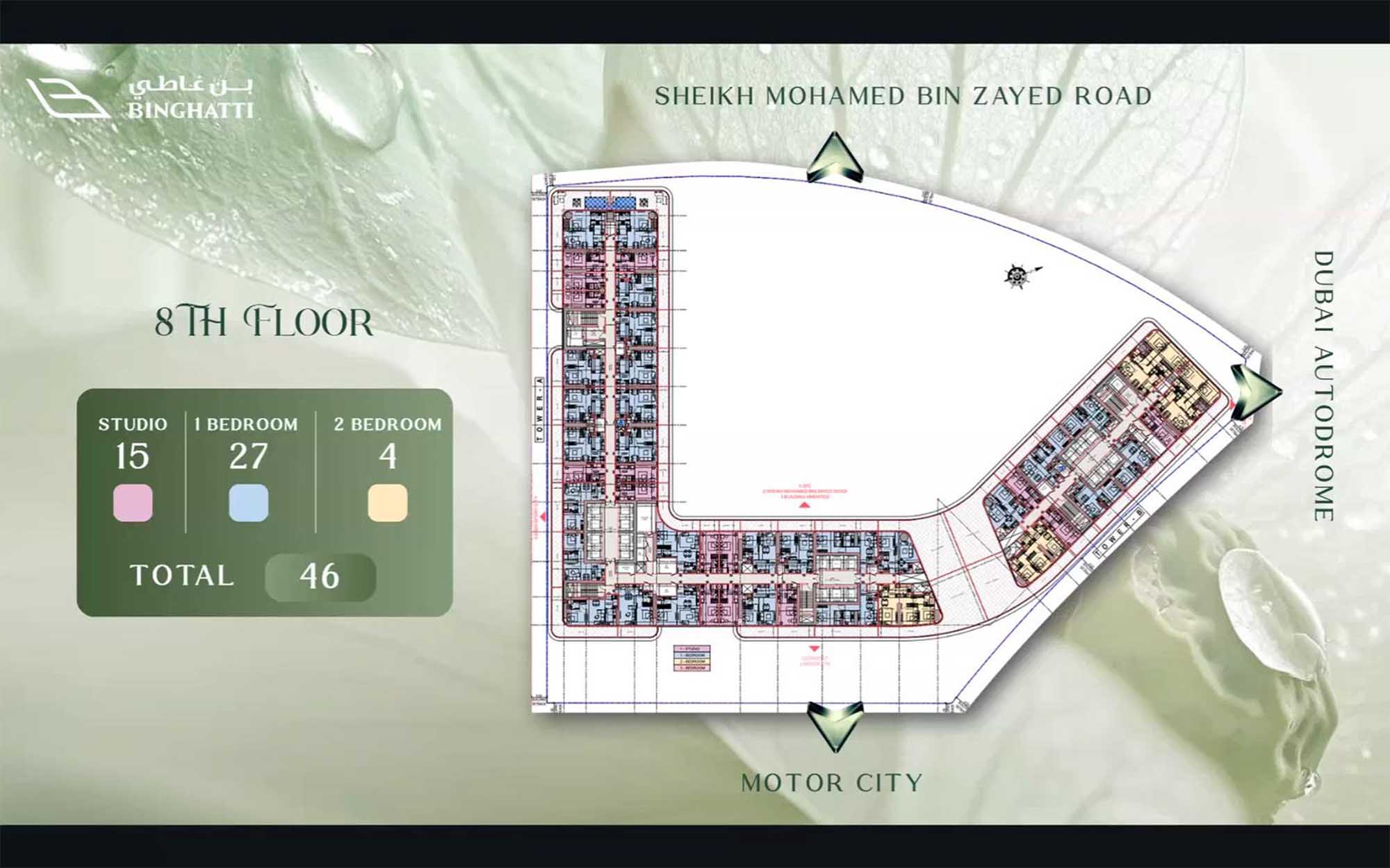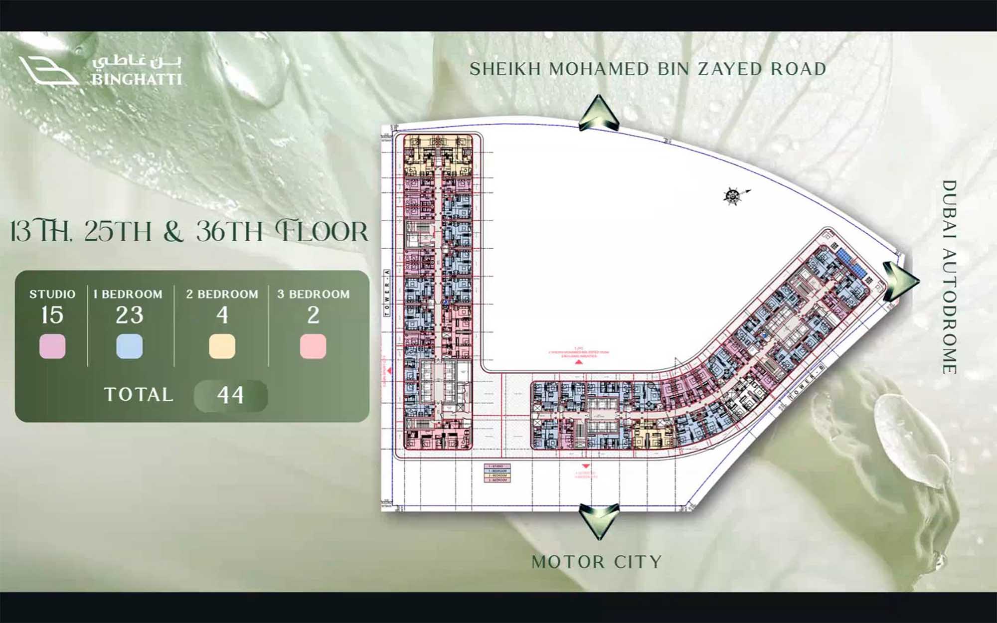 Binghatti Sky Terraces comes with extensive floor plans of studios, 1, 2 and 3-bedroom apartments and royal suites at ease. With premium interiors and classy layouts, or roomy suites and multi bedroom, and each is designed to have a maximum number of views and daylight. Terraced units have exclusive outdoor areas which expand living areas and central cores contain lifts and services so as to preserve usable footprints. The podium levels also include retail, parking and communal amenities designed in a manner that establishes clear wayfinding and privacy areas.