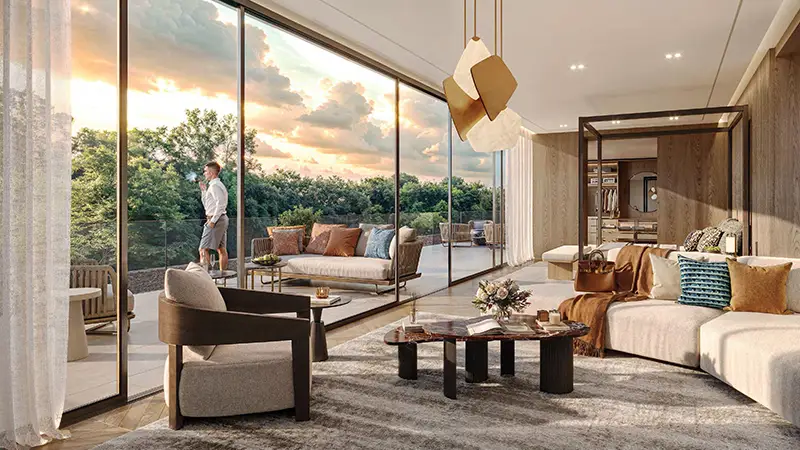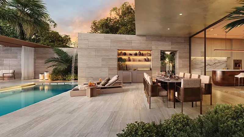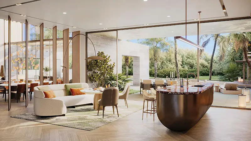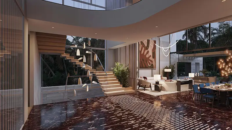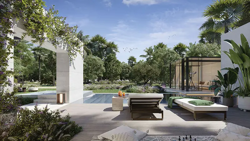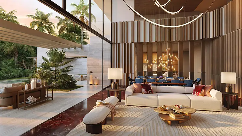 This cluster is the last residential project of the exceptional Tilal Al Ghaf community that features only 13 unique mansions. Here, each unit is rising exquisitely overlooking the lanai Islands. The captivating architecture of all homes is designed by a well-known awarded team of Nabil Gholam architects. A poolside retreat in every home sit in the private garden, which is quickly accessible from the mansion via floor-to-ceiling windows that form the effortless access between the serene rooms and the panoramic surroundings.