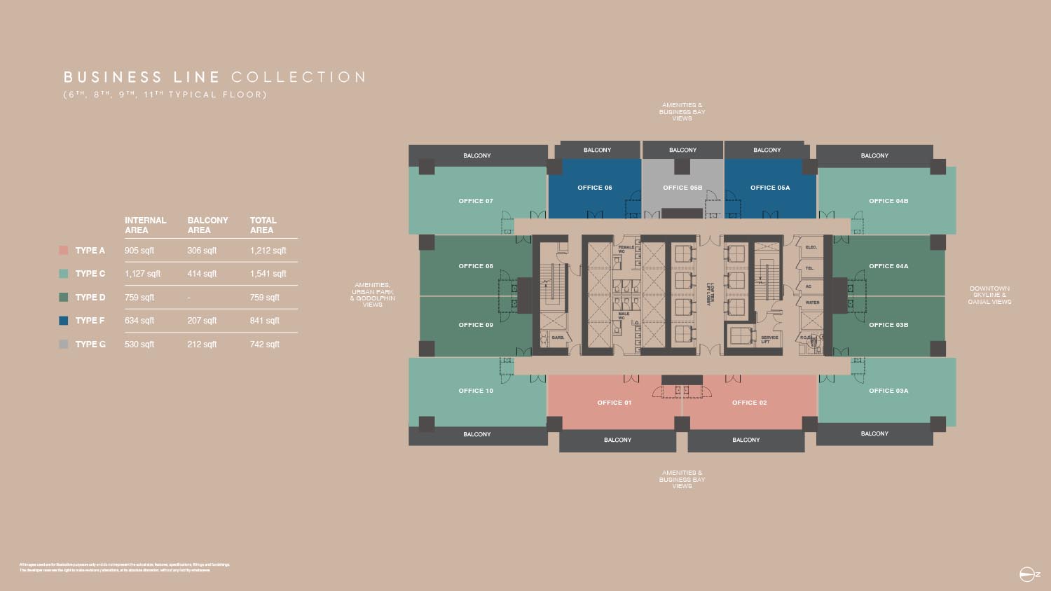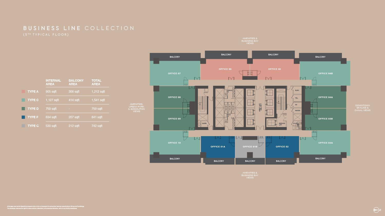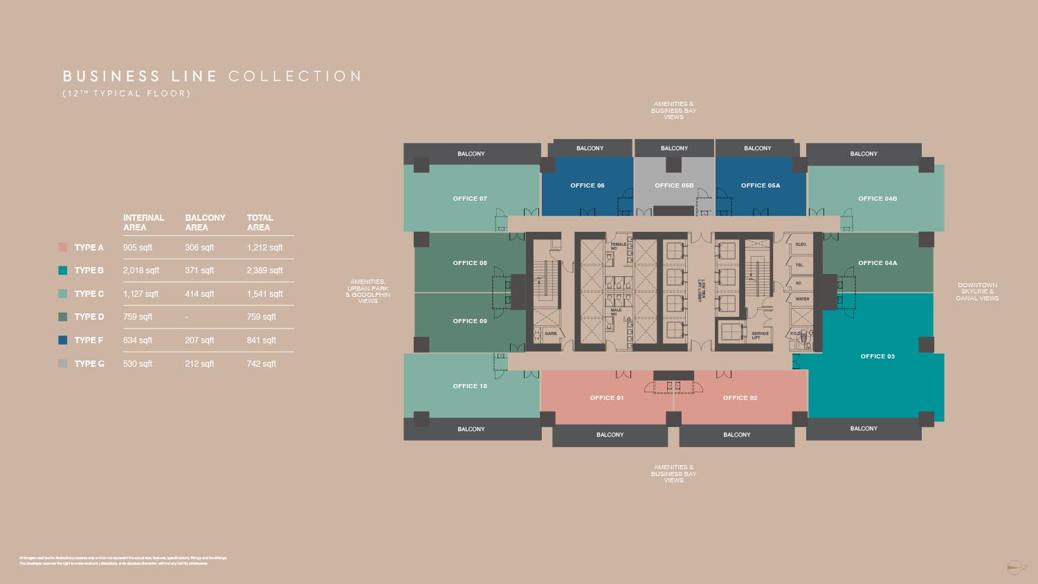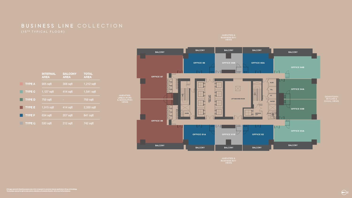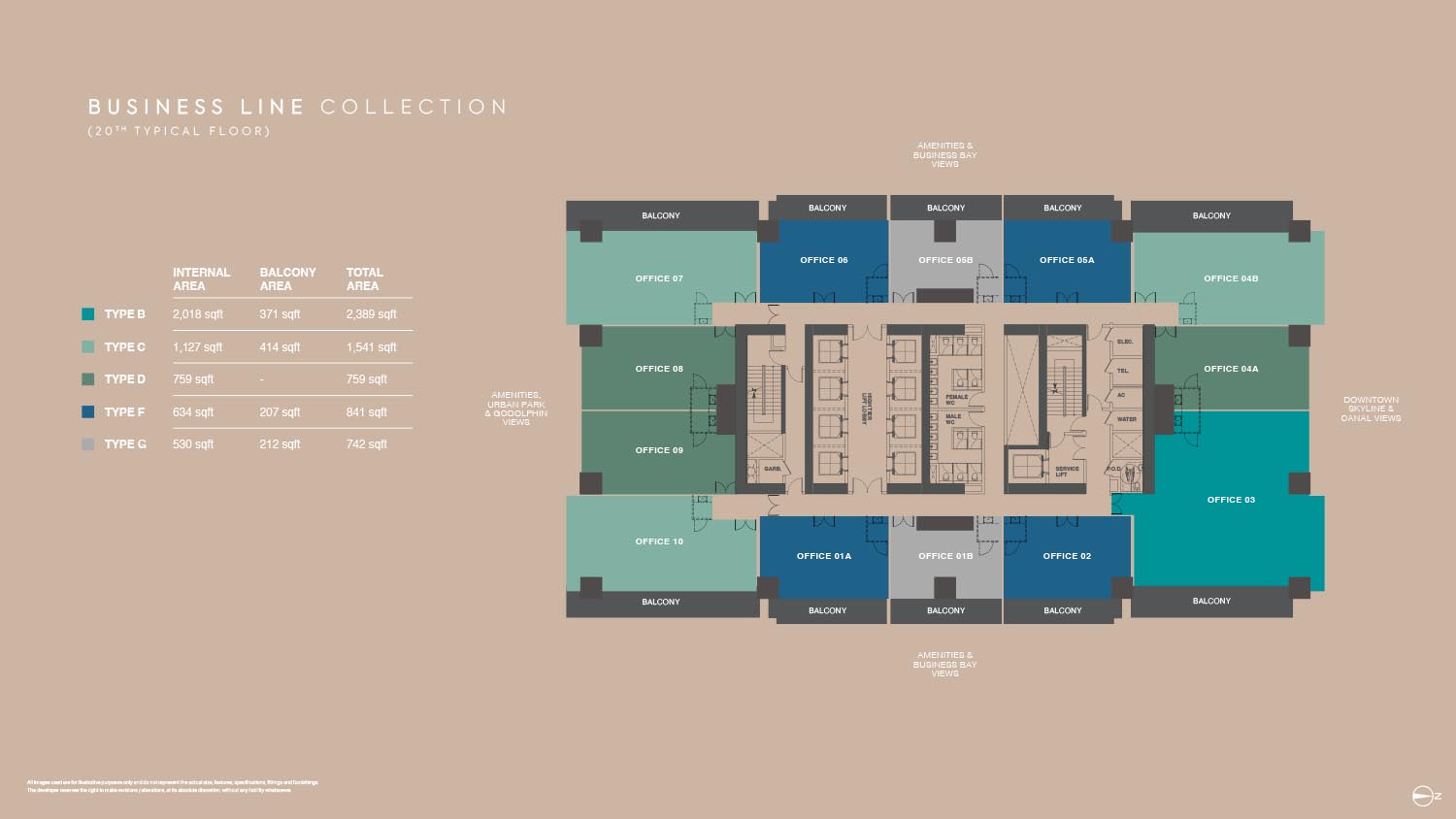 The floor plans of Burj Capital Phase 3 are smartly made to suit many business needs. The development provides a broad range of office layouts in a variety of sizes with flexible office designs between small-fraction units and large-scale enterprise offices. Each unit will have a maximized use space but with a circulation efficient space and a maximum amount of natural lighting. Individual offices have private balconies, panoramic view of Dubai skyline, canal and city park. The layouts are divided into various types that enable the businesses to select the spaces that fit their operation requirements.