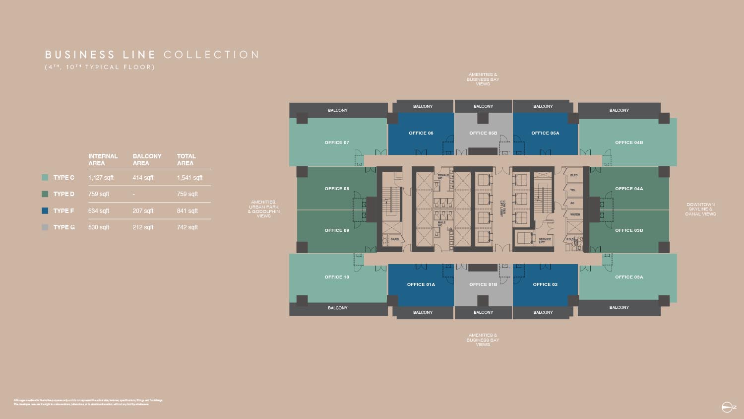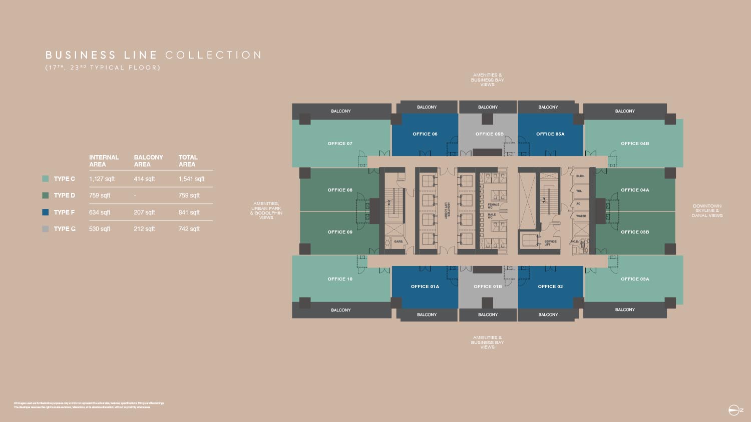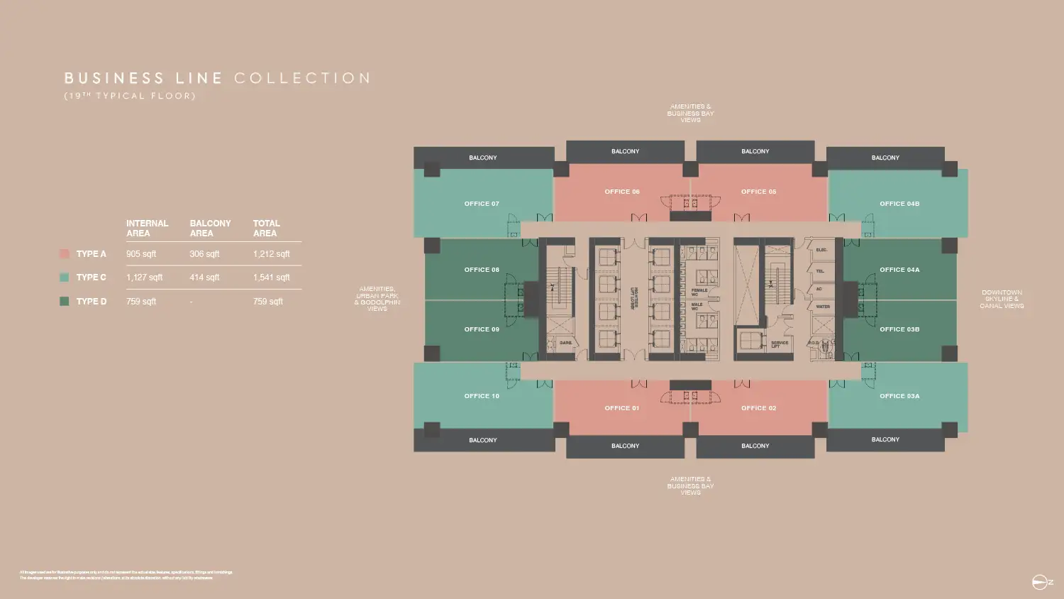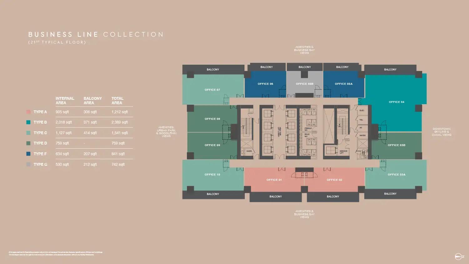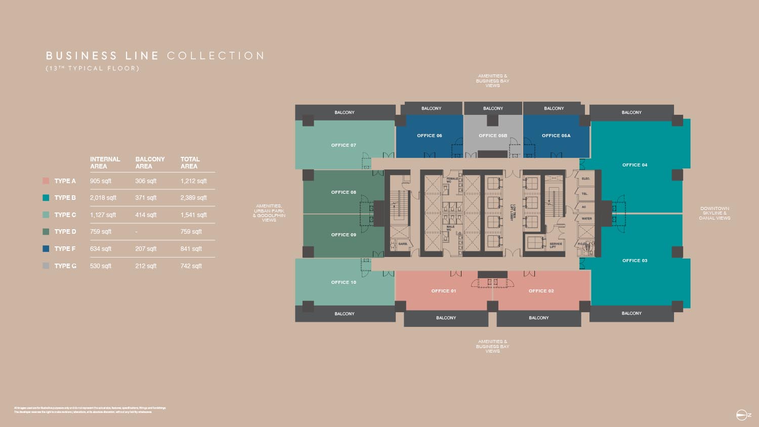 The floor plans of Burj Capital Phase 3 are smartly made to suit many business needs. The development provides a broad range of office layouts in a variety of sizes with flexible office designs between small-fraction units and large-scale enterprise offices. Each unit will have a maximized use space but with a circulation efficient space and a maximum amount of natural lighting. Individual offices have private balconies, panoramic view of Dubai skyline, canal and city park. The layouts are divided into various types that enable the businesses to select the spaces that fit their operation requirements.