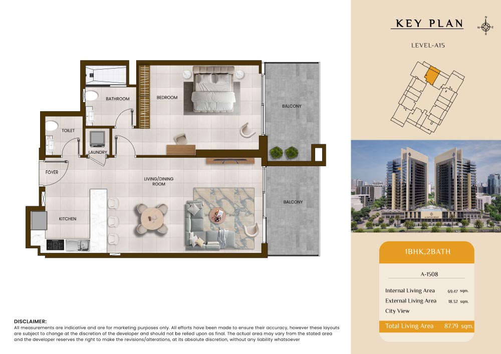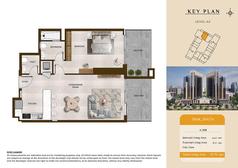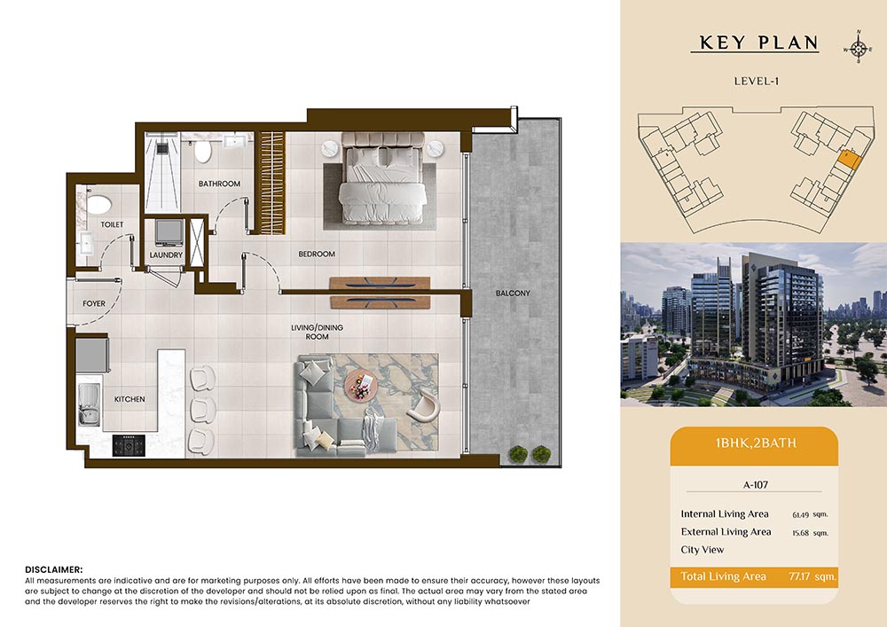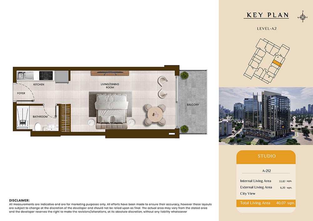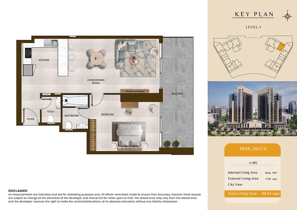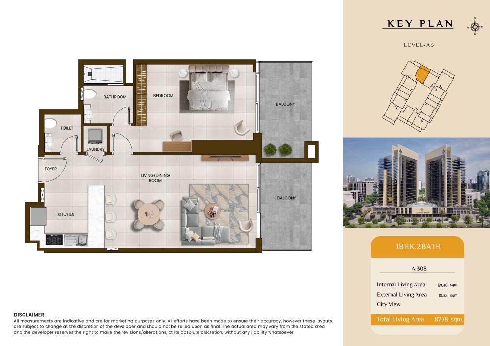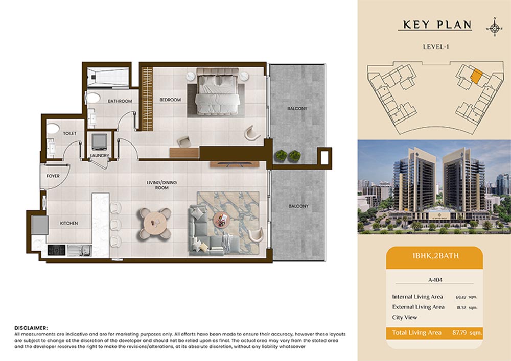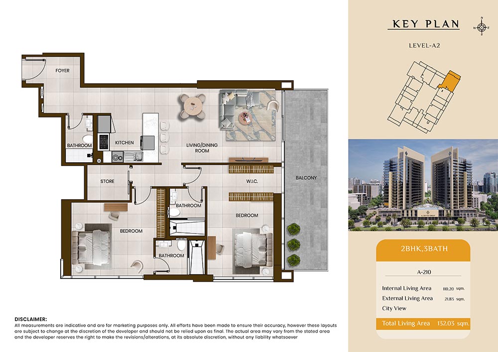 Butterfly Towers embodies a creative approach to design within this twin-towers project that offers functional floor plans within studios to 2-bedroom apartments. Each tower offers 17 residential floors and a total 570 units with 26 retail spaces. Each residence is recognised by high ceilings, and windows of the same heights, dynamic layouts with warm and modern minimalist themes. All the bedrooms feature MDF with wood grain melamine and drawers with white powder-coated finishes for a clear and stylish look. The open design of kitchens features integrated appliances and Colonia white countertop for hassle-free cooking experiences.