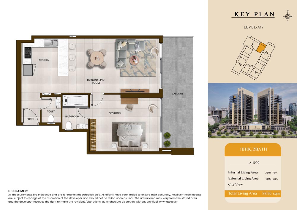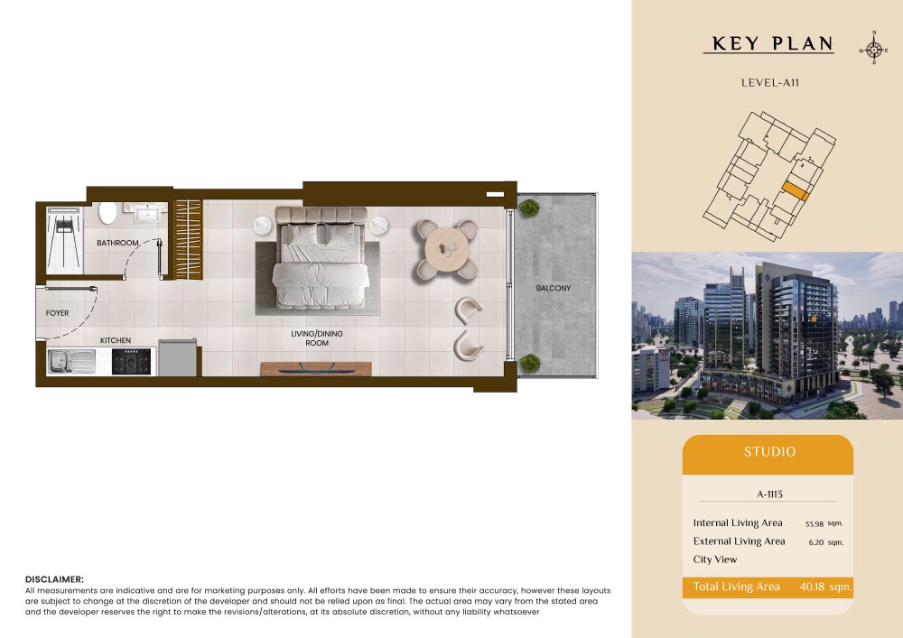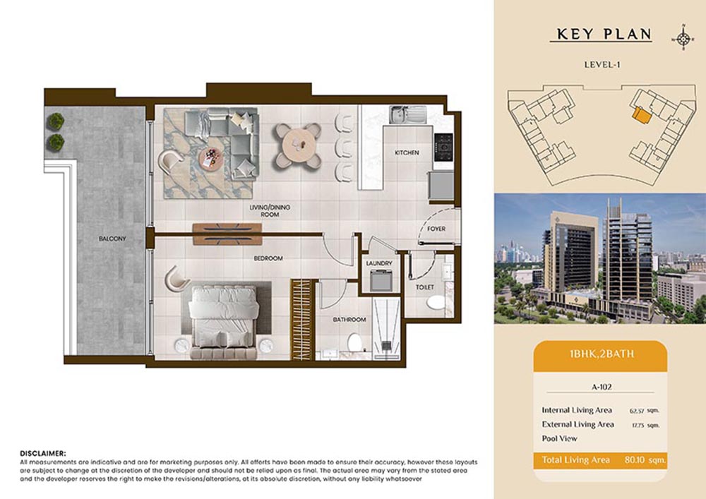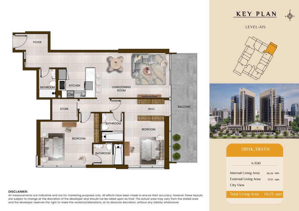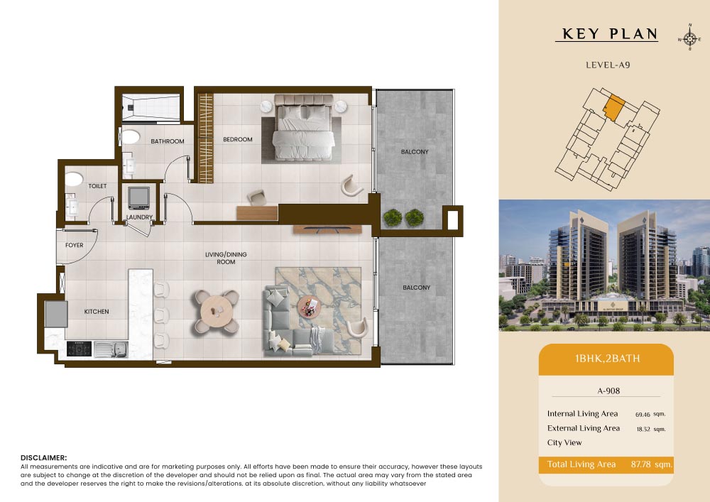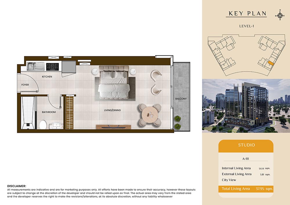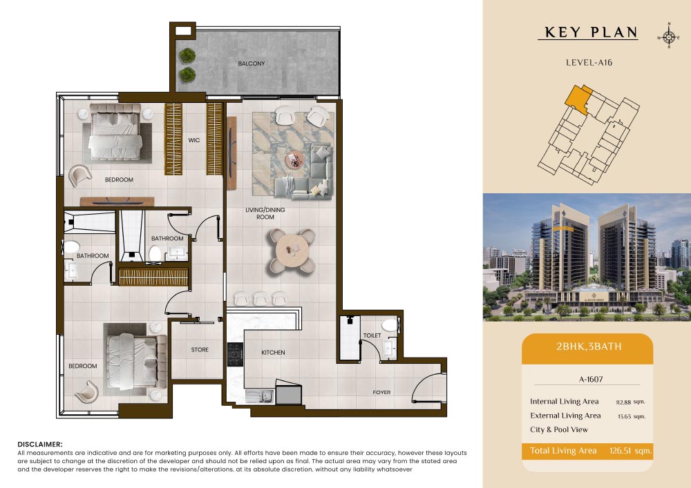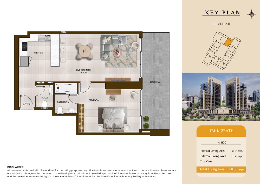 Butterfly Towers embodies a creative approach to design within this twin-towers project that offers functional floor plans within studios to 2-bedroom apartments. Each tower offers 17 residential floors and a total 570 units with 26 retail spaces. Each residence is recognised by high ceilings, and windows of the same heights, dynamic layouts with warm and modern minimalist themes. All the bedrooms feature MDF with wood grain melamine and drawers with white powder-coated finishes for a clear and stylish look. The open design of kitchens features integrated appliances and Colonia white countertop for hassle-free cooking experiences.