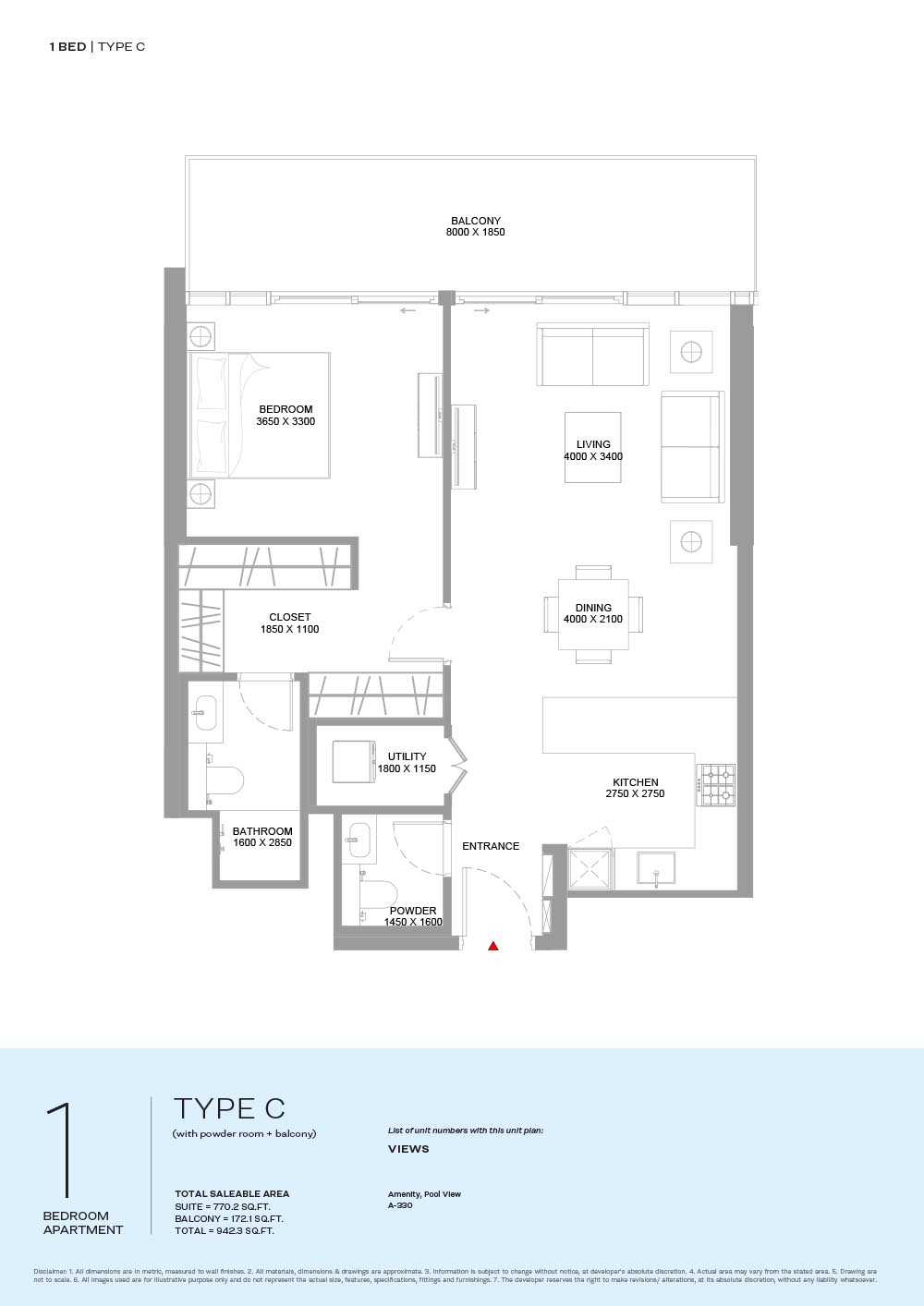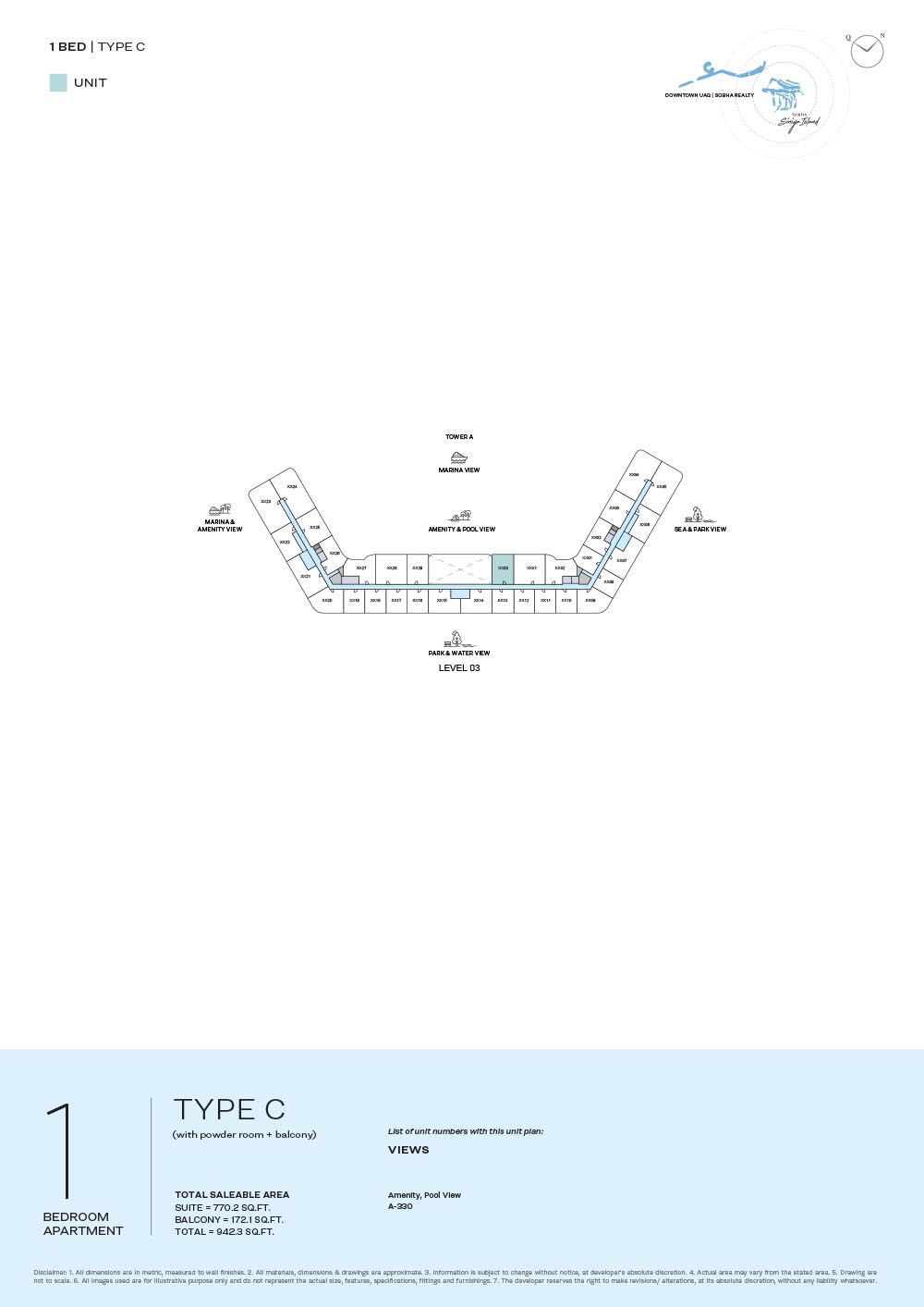 | Tower A | 1 Bedroom | 03rd Level (Type C) | 942.30 Sq Ft | Click Here |
