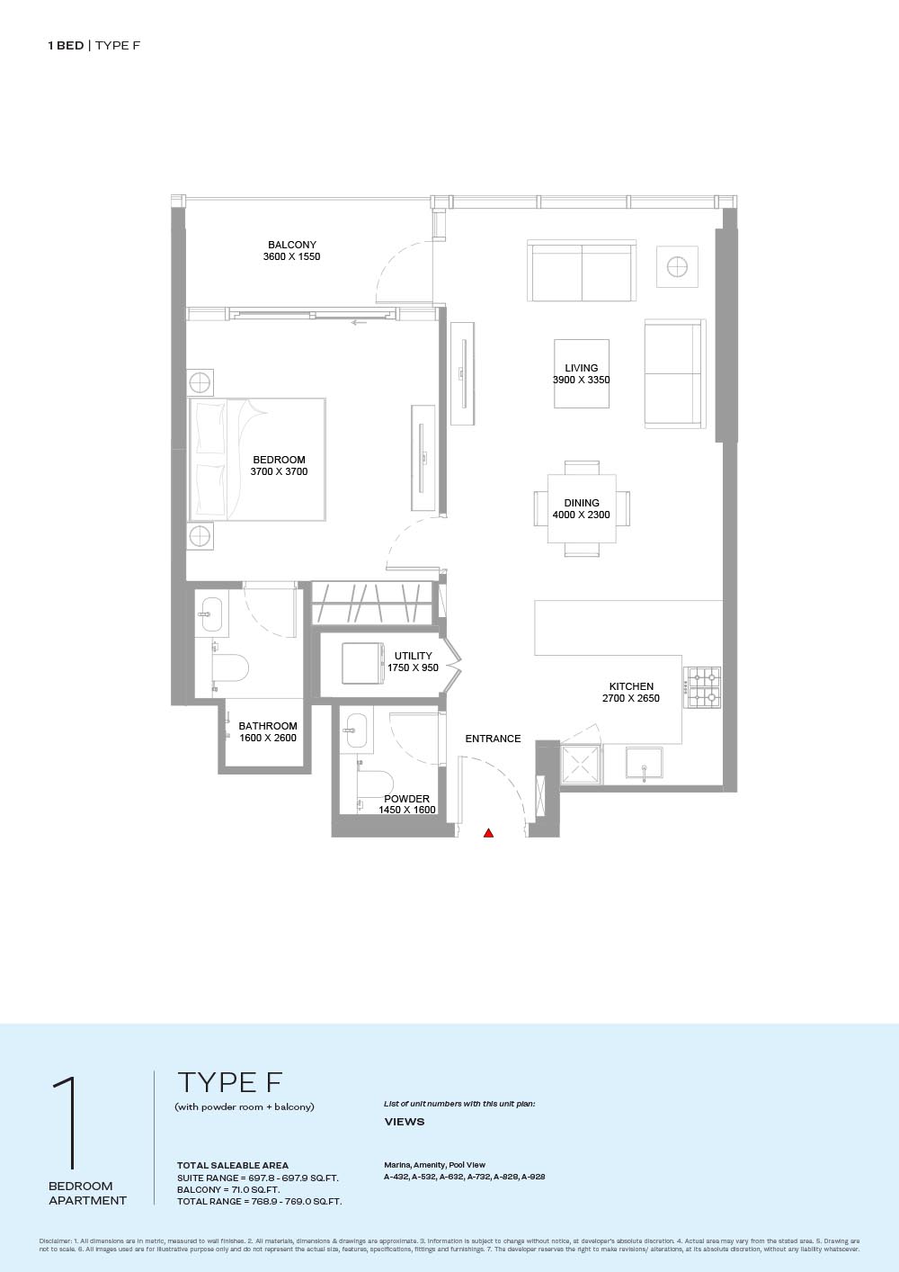 | Tower A | 1 Bedroom | 04th-09th Level (Type F) | 769.00 Sq Ft | Click Here |