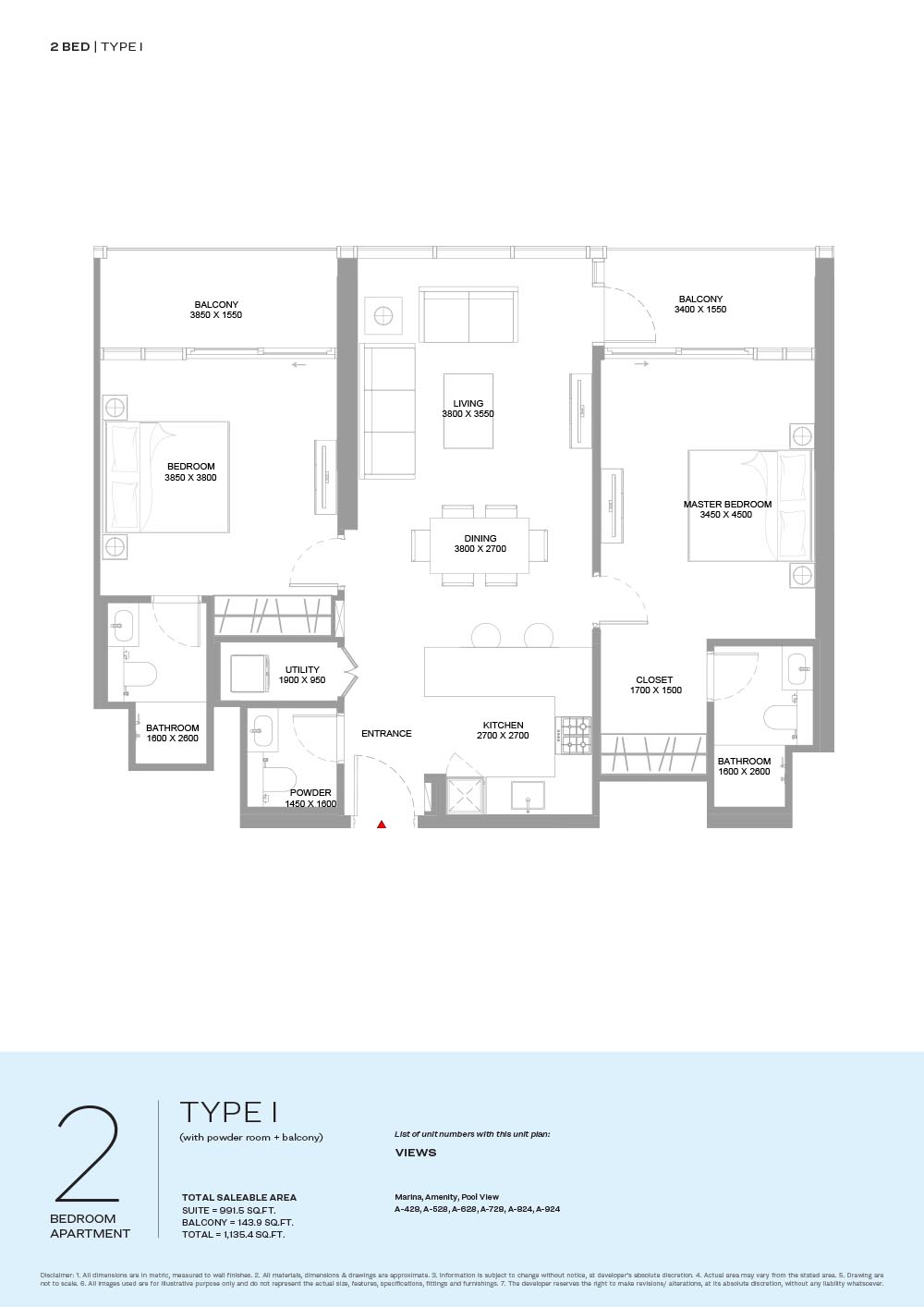 | Tower A | 2 Bedrooms | 08th & 09th Level (Type I) | 1135.40 Sq Ft | Click Here |