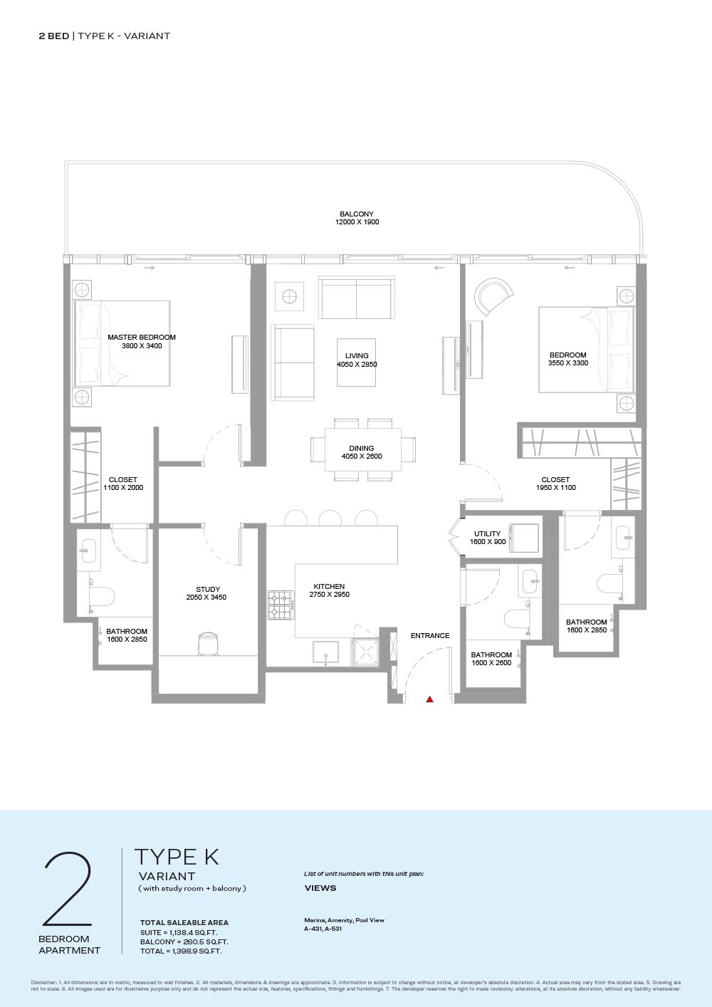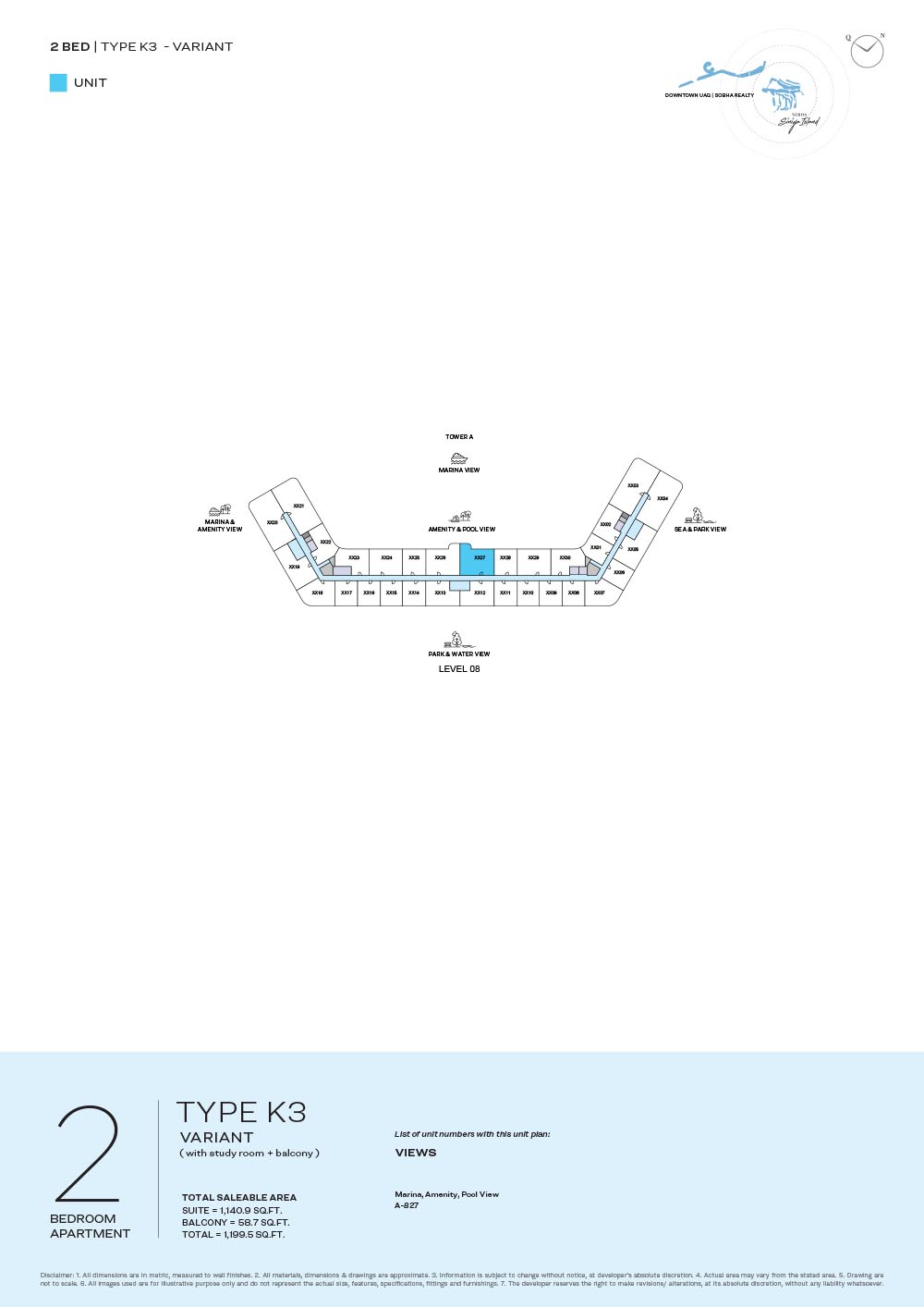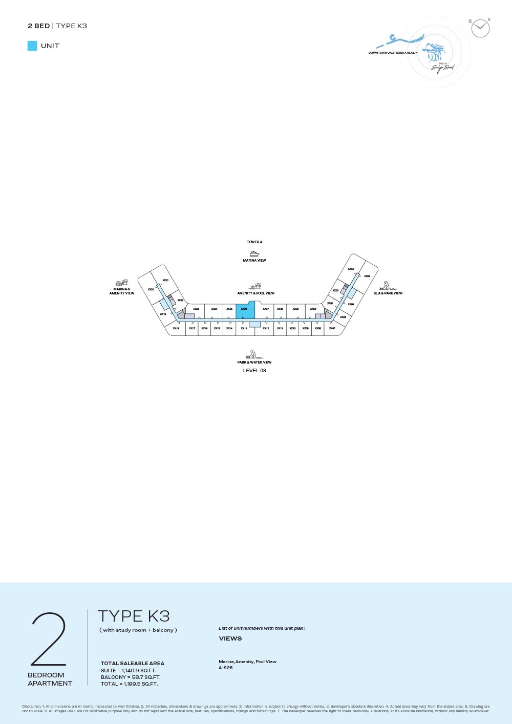 | Tower A | 2 Bedrooms + Study | 08th Level (Type K3) | 1199.50 Sq Ft | Click Here |