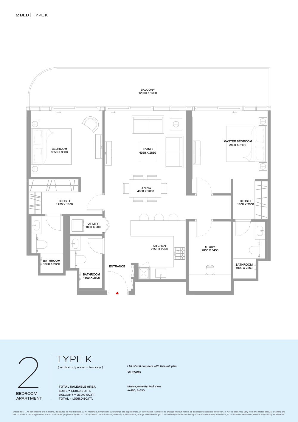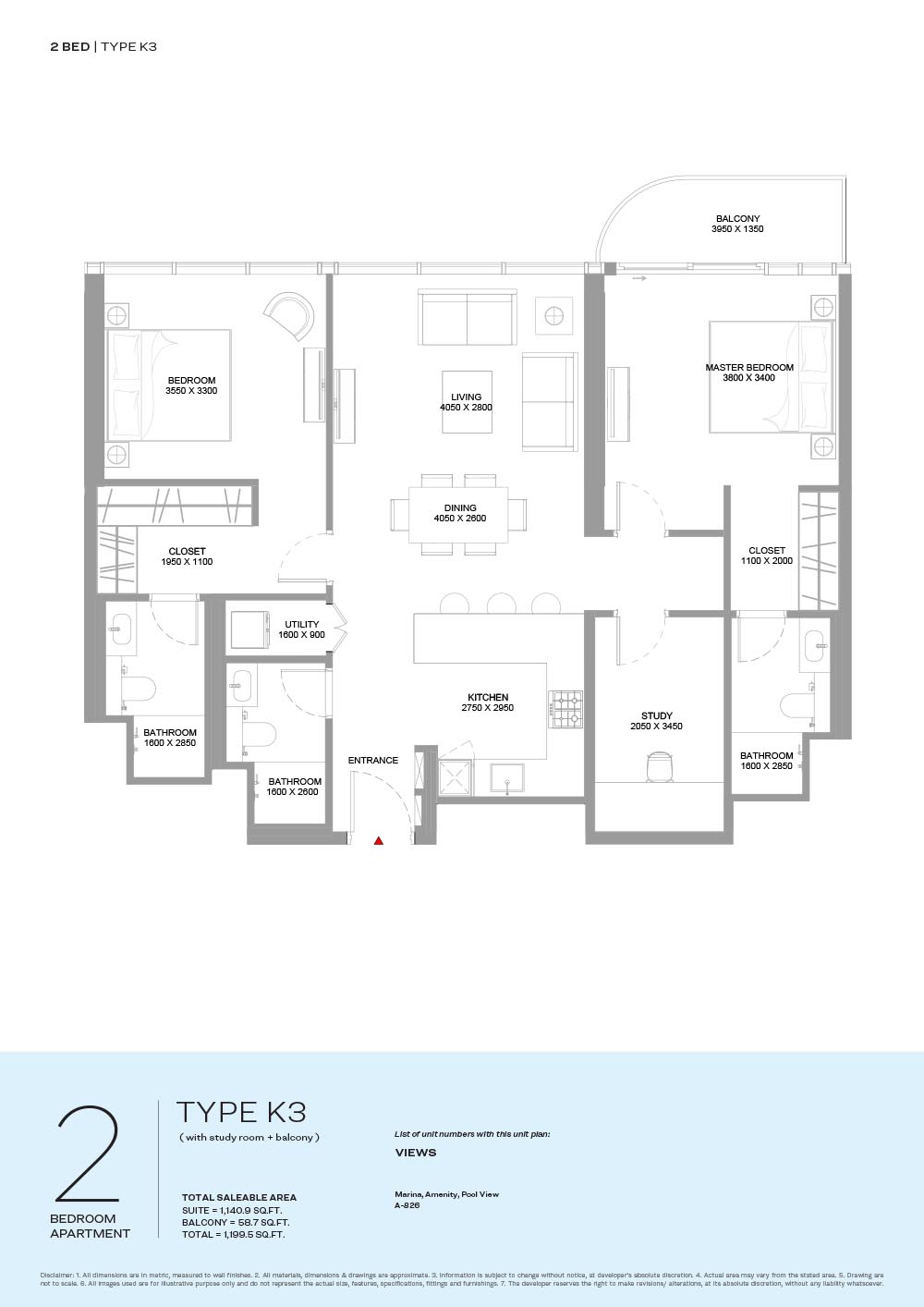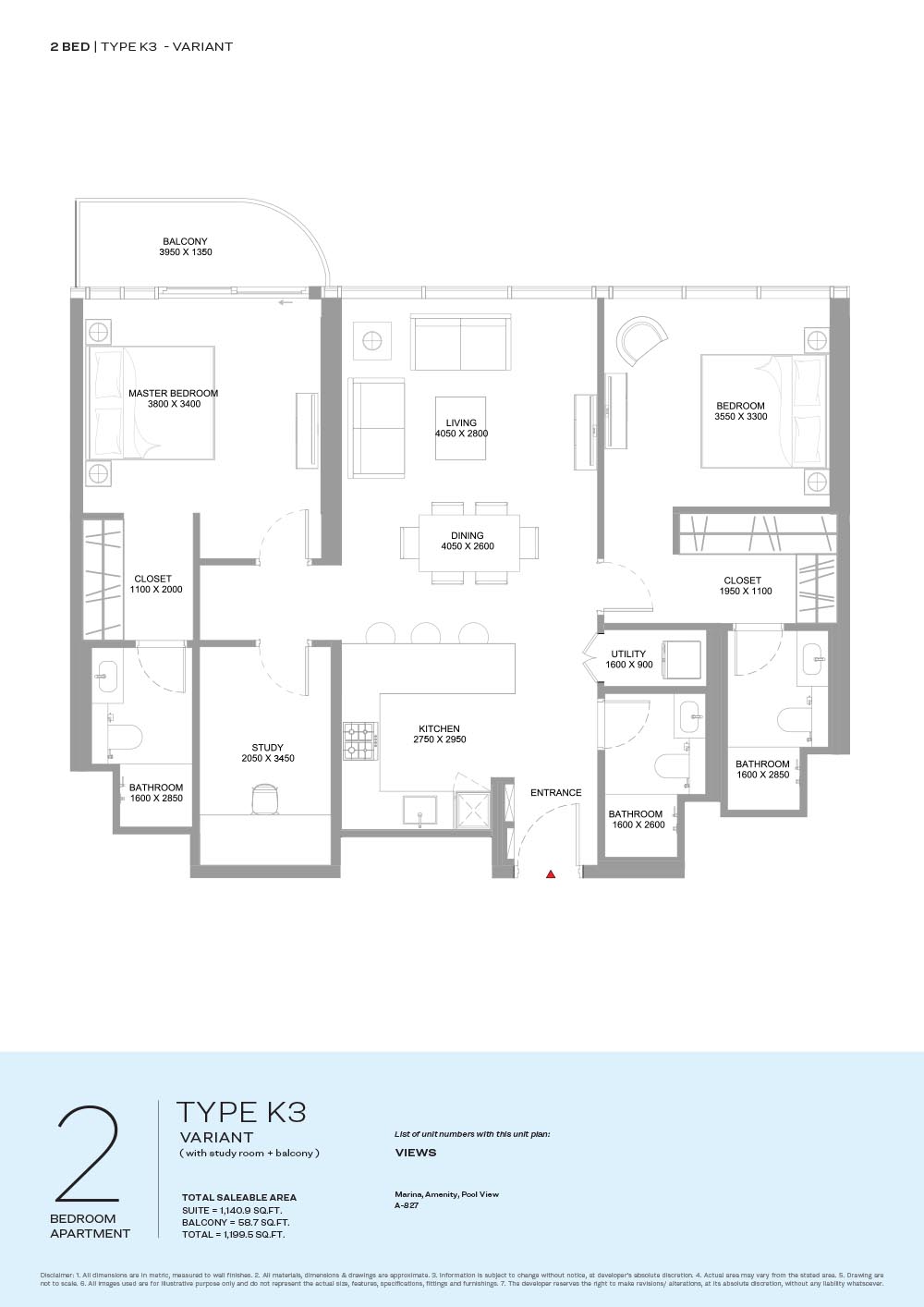 | Tower A | 2 Bedrooms + Study | 08th Level (Type K3) | 1199.50 Sq Ft | Click Here |