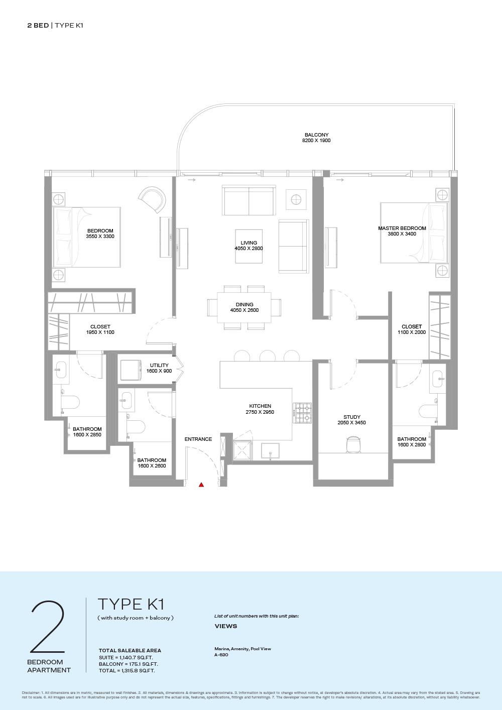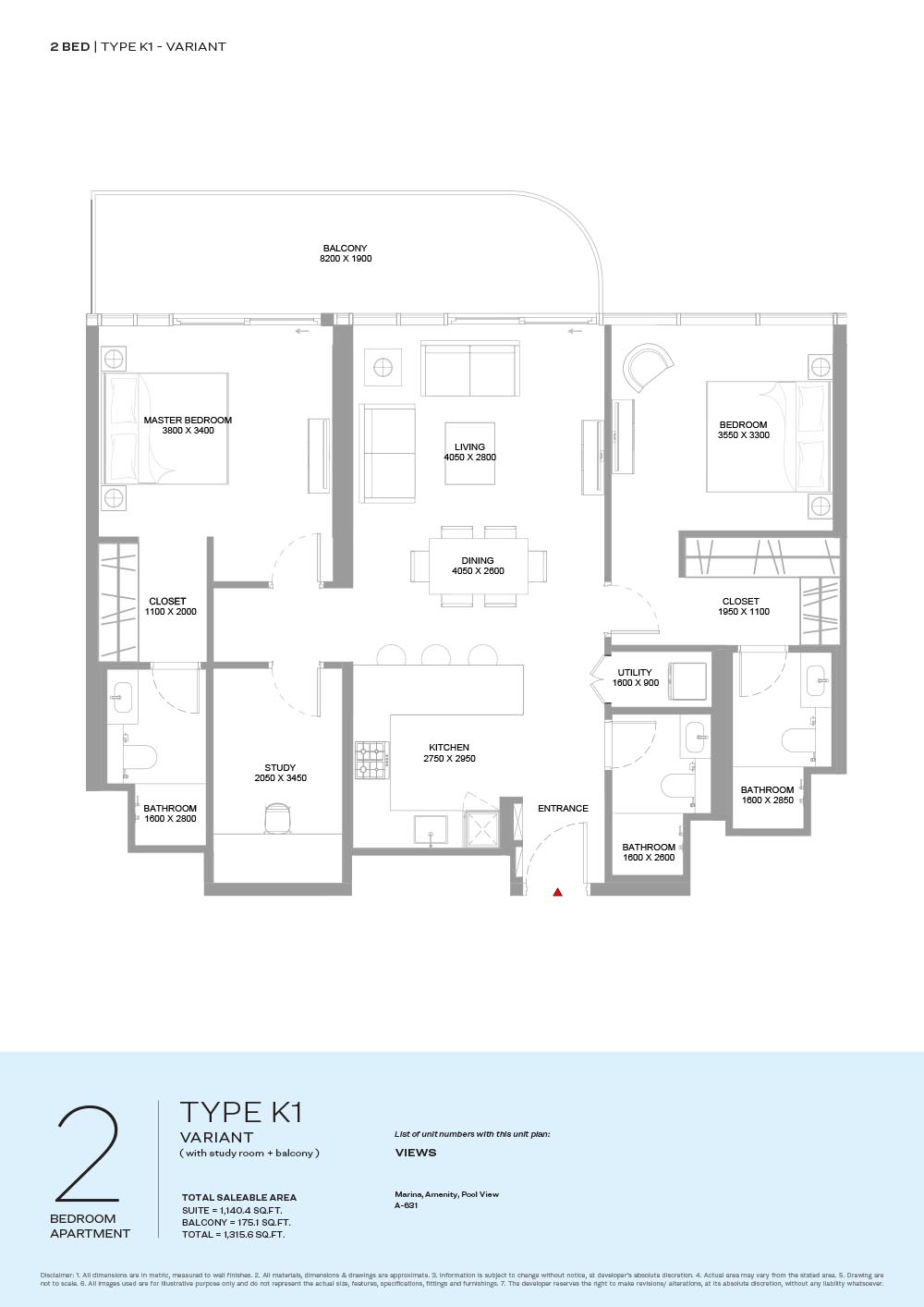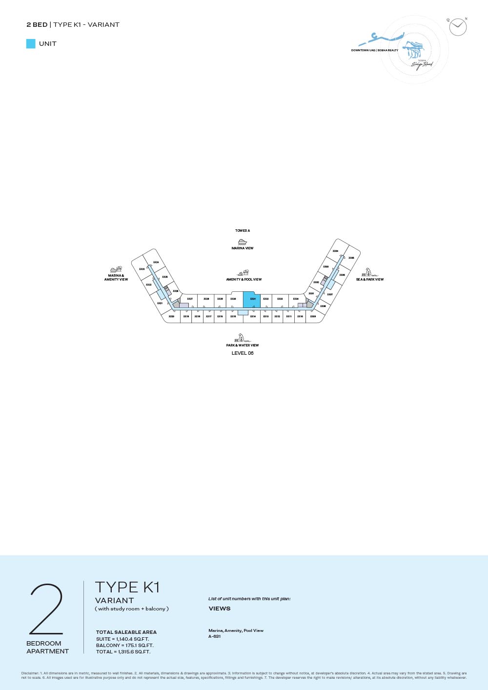| Tower A | 2 Bedrooms + Study | 06th Level (Type K1-Variant) | 1315.60 Sq Ft | Click Here |