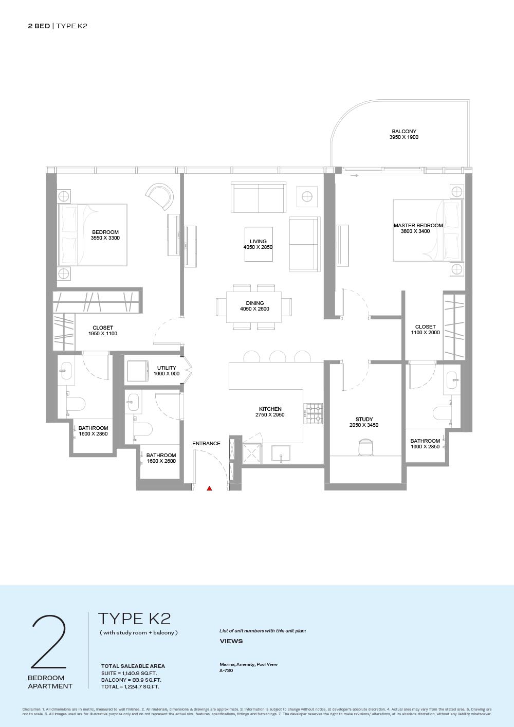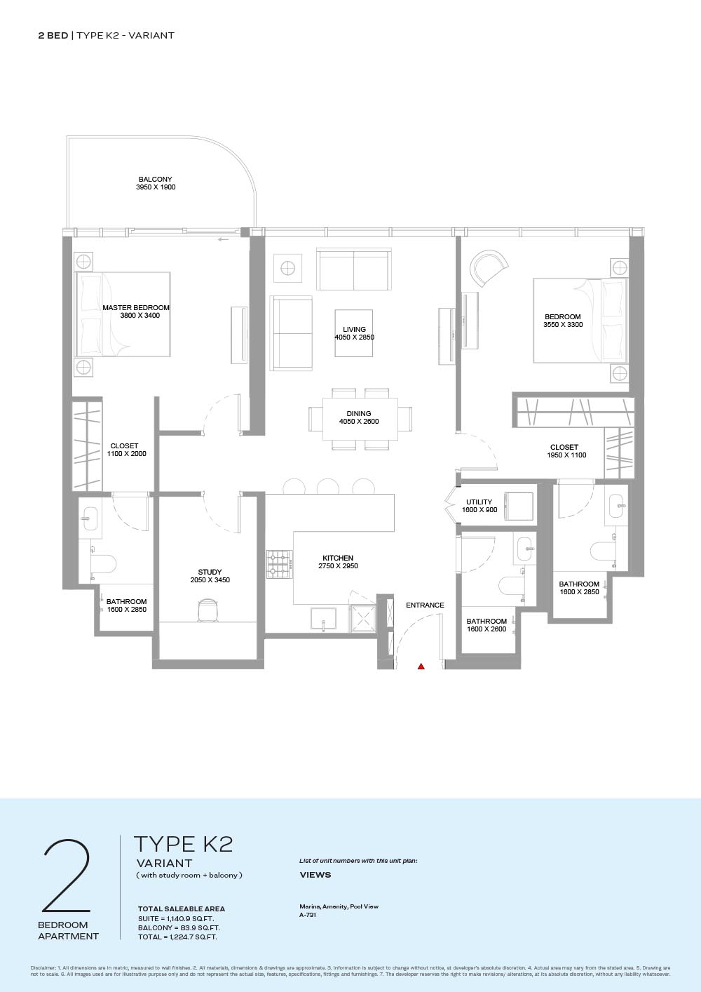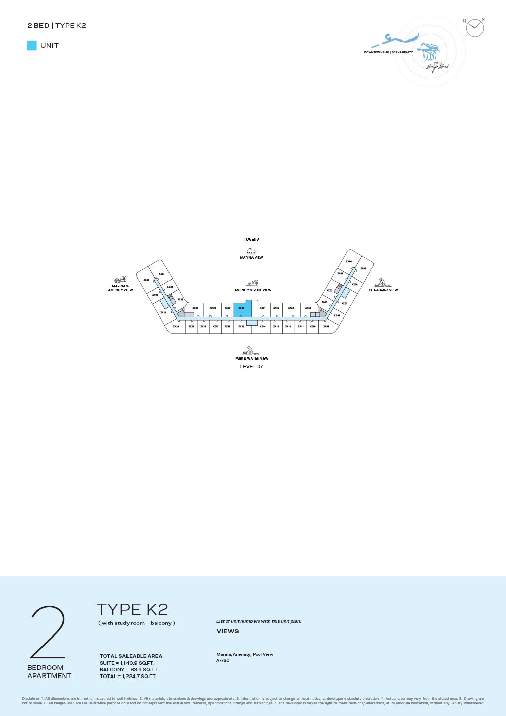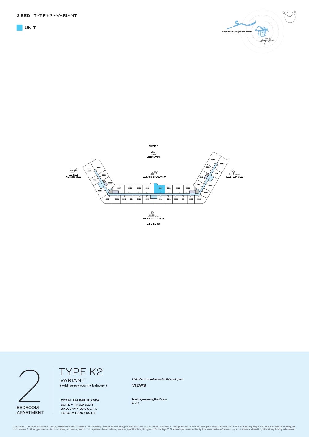 | Tower A | 2 Bedrooms + Study | 07th Level (Type K2-Variant) | 1224.70 Sq Ft | Click Here |
