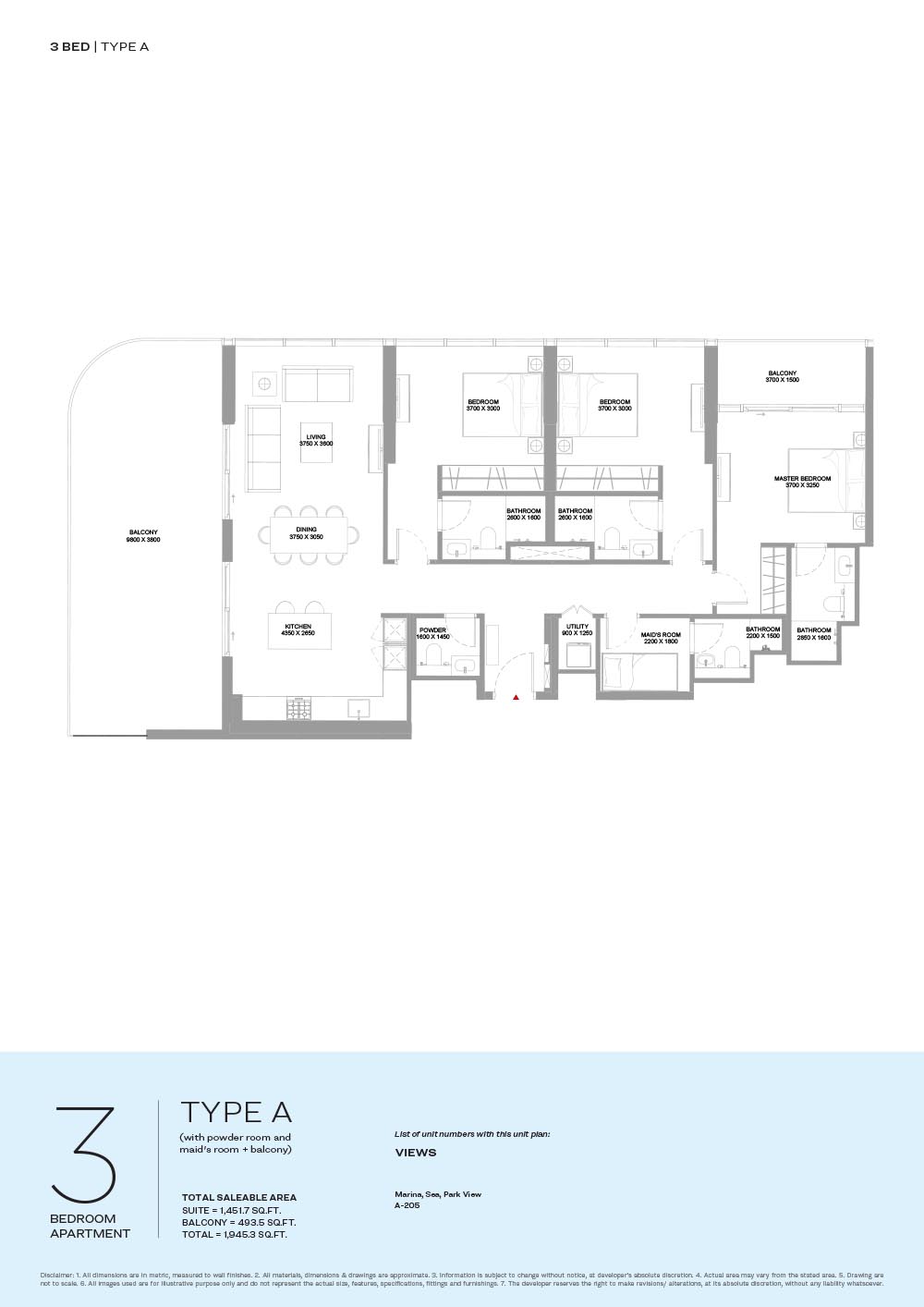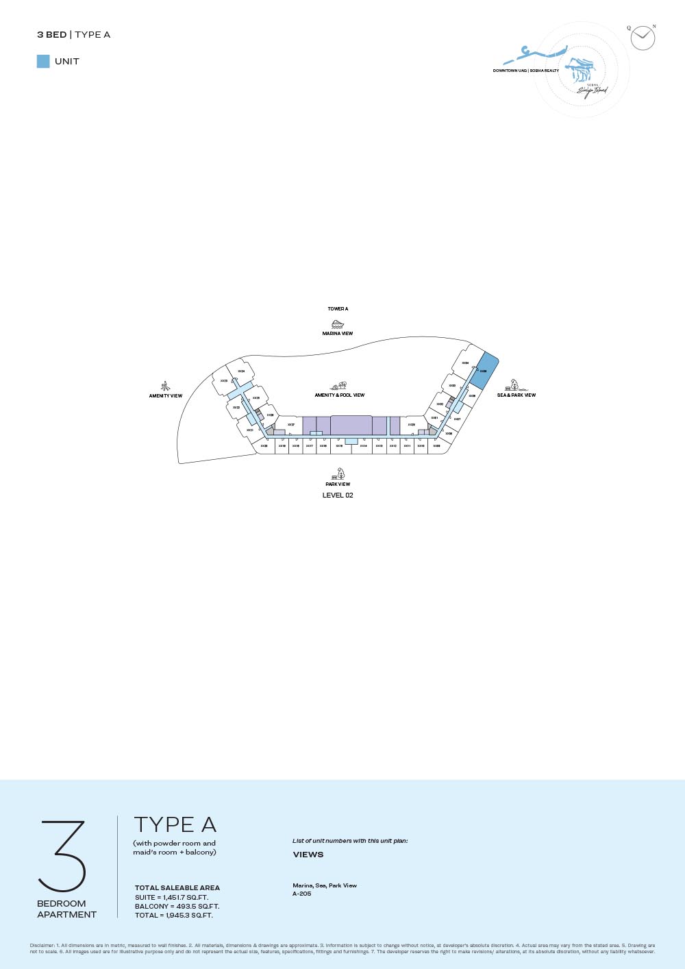 | Tower A | 3 Bedrooms + Maid | 02nd Level (Type A) | 1945.30 Sq Ft | Click Here |
