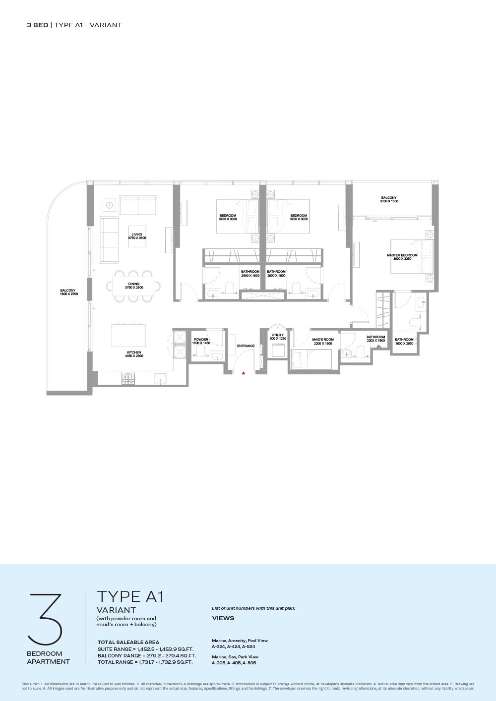 | Tower A | 3 Bedrooms + Maid | 03rd-05th Level (Type A1-Variant) | 1732.90 Sq Ft | Click Here |