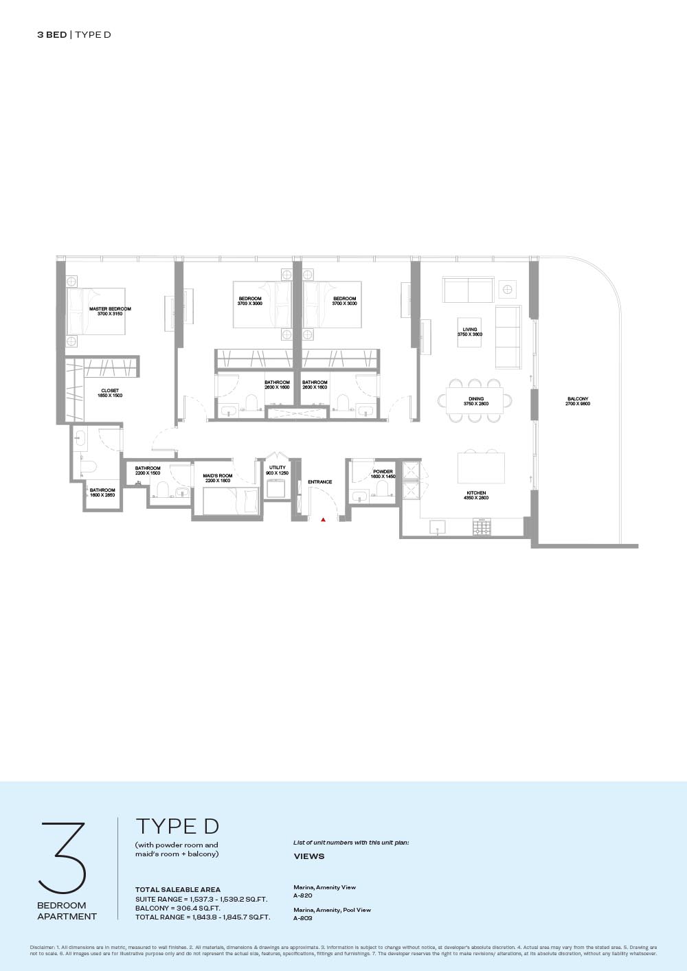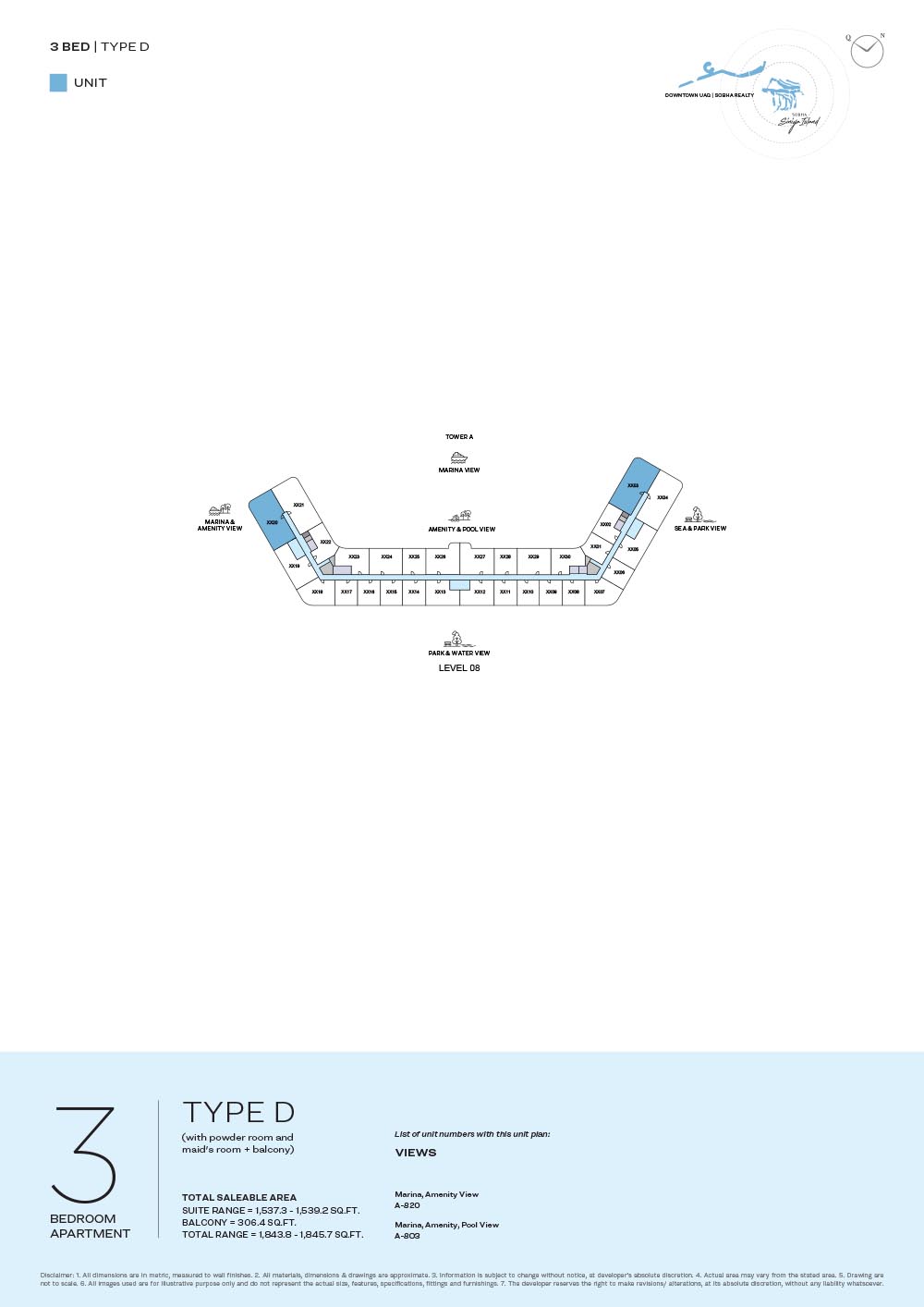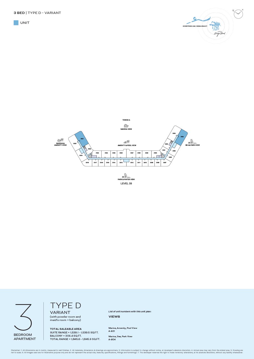| Tower A | 3 Bedrooms + Maid | 08th Level (Type D) | 1845.70 Sq Ft | Click Here |