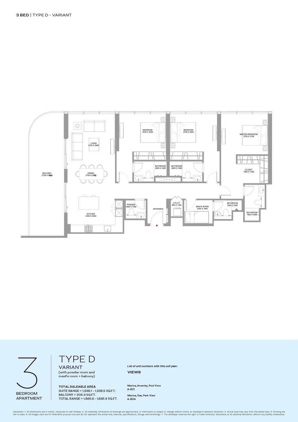 | Tower A | 3 Bedrooms + Maid | 08th Level (Type D-Variant) | 1845.90 Sq Ft | Click Here |