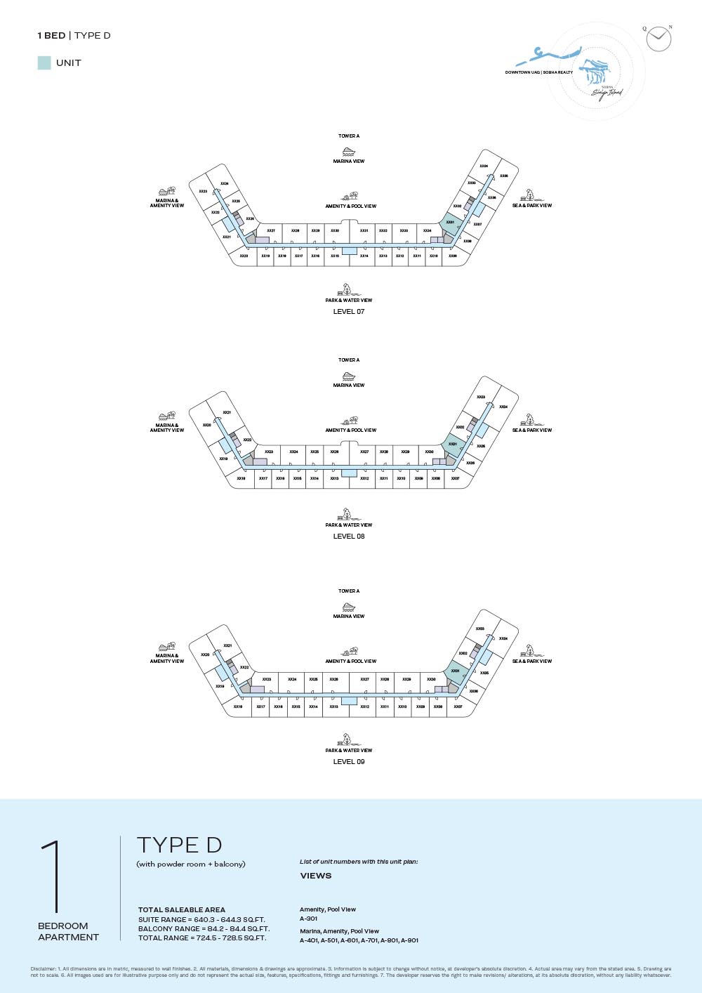 | Tower A | 1 Bedroom | 07th-09th Level (Type D) | 728.50 Sq Ft | Click Here |