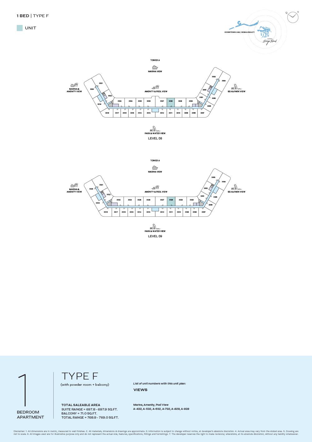 | Tower A | 1 Bedroom | 08th & 09th Level (Type F) | 769.00 Sq Ft | Click Here |
