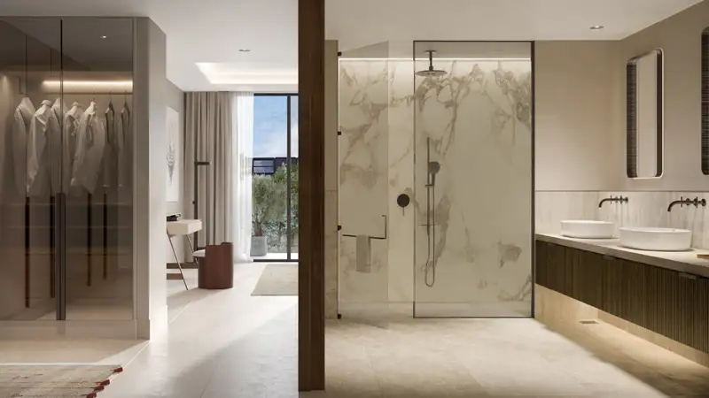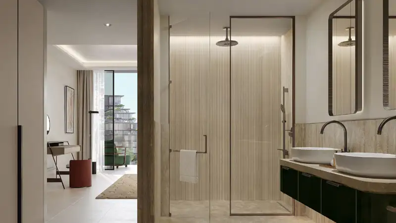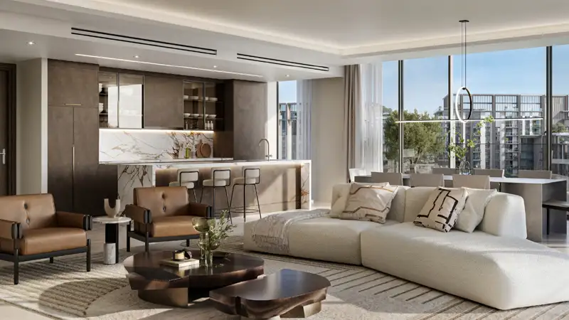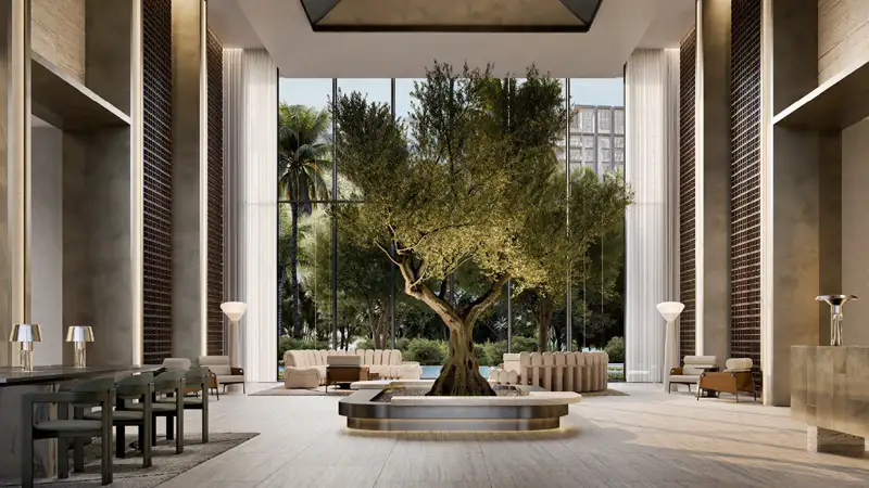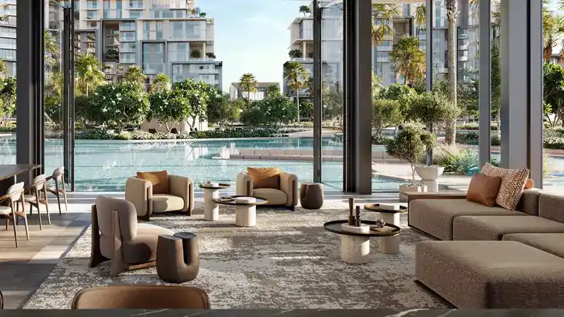 Here, you will be welcomed to the fine drop-off area with scenic greenery and a bespoke pathway with an essence of grandeur that sets a refined and alluring tone. The stunning double-height entrance lobby promises a bold statement of luxury with a glass-made open front, furnished area, cutting-edge elements and features with expensive finishes. All the apartments are either park-facing or waterside units, complemented by carefully designed interiors. The Kitchens are defined by sleek style and practical layouts, crafted with quality materials, while all the calm and grand bedrooms have walk-in closets that are perfect for both convenience and opulence. With something extraordinary, the grand homes offer double-height living areas and private terraces. The seamless access to the landscaped park and amazing water views eliminates the limits between private indoor and natural outdoor spaces.