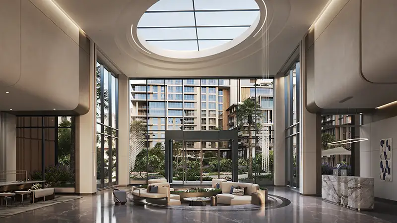 - Double-height lobby entrances framed by lush greenery and reflective water elements, setting a sophisticated tone from the moment you arrive.