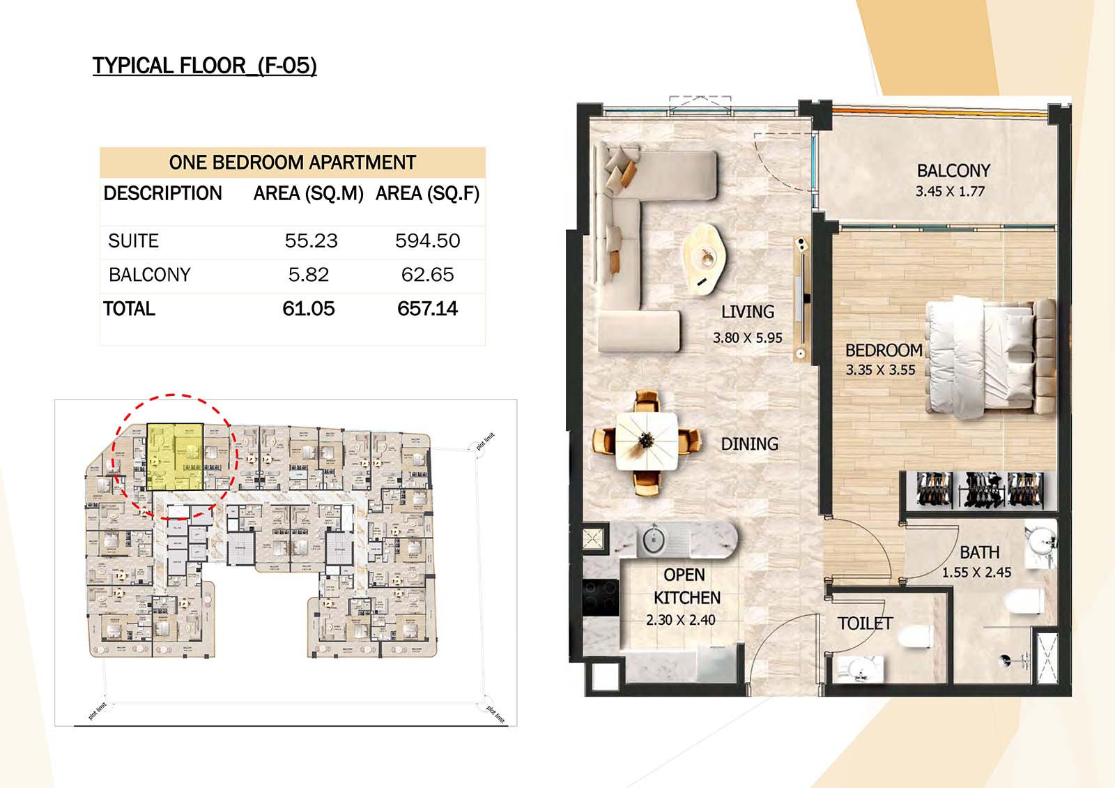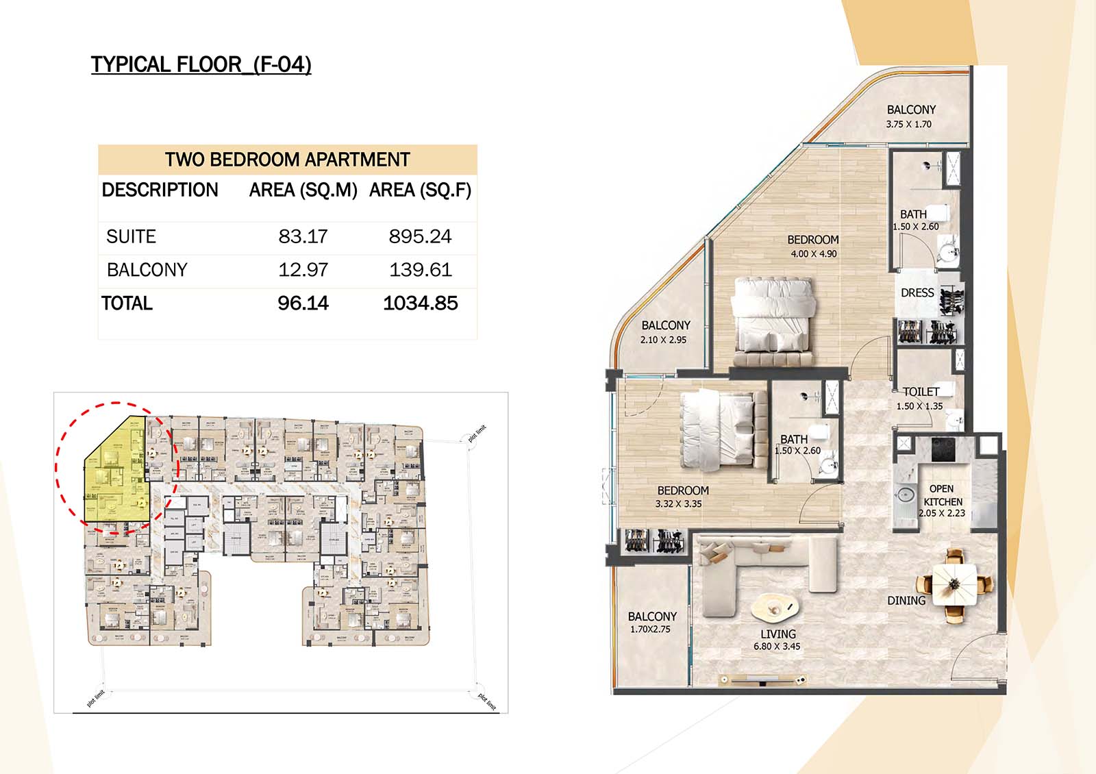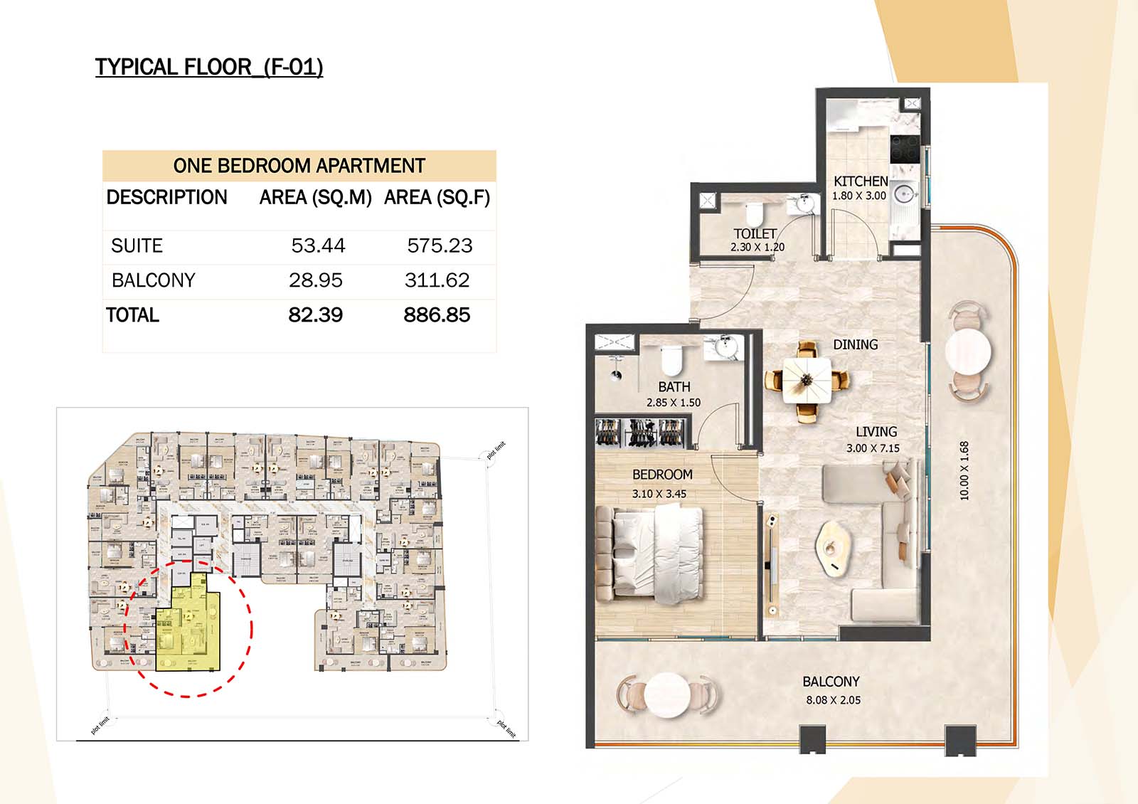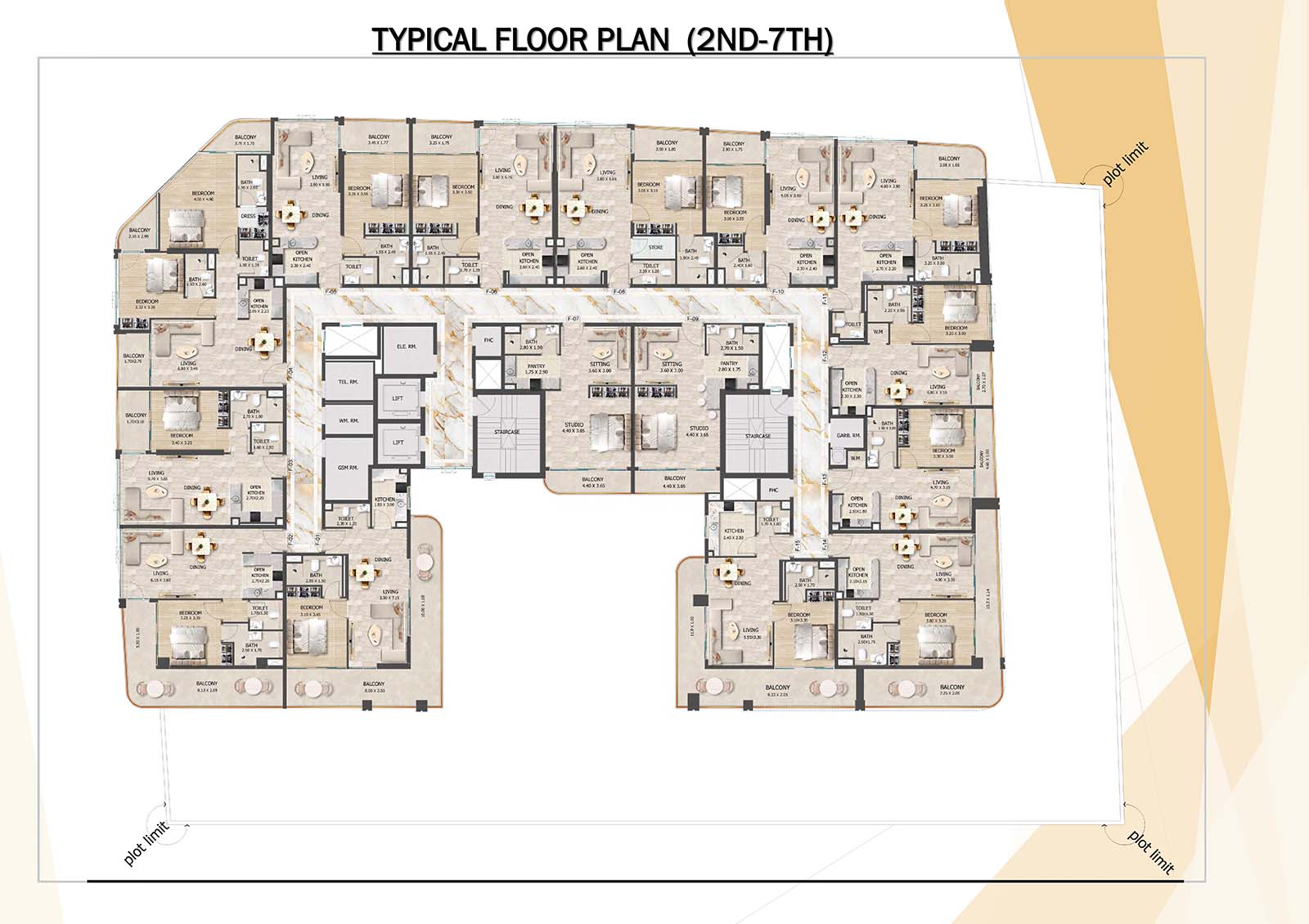 Crystal Tower floor plan with studio, 1, 2 and 3-bedroom apartments stands as a remarkable and luxurious residential mid-rise building. Units include spacious balconies, modular kitchen, and fully fitted bathrooms with quality fixtures and high-end amenities.