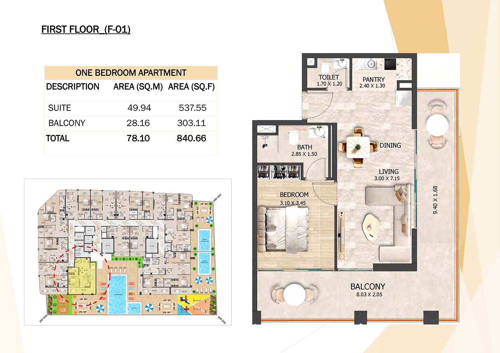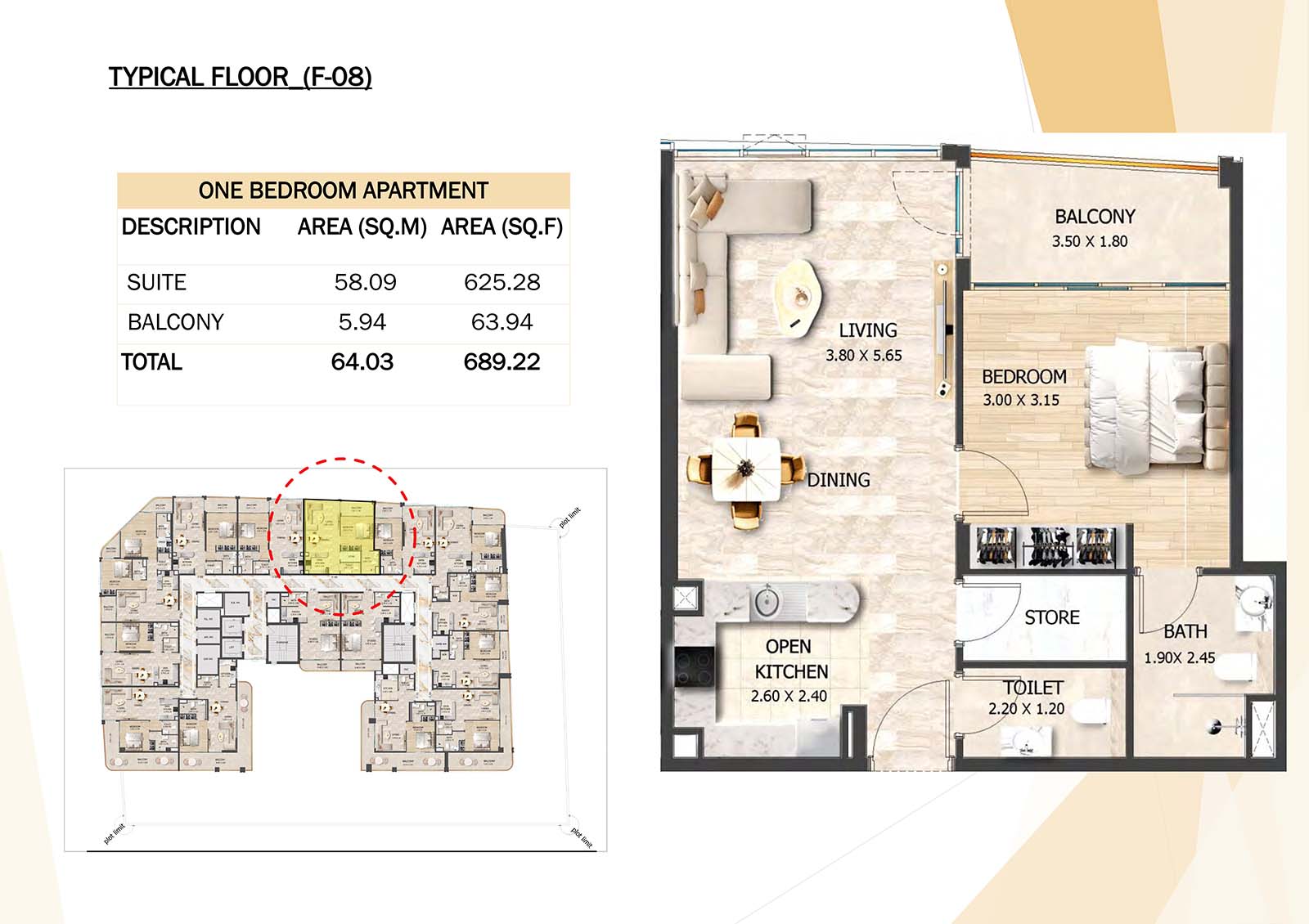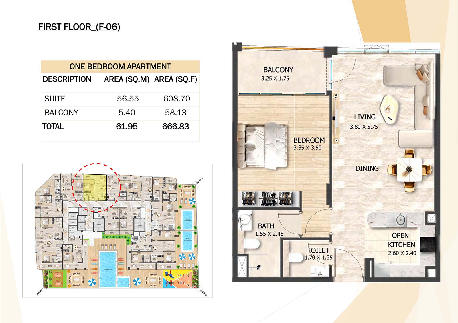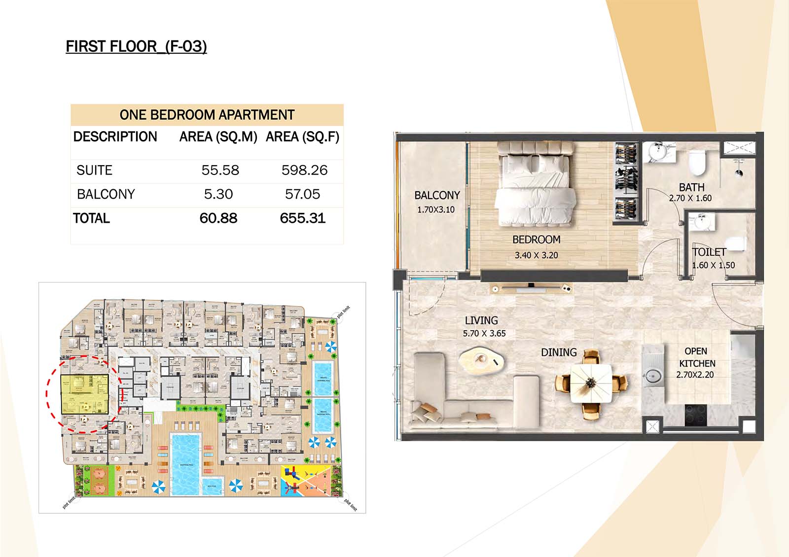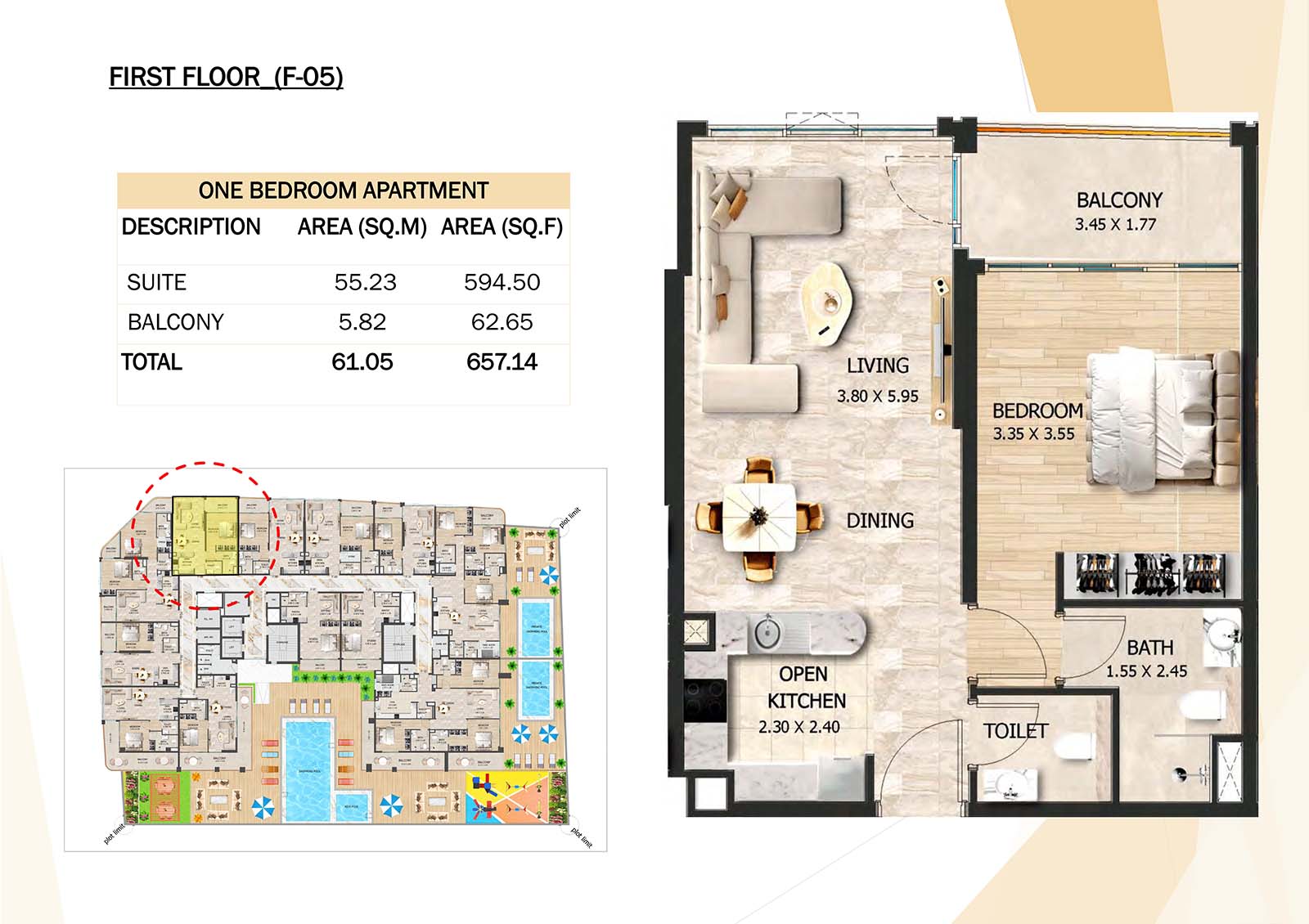 Crystal Tower floor plan with studio, 1, 2 and 3-bedroom apartments stands as a remarkable and luxurious residential mid-rise building. Units include spacious balconies, modular kitchen, and fully fitted bathrooms with quality fixtures and high-end amenities.