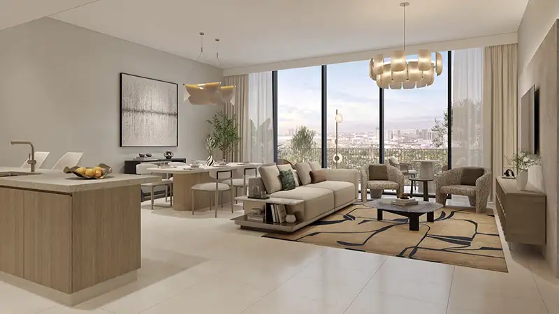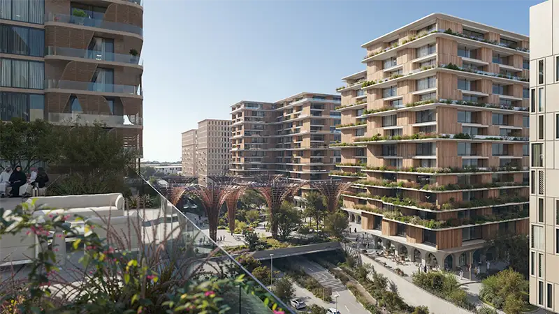 Expo Valley Views Dana at Expo City Dubai is a superbly carved low rises residential building by the Expo City Dubai, featuring premium class 1, 2 & 3-bedroom apartments. This newly and first phase within the community rises graceful with mid-rise 13-storey building, composed of soothing and gentle earth colours, lean and clean frontal and broadly placed glass windows inviting the outside. This creates a kind of harmony with nature in the architecture, buildings are placed in such a way as to take in green areas, serene walk paths and a gorgeous central swimming lagoon running through the central community. All the details presented throughout the façade highlight the concept of mindful living, such as the wellness-oriented amenities or touches of the natural material use in interiors. This is not just a new residential destination, but a higher life experience based on the greater vision of Expo city of a sustainable, connections new-age city in the future.