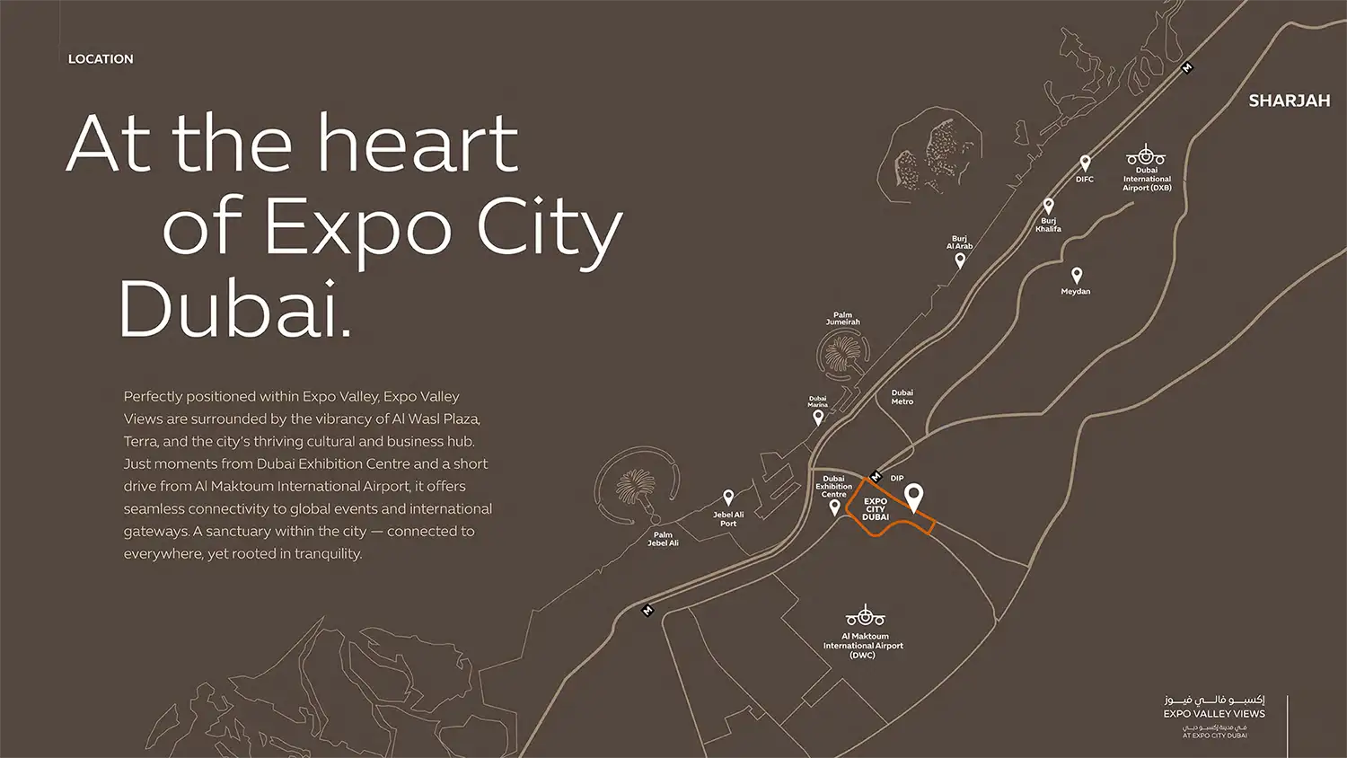 Located in the Expo Valley community, an area that blends the energy of the Al Wasl Plaza with the city-making attractions that surround the larger Expo City area. The location map depicted indicates that the location provides residents with easy access to the Dubai Exhibition Centre and a few minutes commute to the Al Maktoum International Airport. The location offers easy access to the world, the main road and international crossing - and still offers a harmonic nature-created place in the center of the world. The location has the advantage of being linked to all places and also deeply rooted in peace. It is a destination that literally transforms the tempo of the contemporary life, because nature, architecture, and lifestyle blend easily to form one incredible story.