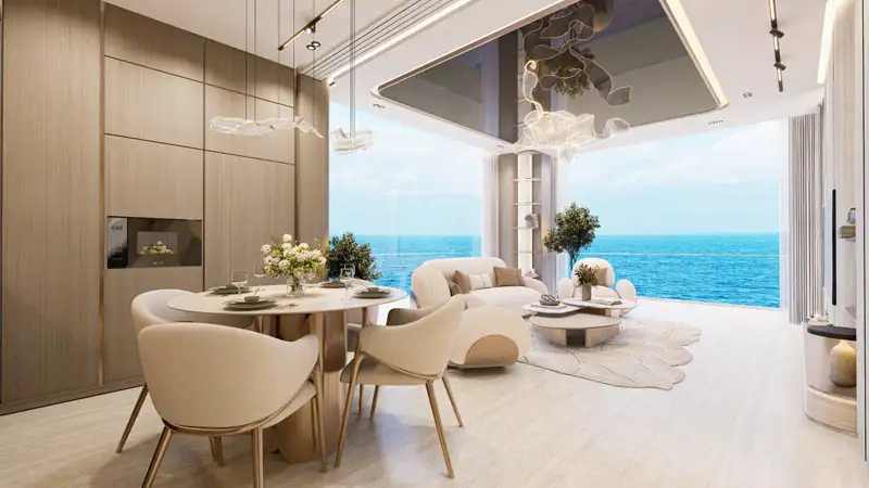 There are two unique options of interiors, including Blanco Luxe, which reflects fresh minimalism. This type of waterfront home is seamlessly luxurious and sophisticated, where functional spaces, refined details, and a curated environment offer a life of comfort. The Aqua Luxe is another type that is influenced by the fluidity of seawater, with convertible homes that are light with an essence of finest elegance.