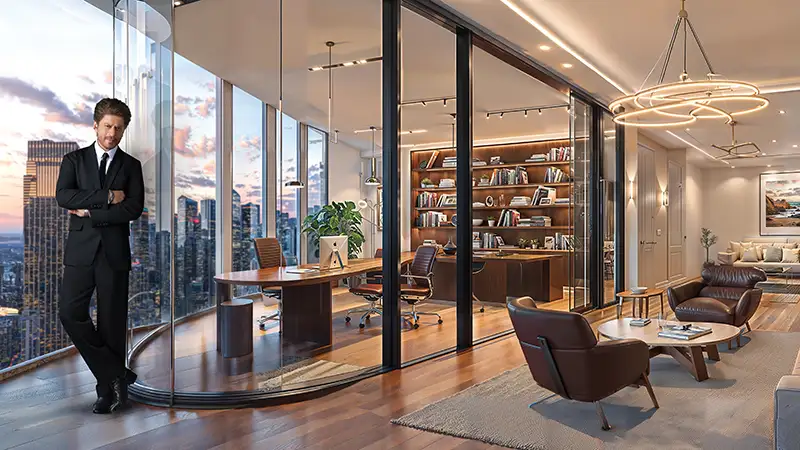 Shahrukhz by Danube Properties is the next level commercial development inspired by the self-made journey of Shahrukh Khan, with exclusive class office spaces. As you look through its form piercing down the Sheikh Zayed Road, the 55-storey commercial innovation declares to the world not just another office building with ambition, a life of well-considered prestige, and sustained by a philosophical statement that transforms work into work to live. This is a space that has been designed to cater to the founders, head of industry and vision of art who needs more than a floor, a desk, they need an address that will put them in a stronger position and redefine the ordinary and make it extraordinary. The project is driven by the story of a self-made star and is an amalgamation of cinematic drama and practical excellence: the entrance experience must become the rite of passage, a lobby, filtered initial impressions and the orchestration of spaces that helps both focused work and personal statement.