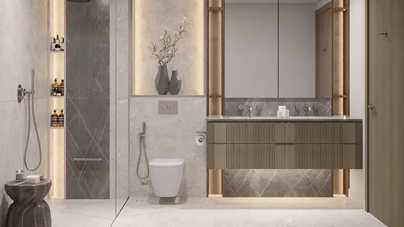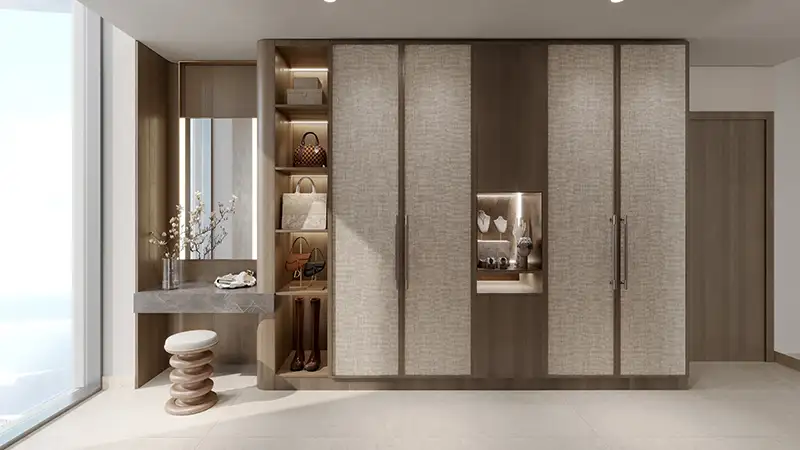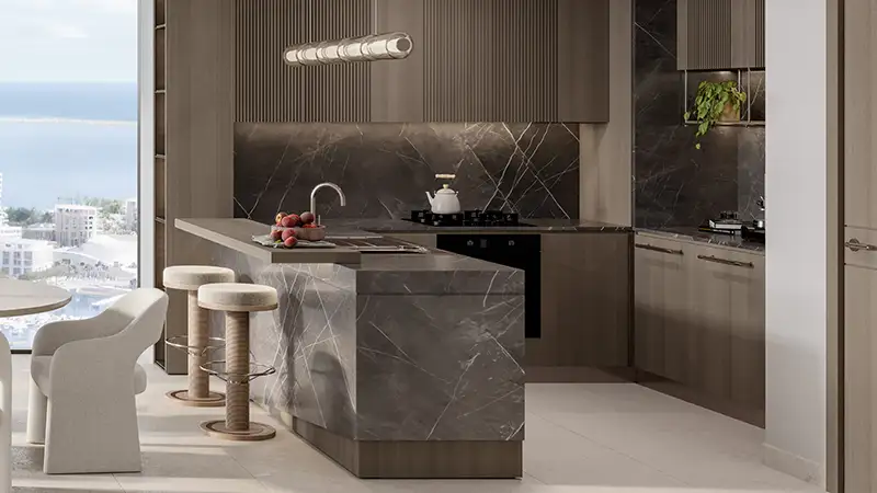 The concept inside, reforms the history of Port Rashid into gritty-classy interiors. The spaces of the community are filled with sculptural art and materials citing and the aspects of serene abodes of philosophical work. Kitchens are seamless and made without concern, these have flowing surfaces, hidden storage as well as central islands, which play the role of both cooking and social hub. Bedrooms are envisaged as high-ceilinged sanctuaries with integrated lighting that is soft and walk-in wardrobes and sculptural shelves; living spaces are specifically open, and lounge to dining and intimate time is flowing.