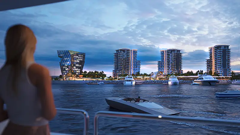 - Designed for light and flow, the tower’s façade maximizes natural illumination while podium-level promenades open toward the harbour’s tranquil edge.