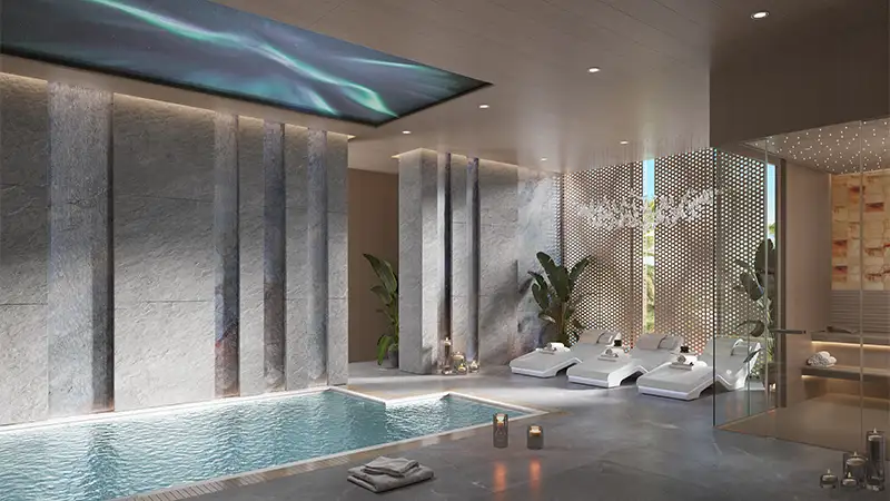 Retreating indoors, the wellness suite combines male and female spa changing rooms with hydrotherapy elements and high-tech massage chairs, while a light-soaked fitness studio and yoga studio help you to reset your day. For the small folk there's a kid’s club and an indoor play for imaginations to keep them busy, for the movie nights there's a dedicated cinema room. Active days are continued through to a padel court & cycle parking for neighbourhood spins along the shore.
