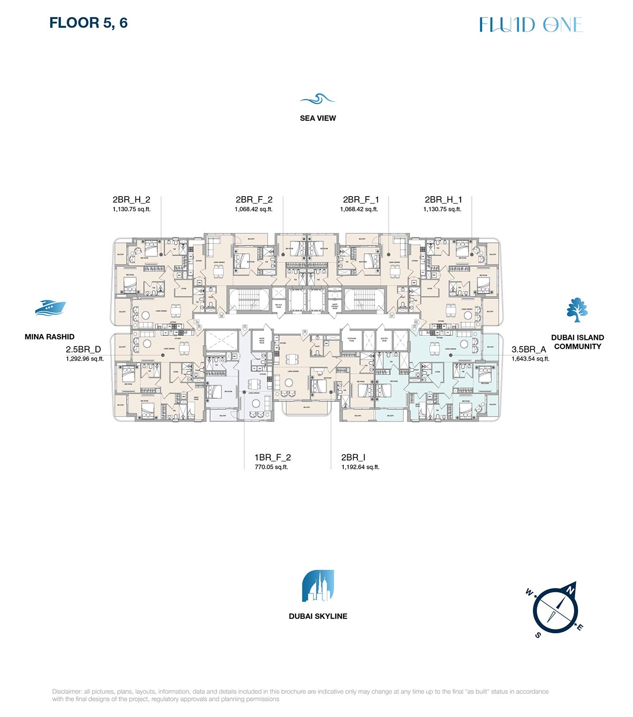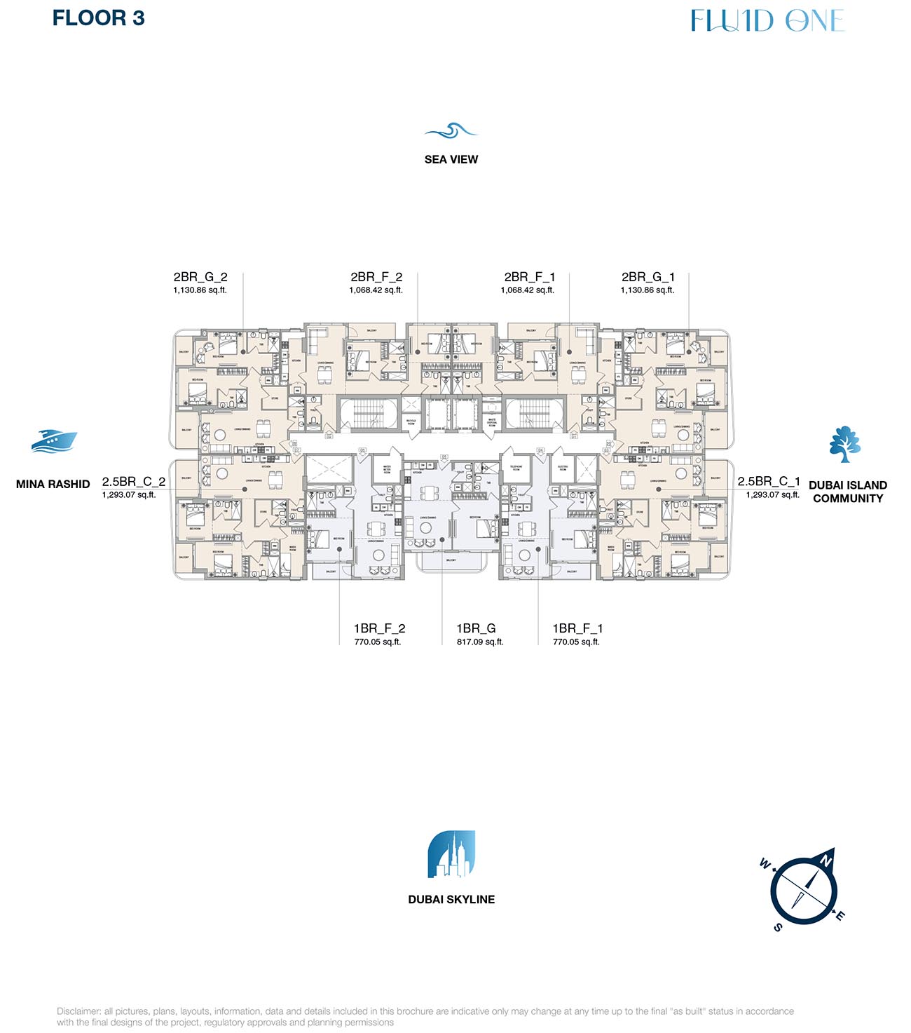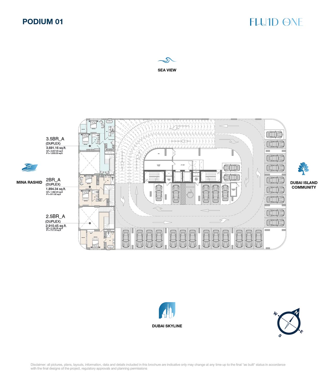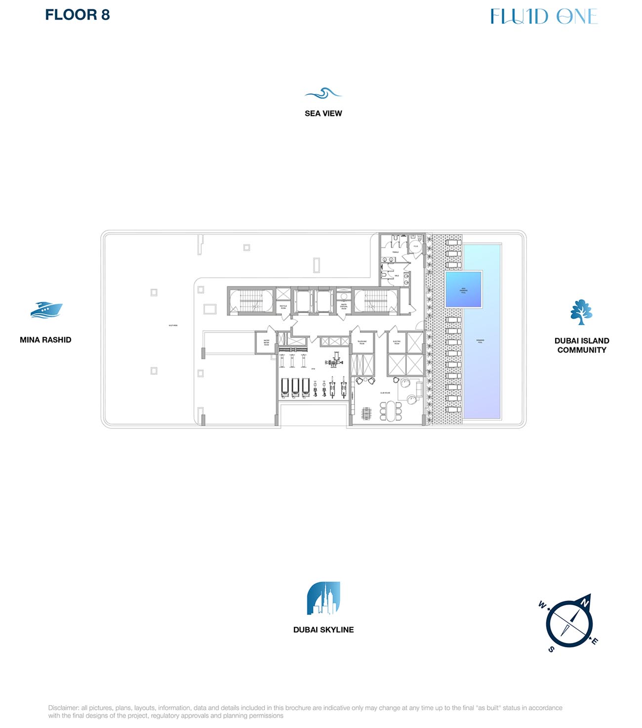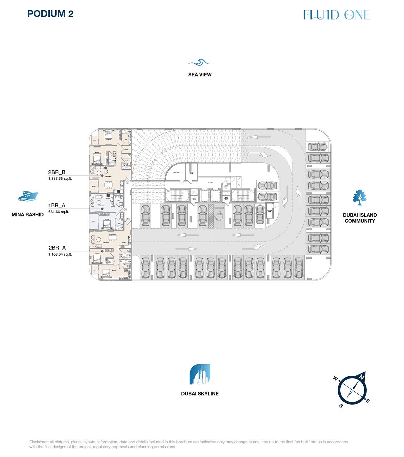 Fluid One is inspired by the aesthetic of waterfront with limited edition floor plans of 1, 2, 2.5 and 3.5 bedroom apartments with premium views. The modern living is considered in the design of each floor plan, and the layouts are intuitive and comfortable and functional. Wide balconies look out on the sea, Mina Rashid, and the Dubai skyline. On floor 8, there are the signature lifestyle facilities, such as the gym, swimming pool, kids swimming pool, clubhouse, and a sun-lounger-equipped pool deck, which is strictly organized in a more organic space sequence with the value of easy accessibility and privacy. Each design beams the idea of stress-free, relaxed life on the island.