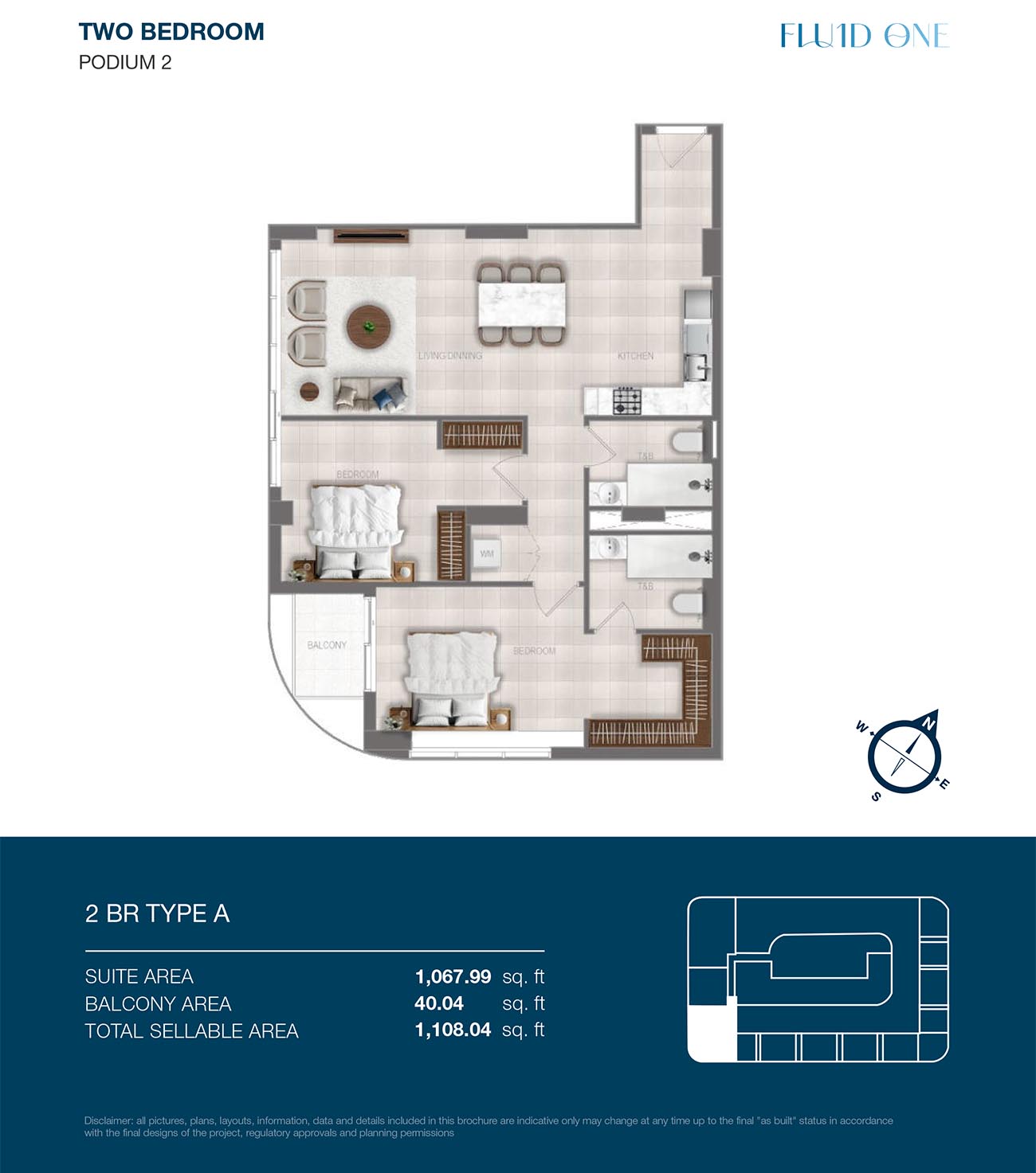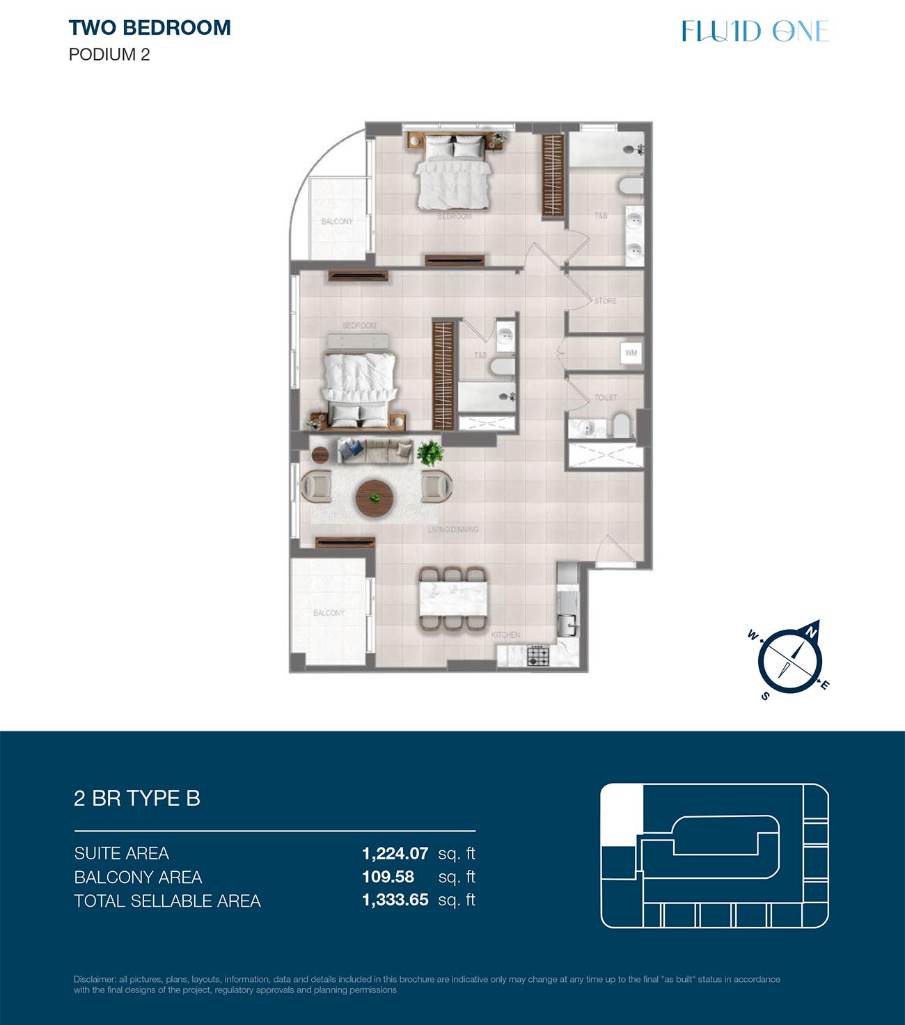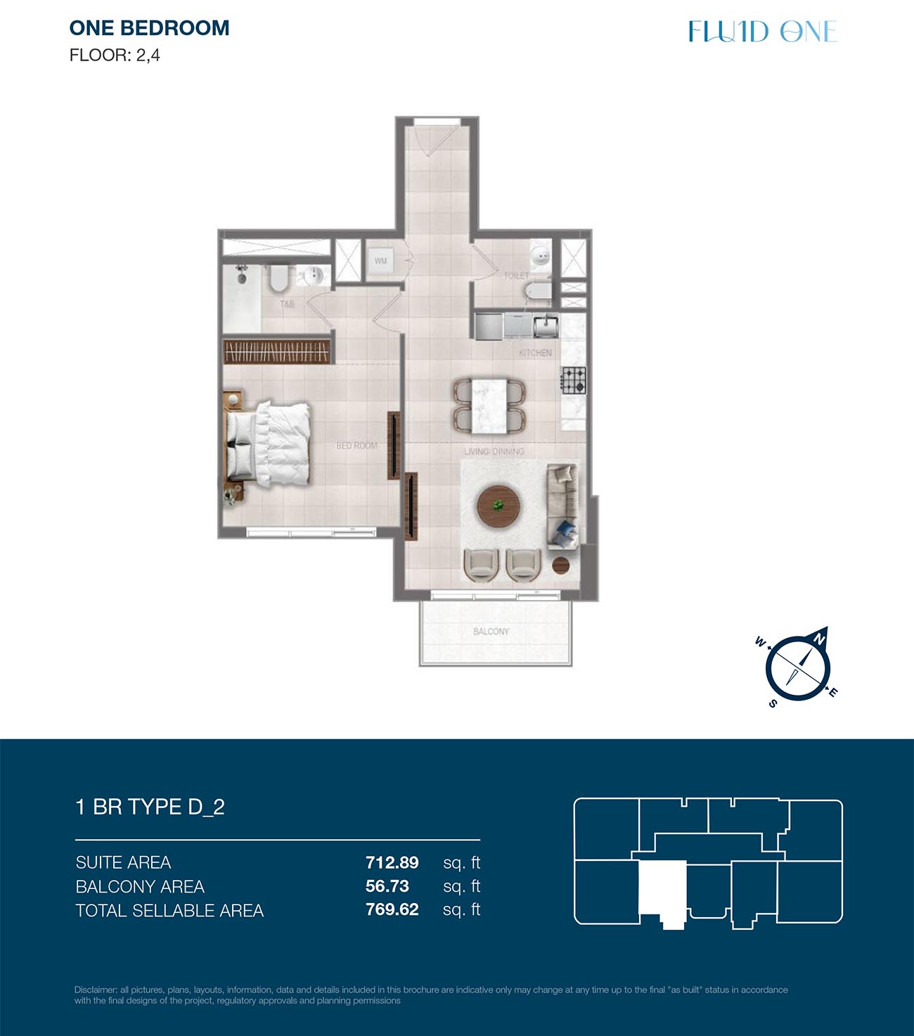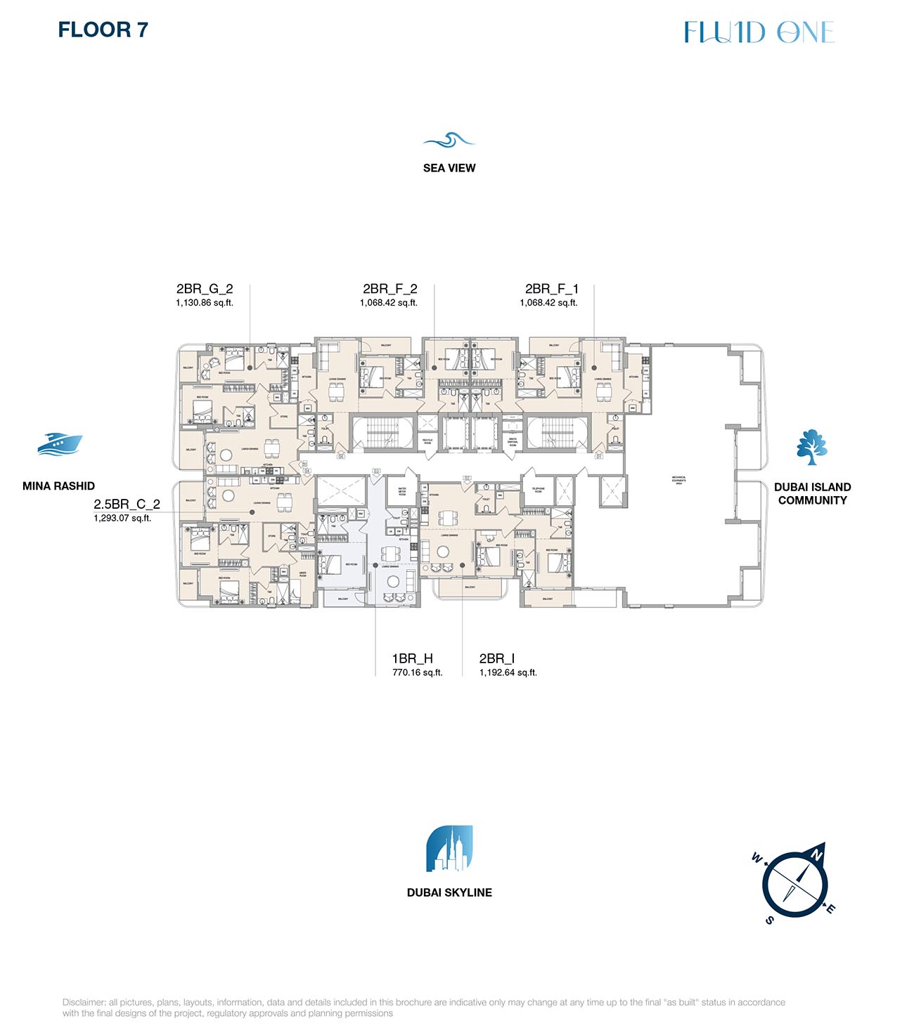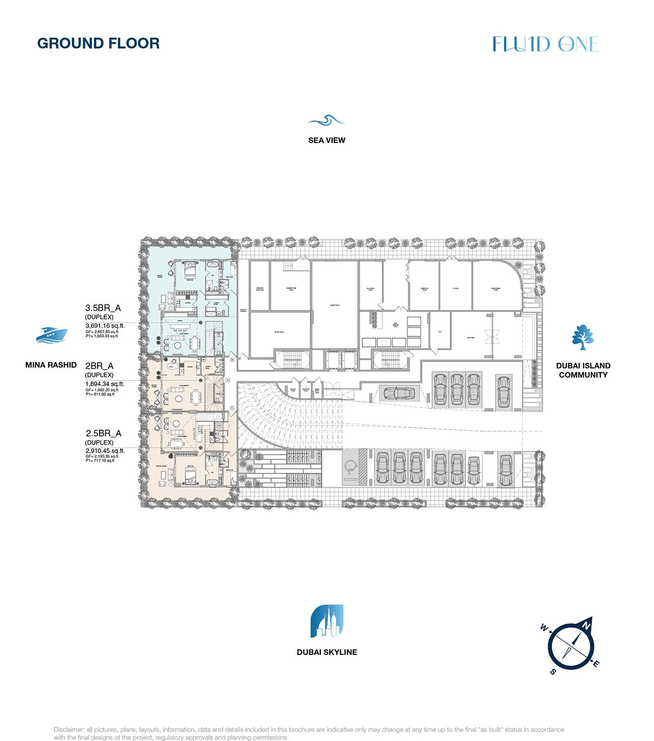 Fluid One is inspired by the aesthetic of waterfront with limited edition floor plans of 1, 2, 2.5 and 3.5 bedroom apartments with premium views. The modern living is considered in the design of each floor plan, and the layouts are intuitive and comfortable and functional. Wide balconies look out on the sea, Mina Rashid, and the Dubai skyline. On floor 8, there are the signature lifestyle facilities, such as the gym, swimming pool, kids swimming pool, clubhouse, and a sun-lounger-equipped pool deck, which is strictly organized in a more organic space sequence with the value of easy accessibility and privacy. Each design beams the idea of stress-free, relaxed life on the island.