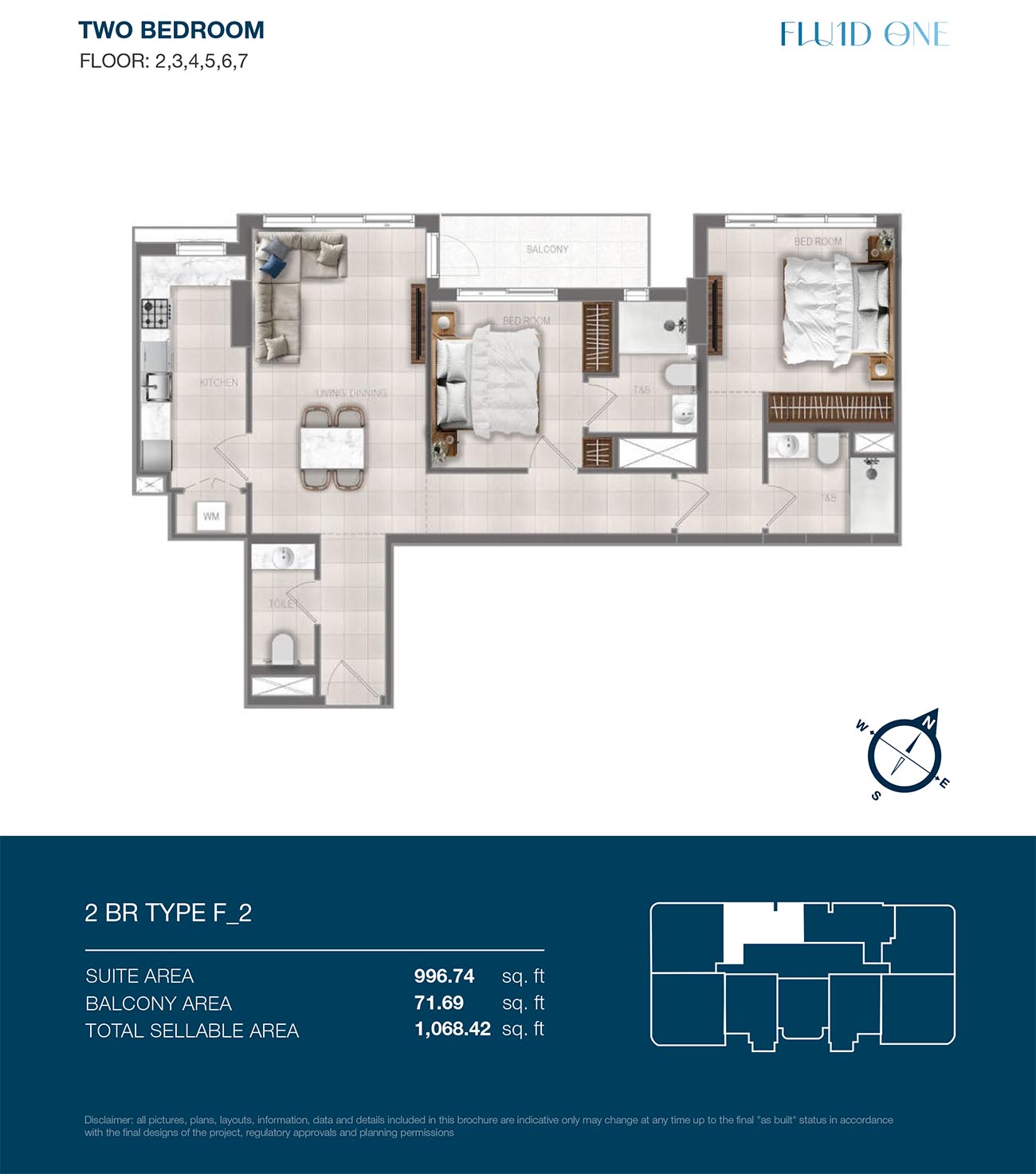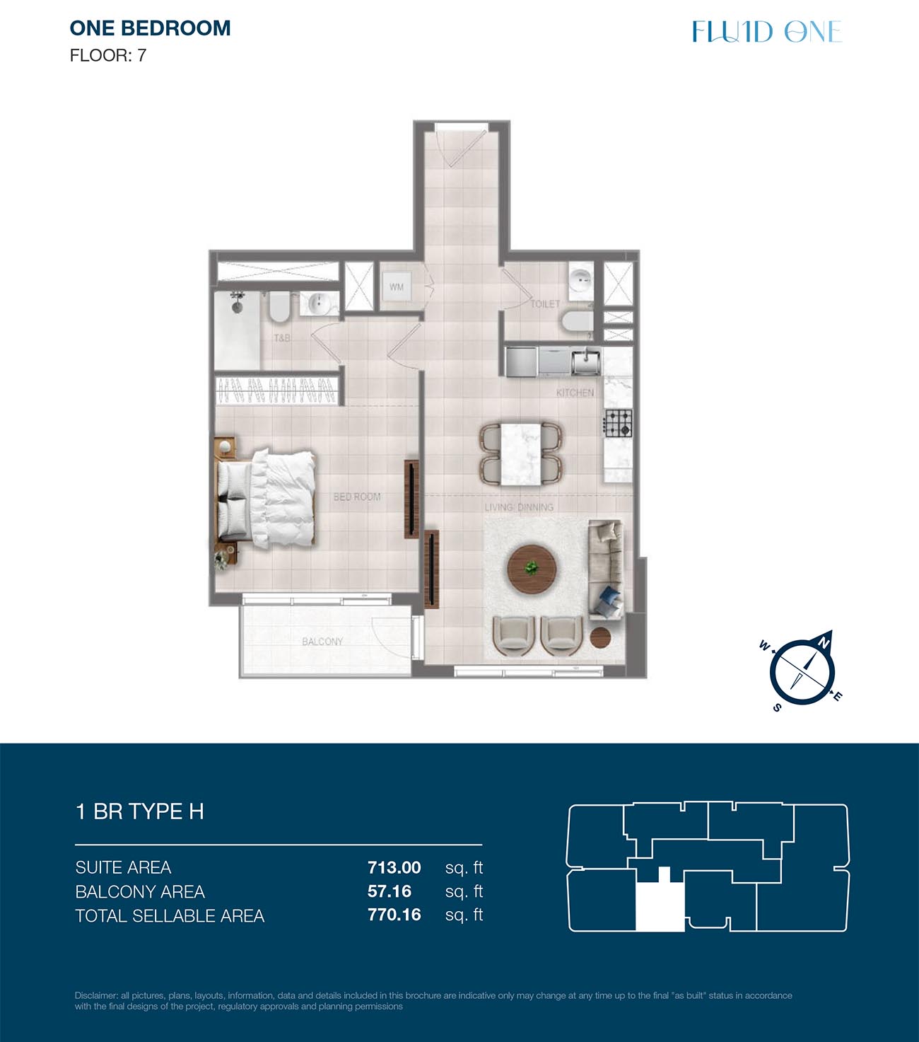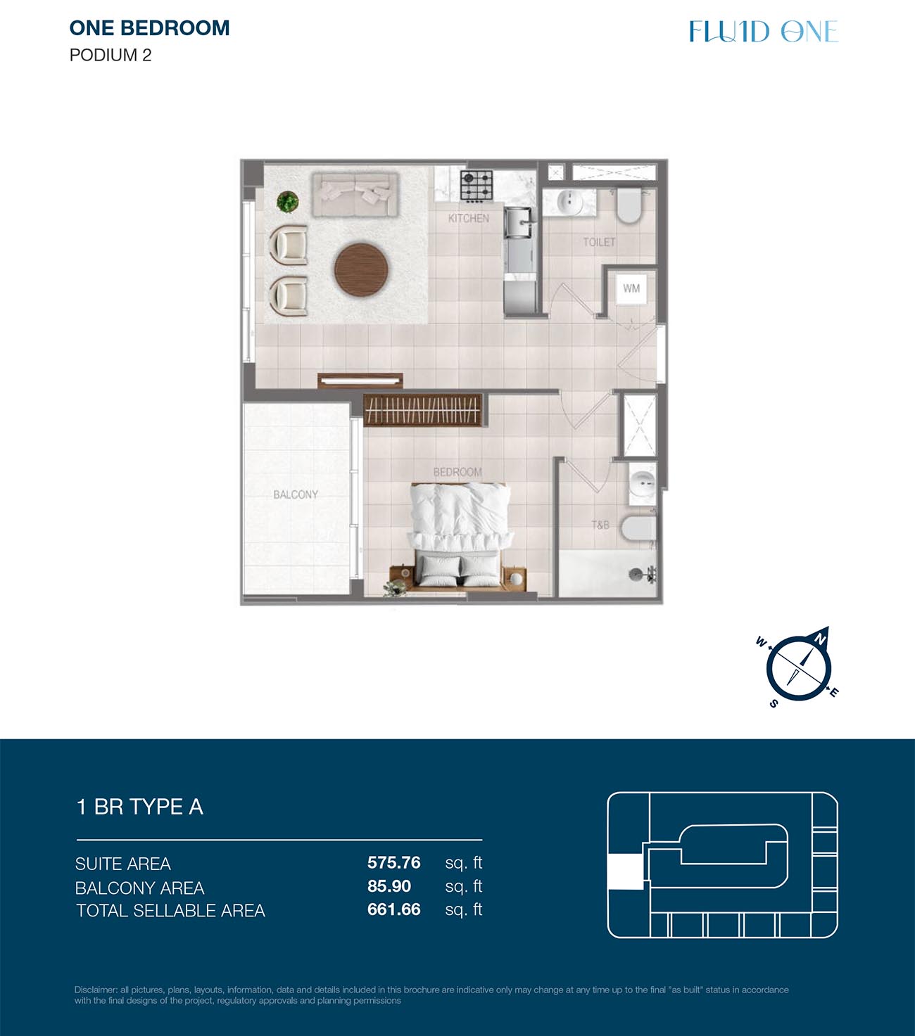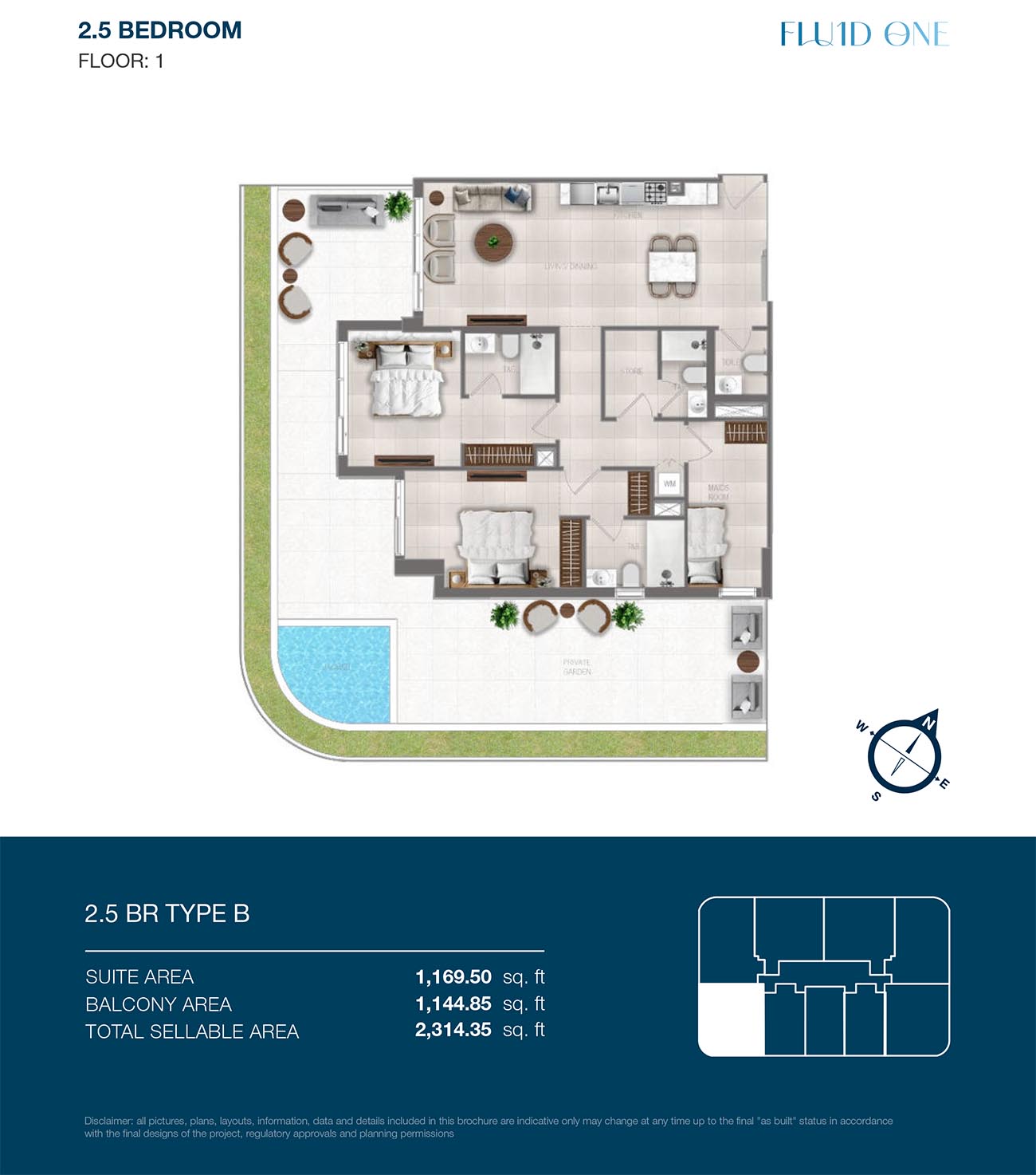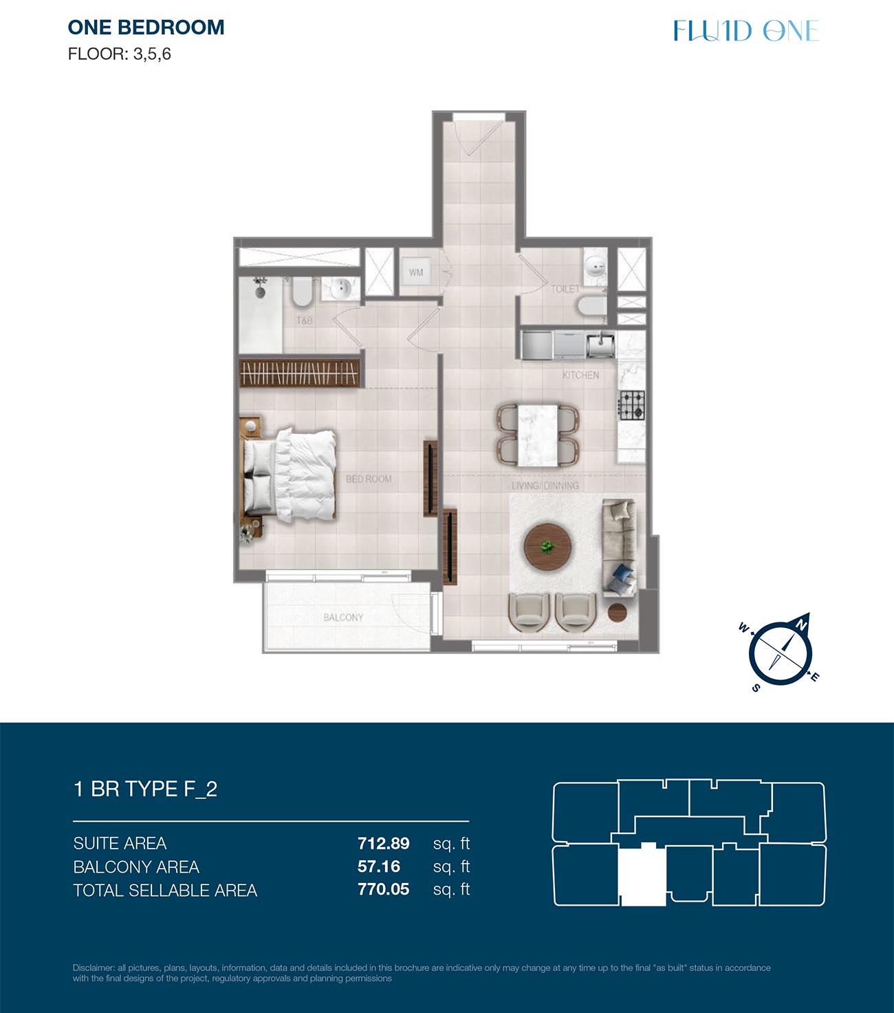 Fluid One is inspired by the aesthetic of waterfront with limited edition floor plans of 1, 2, 2.5 and 3.5 bedroom apartments with premium views. The modern living is considered in the design of each floor plan, and the layouts are intuitive and comfortable and functional. Wide balconies look out on the sea, Mina Rashid, and the Dubai skyline. On floor 8, there are the signature lifestyle facilities, such as the gym, swimming pool, kids swimming pool, clubhouse, and a sun-lounger-equipped pool deck, which is strictly organized in a more organic space sequence with the value of easy accessibility and privacy. Each design beams the idea of stress-free, relaxed life on the island.