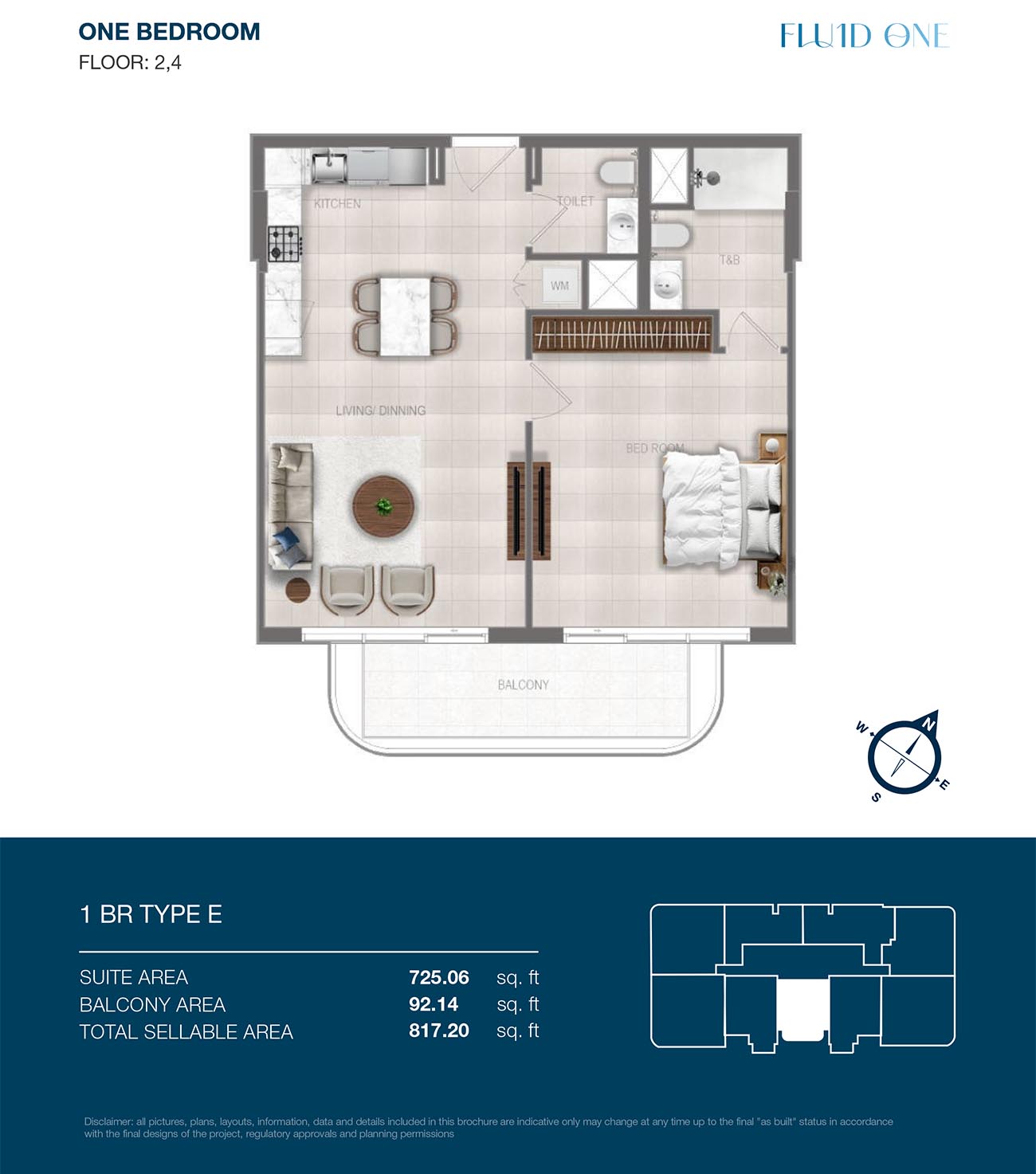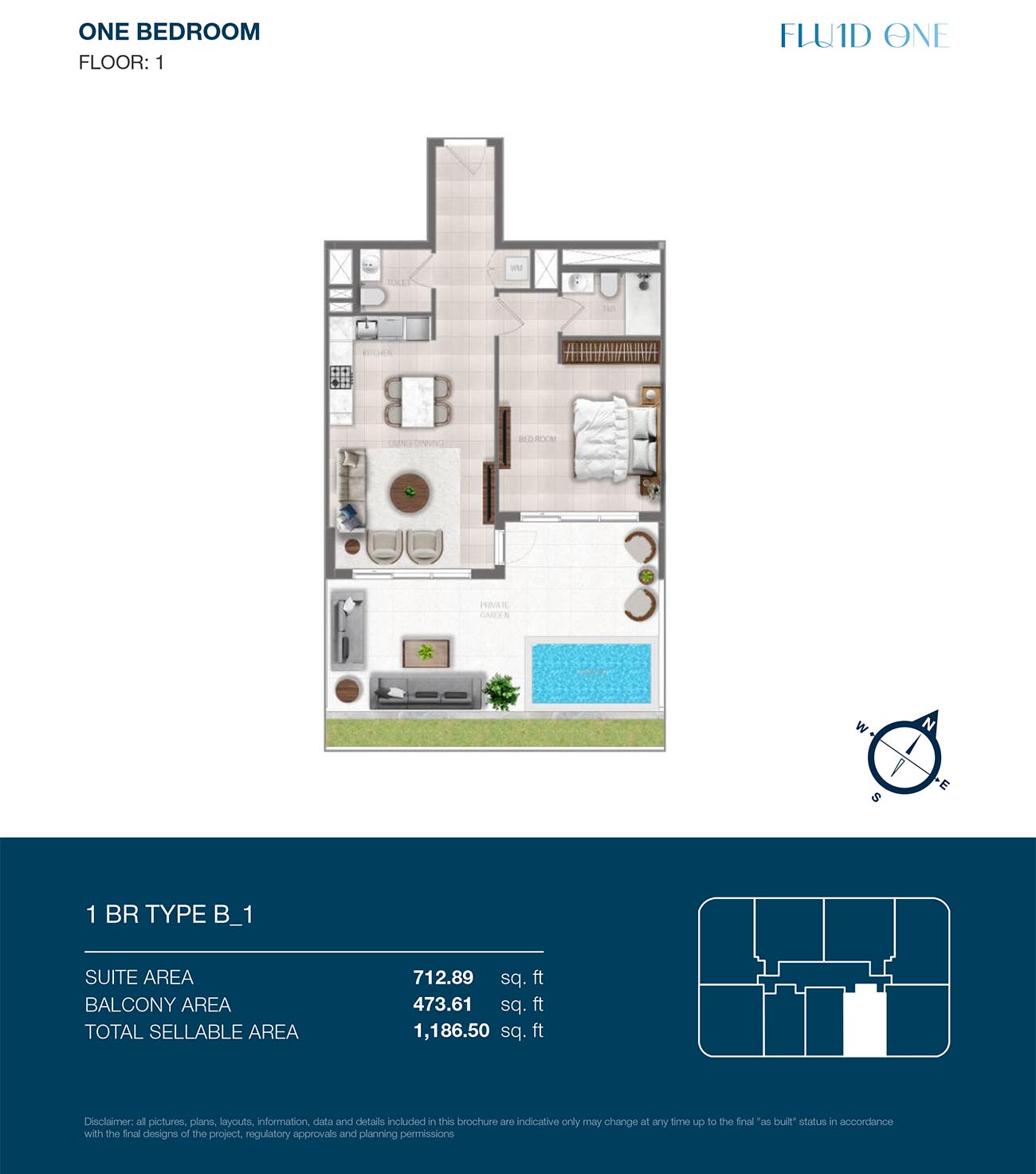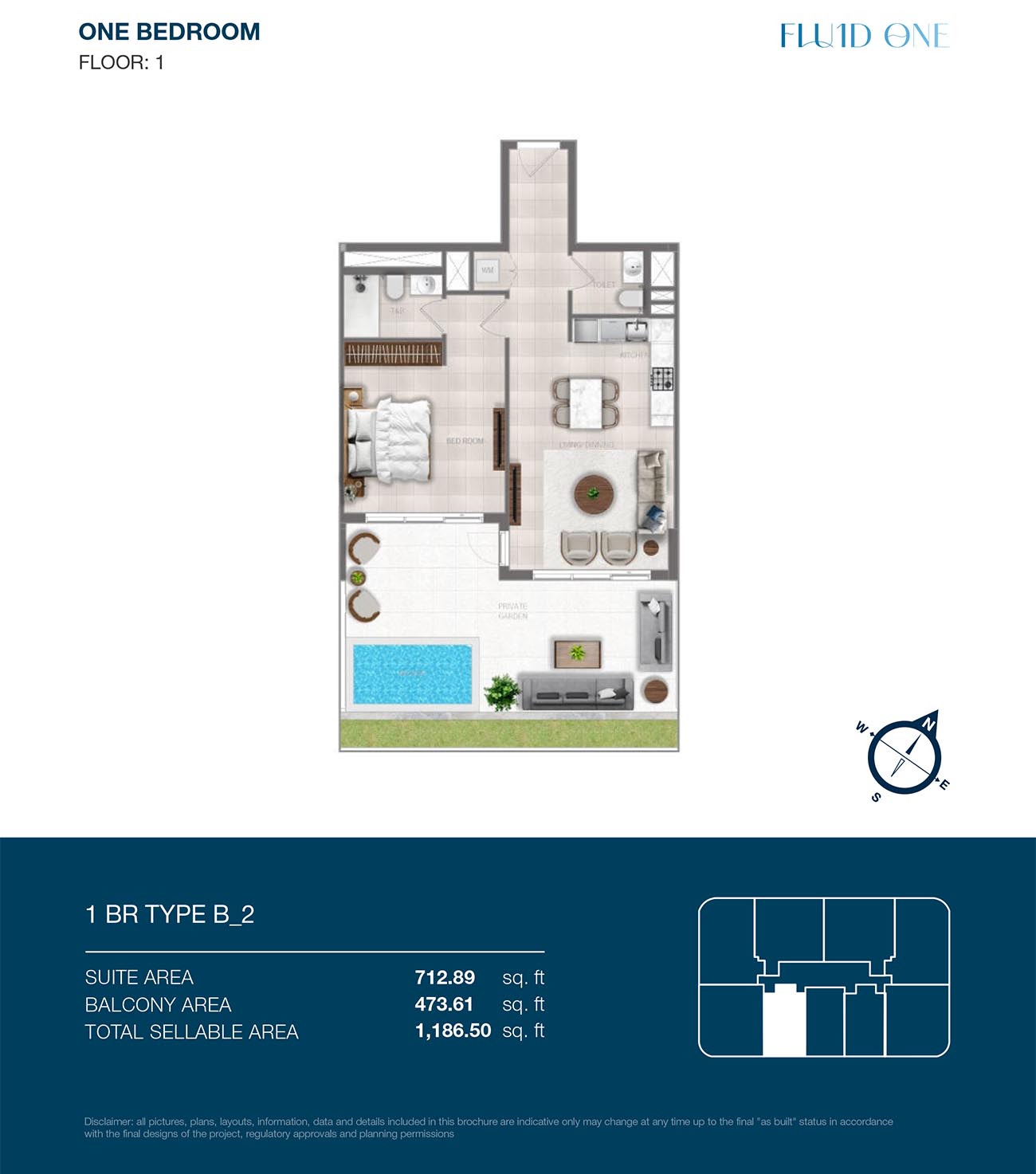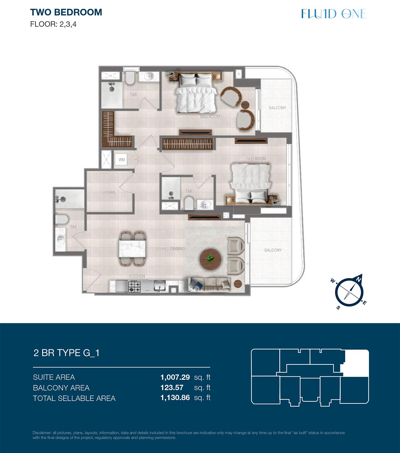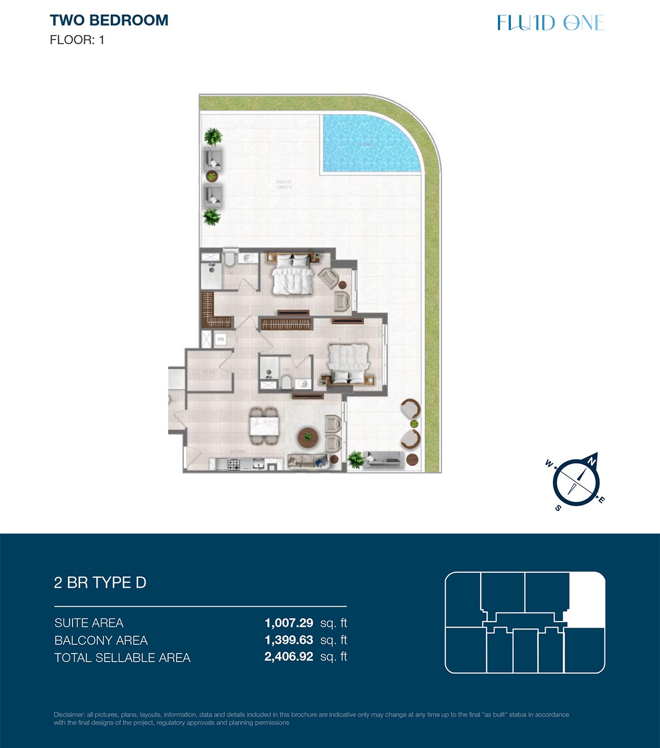 Fluid One is inspired by the aesthetic of waterfront with limited edition floor plans of 1, 2, 2.5 and 3.5 bedroom apartments with premium views. The modern living is considered in the design of each floor plan, and the layouts are intuitive and comfortable and functional. Wide balconies look out on the sea, Mina Rashid, and the Dubai skyline. On floor 8, there are the signature lifestyle facilities, such as the gym, swimming pool, kids swimming pool, clubhouse, and a sun-lounger-equipped pool deck, which is strictly organized in a more organic space sequence with the value of easy accessibility and privacy. Each design beams the idea of stress-free, relaxed life on the island.
