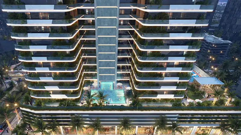 - The project features a distinctive façade with layered balconies and landscaped terraces, enhancing both visual appeal and environmental efficiency.