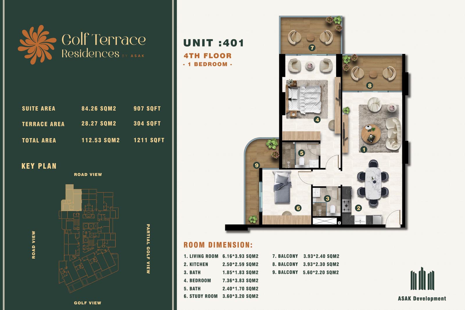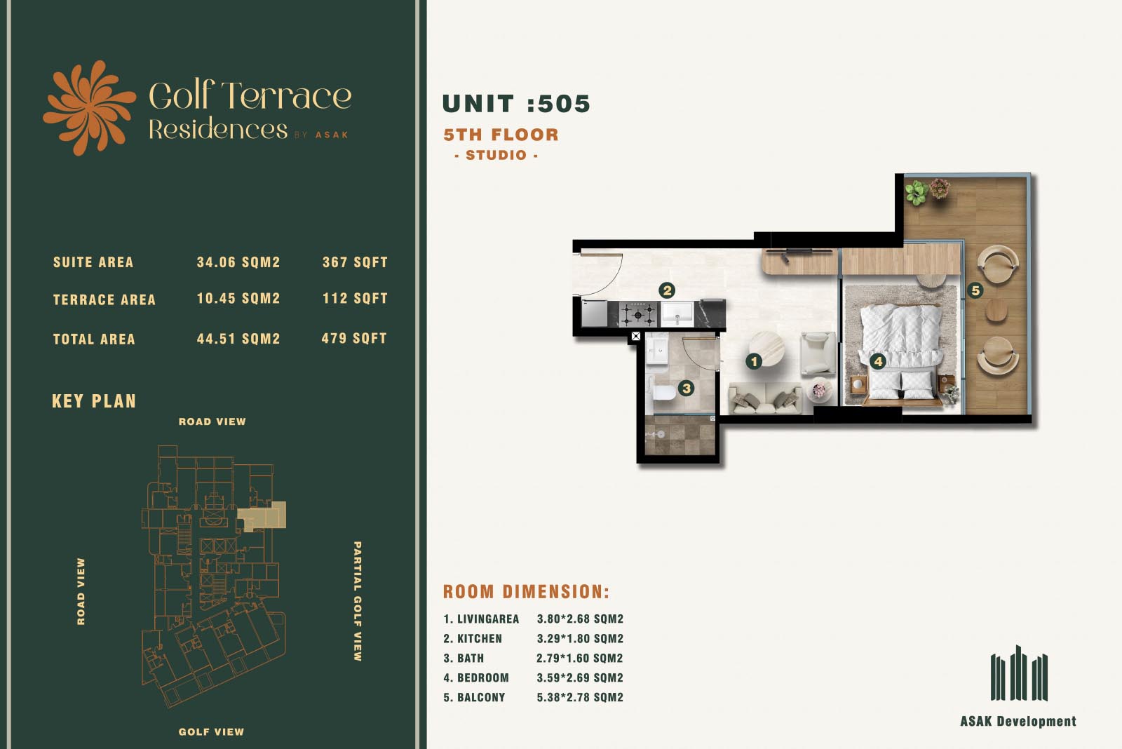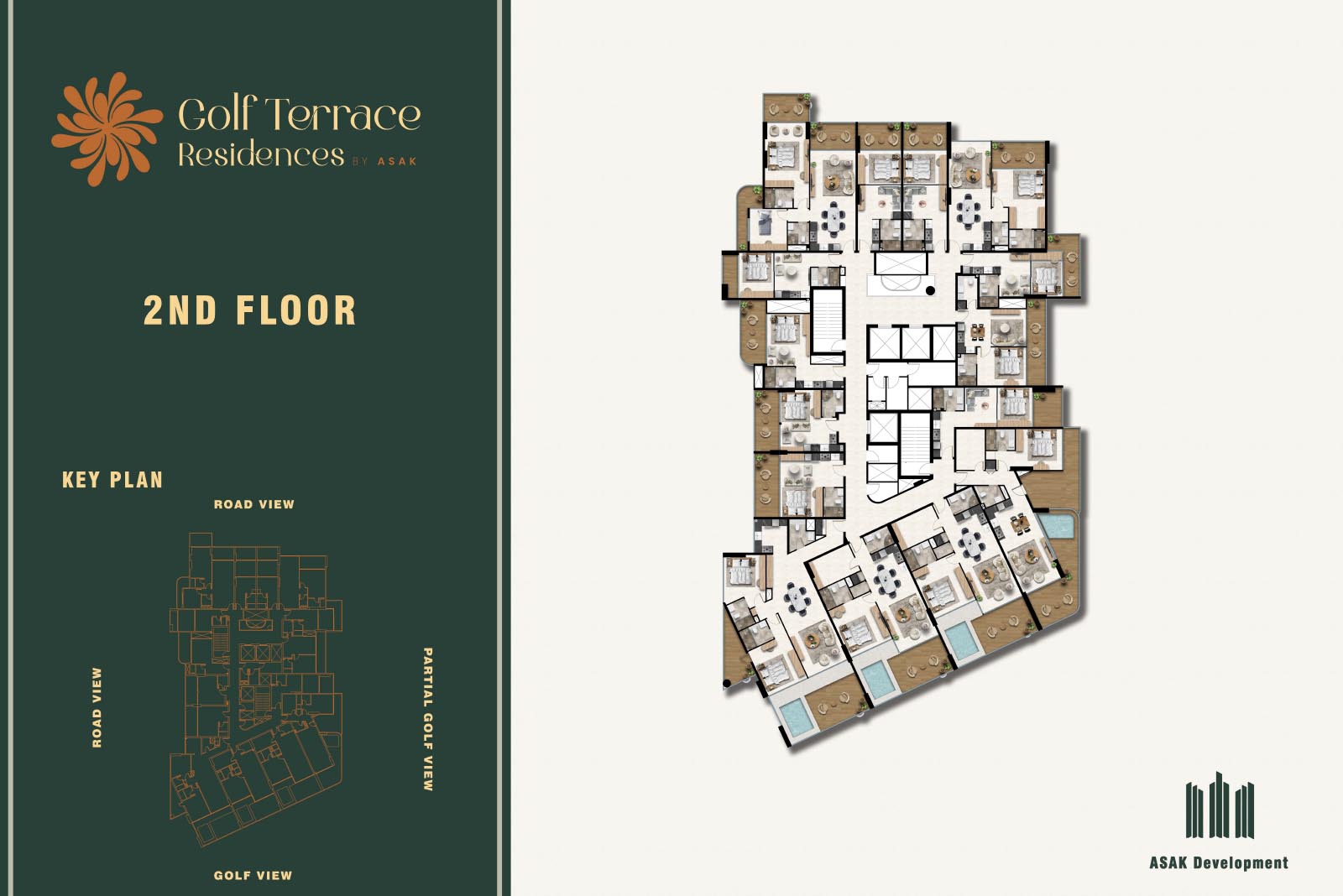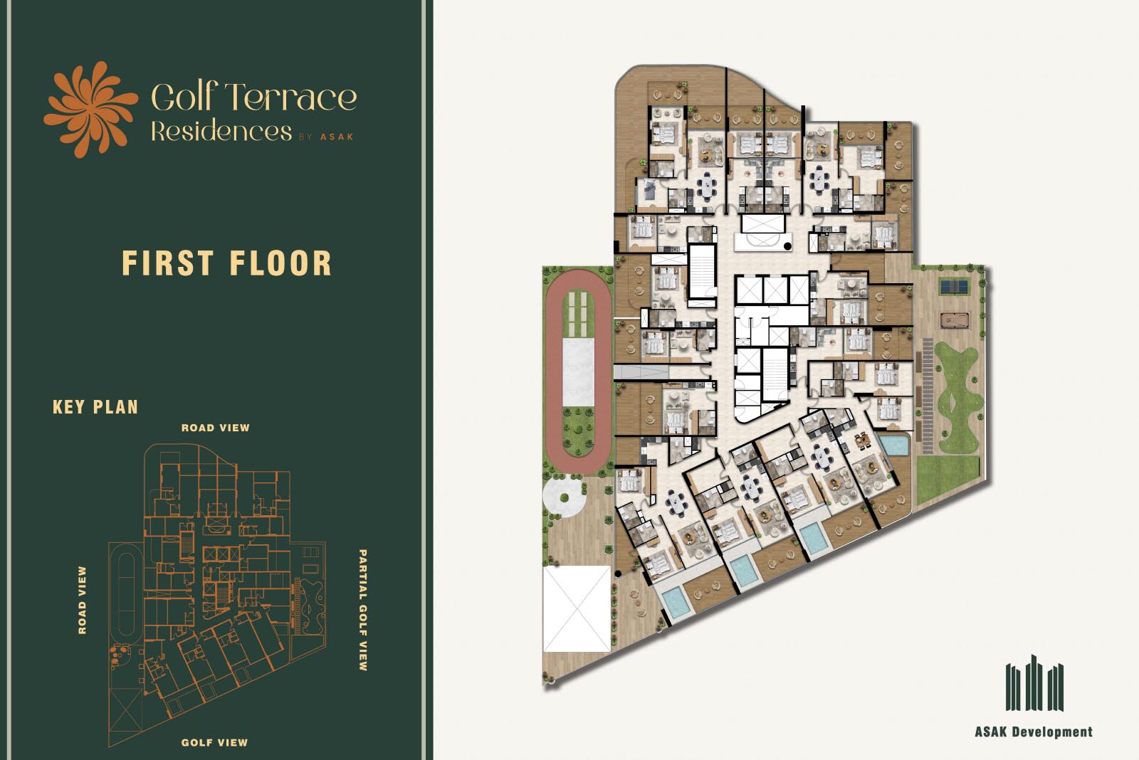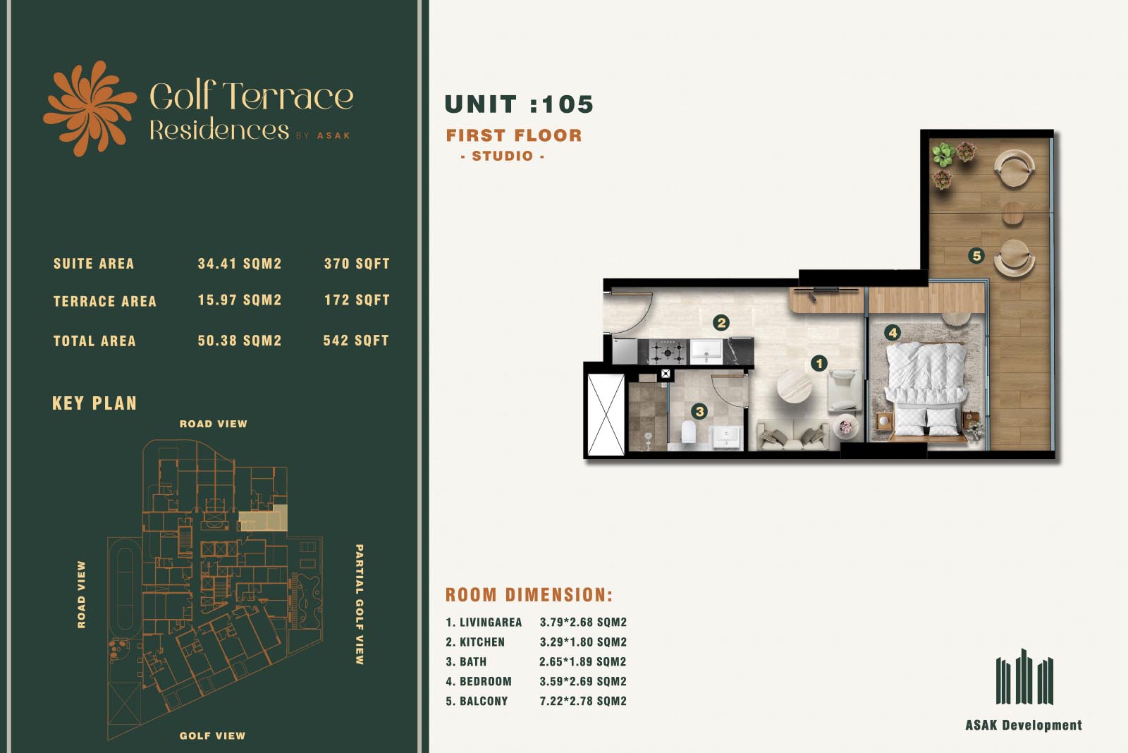 In Golf Terrace Residences the floor plans are dictated by practicality and the comfort of space, offering studios, 1 and 2-bedroom apartments. The rooms will be as spacious as possible with each house being constructed with optimized area to make the rooms look open and well characterized without wastage space. Living and dining areas are designed in such a way that they get a lot of natural lighting, and bedrooms are at a position where privacy and tranquillity are given. Kitchens and bathrooms are designed in accordance with the modern style that ensures their daily utility and includes considerate storage systems.