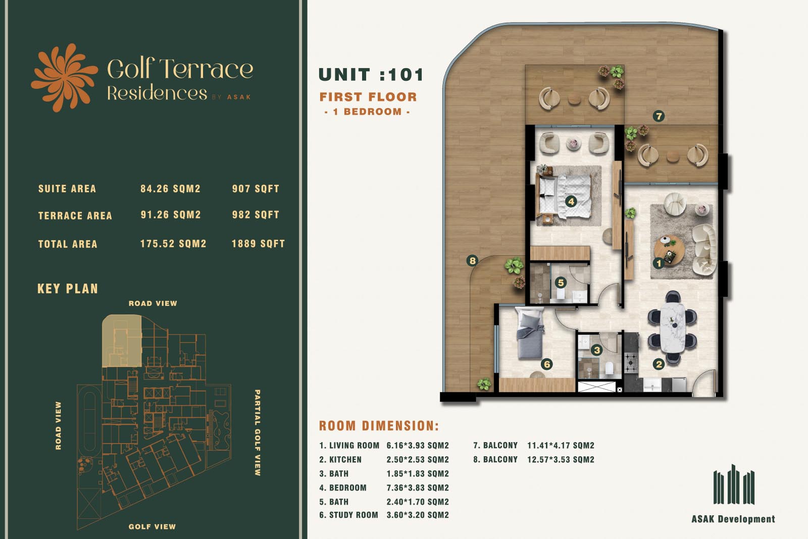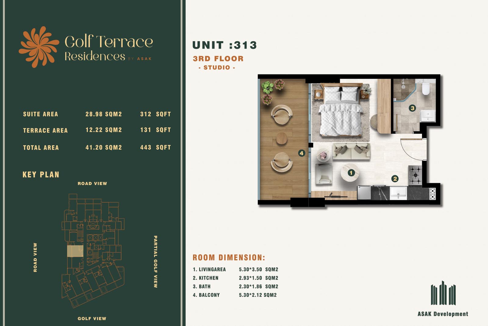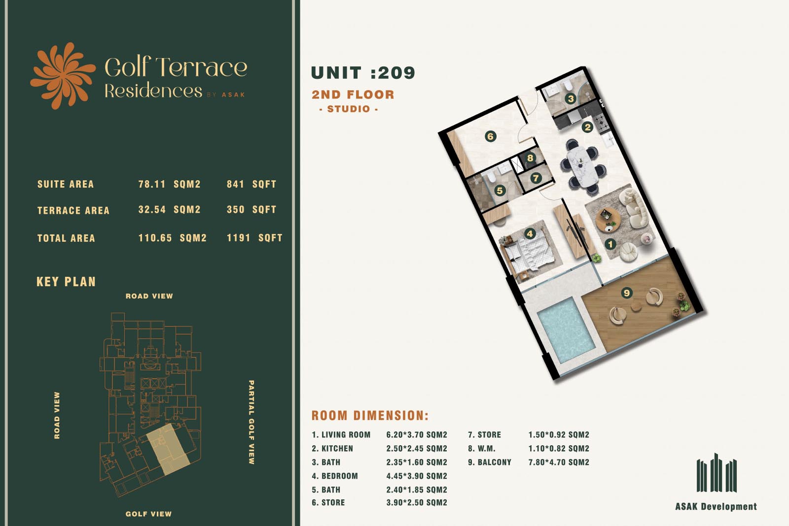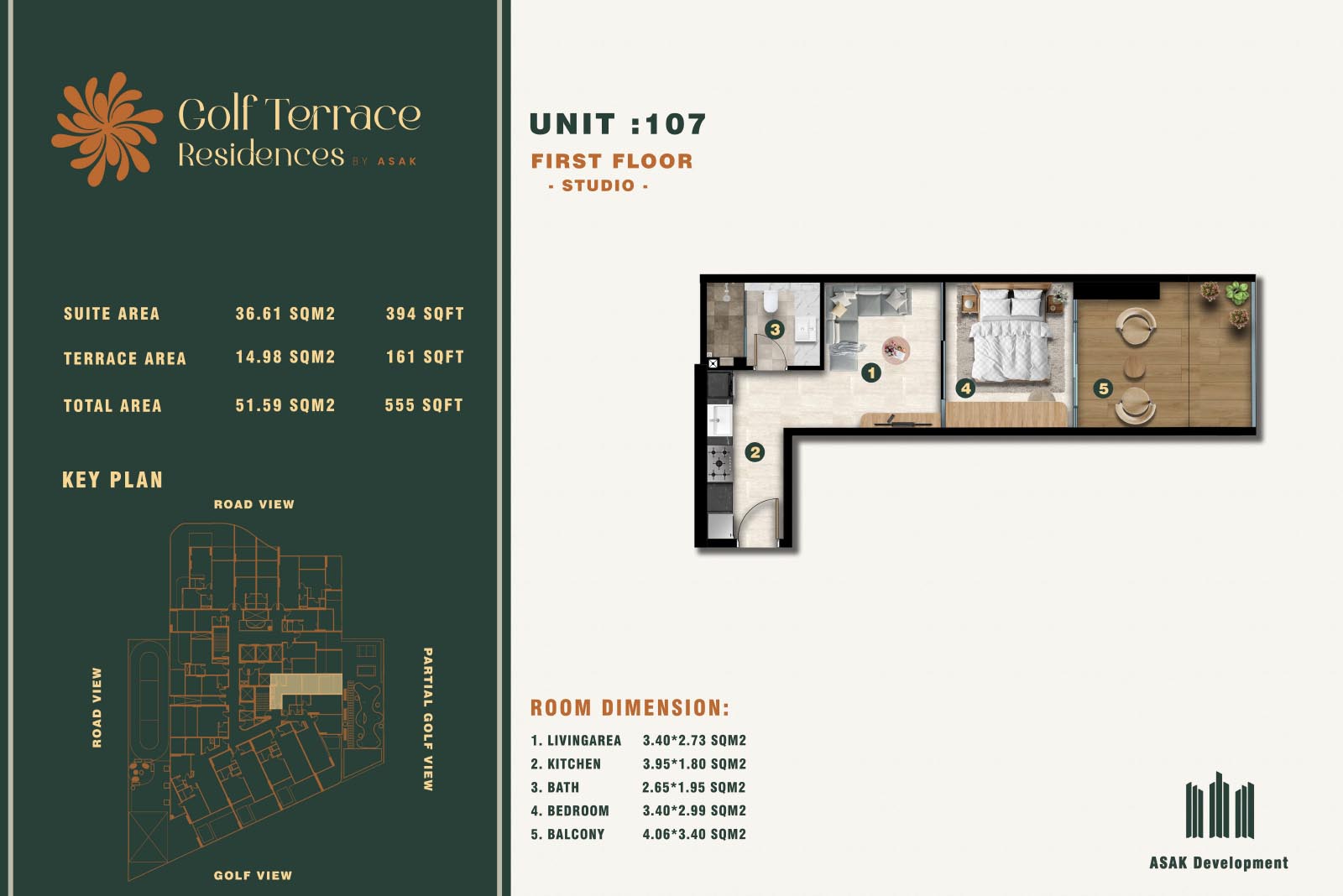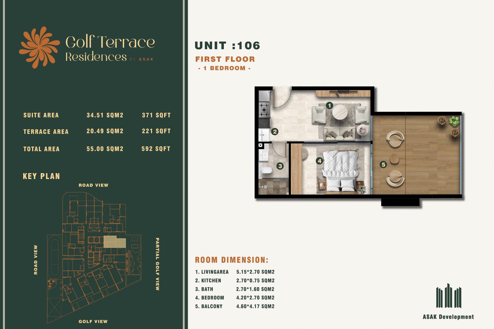 In Golf Terrace Residences the floor plans are dictated by practicality and the comfort of space, offering studios, 1 and 2-bedroom apartments. The rooms will be as spacious as possible with each house being constructed with optimized area to make the rooms look open and well characterized without wastage space. Living and dining areas are designed in such a way that they get a lot of natural lighting, and bedrooms are at a position where privacy and tranquillity are given. Kitchens and bathrooms are designed in accordance with the modern style that ensures their daily utility and includes considerate storage systems.