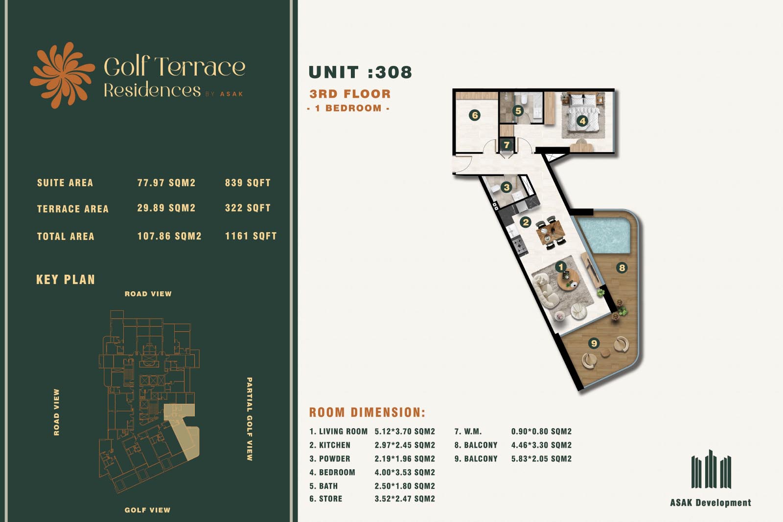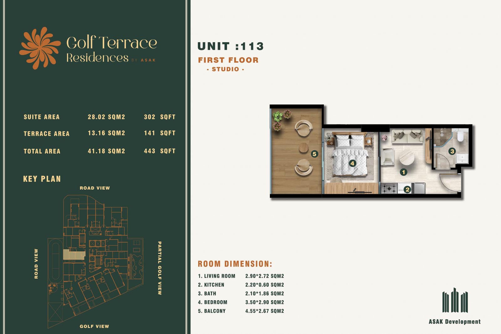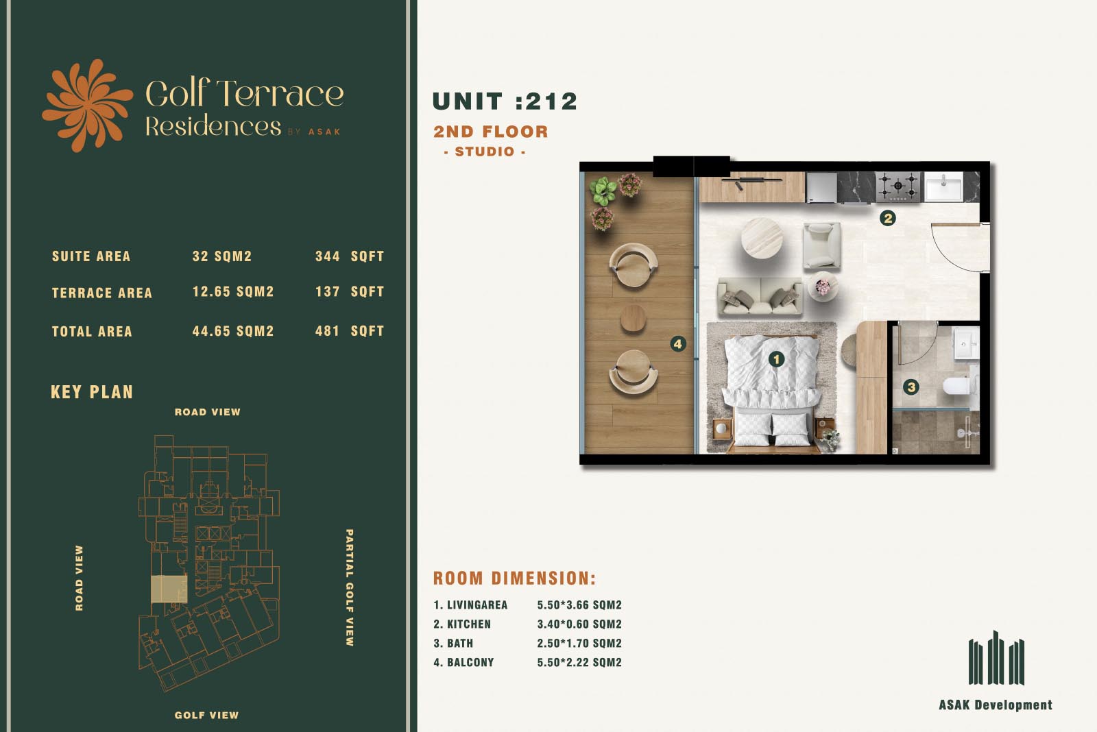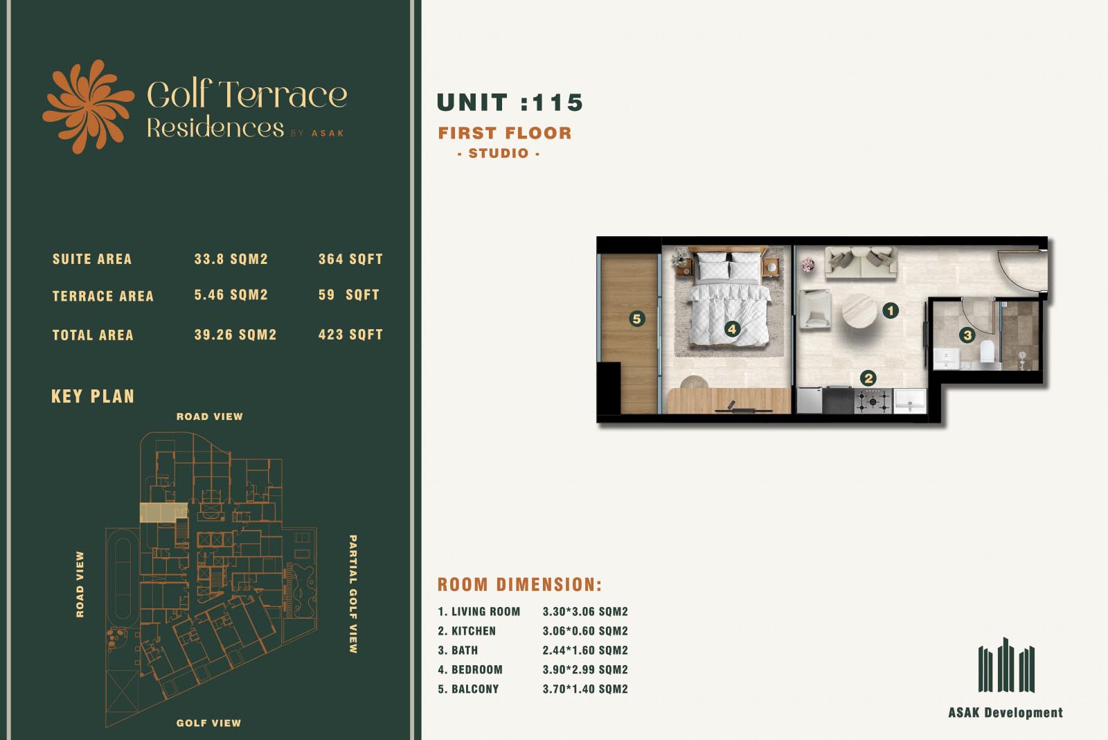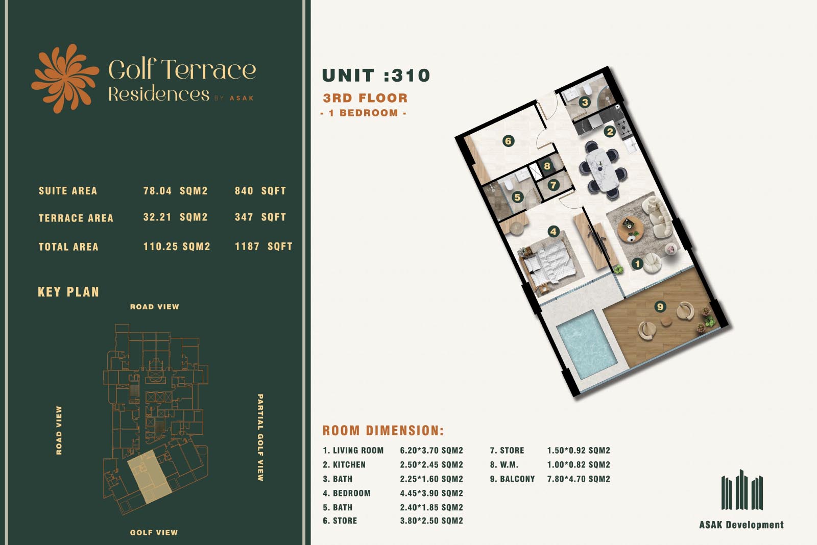 In Golf Terrace Residences the floor plans are dictated by practicality and the comfort of space, offering studios, 1 and 2-bedroom apartments. The rooms will be as spacious as possible with each house being constructed with optimized area to make the rooms look open and well characterized without wastage space. Living and dining areas are designed in such a way that they get a lot of natural lighting, and bedrooms are at a position where privacy and tranquillity are given. Kitchens and bathrooms are designed in accordance with the modern style that ensures their daily utility and includes considerate storage systems.