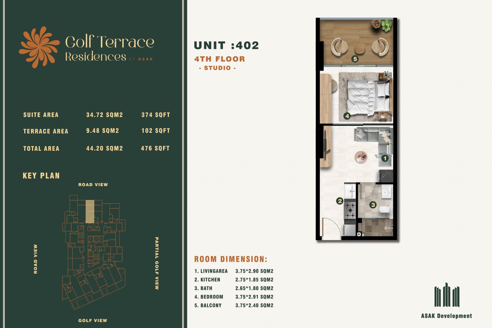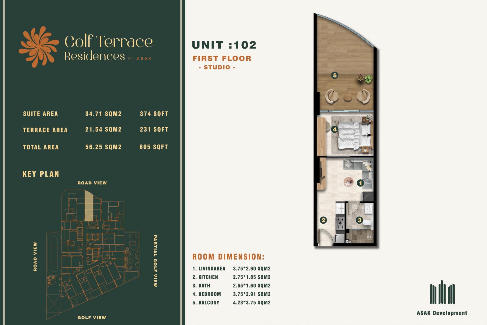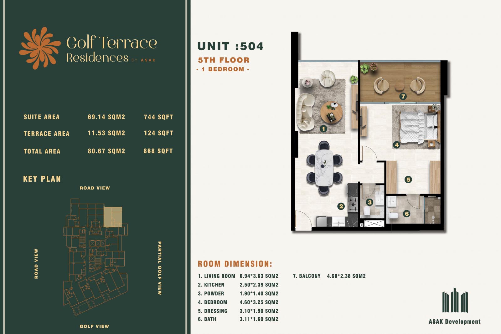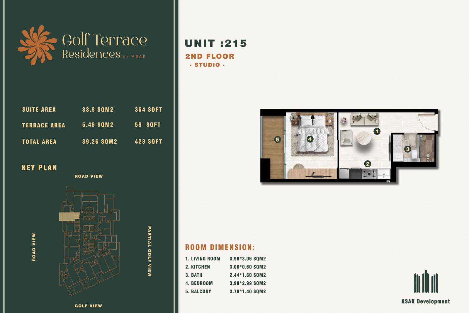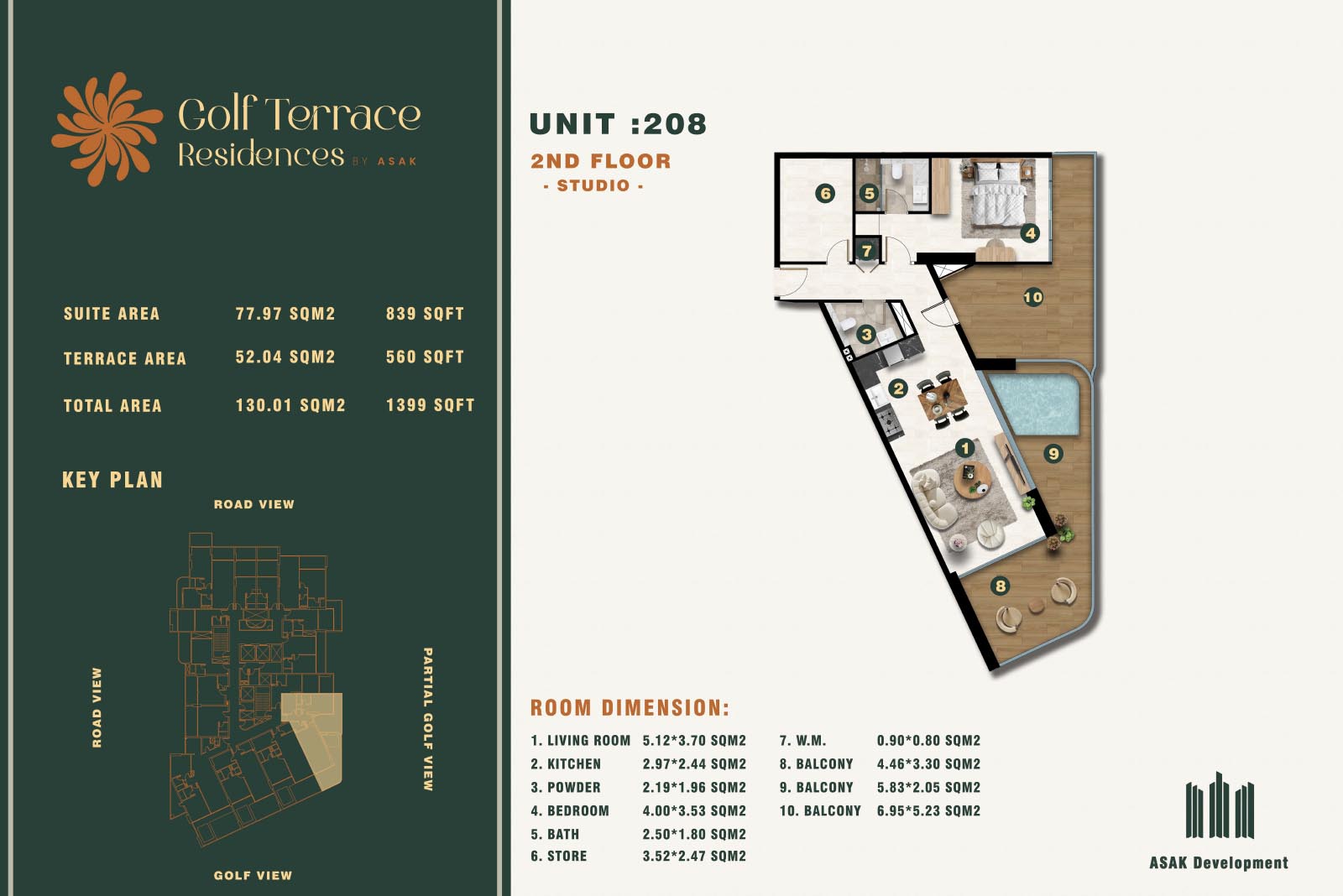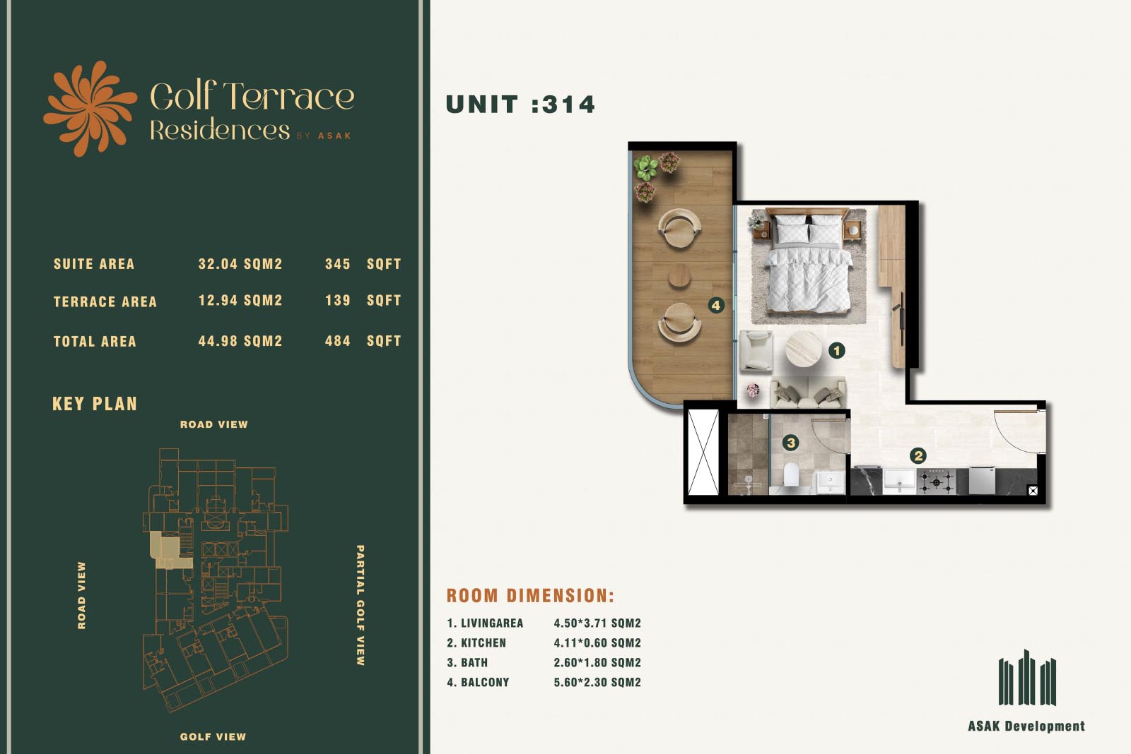 In Golf Terrace Residences the floor plans are dictated by practicality and the comfort of space, offering studios, 1 and 2-bedroom apartments. The rooms will be as spacious as possible with each house being constructed with optimized area to make the rooms look open and well characterized without wastage space. Living and dining areas are designed in such a way that they get a lot of natural lighting, and bedrooms are at a position where privacy and tranquillity are given. Kitchens and bathrooms are designed in accordance with the modern style that ensures their daily utility and includes considerate storage systems.