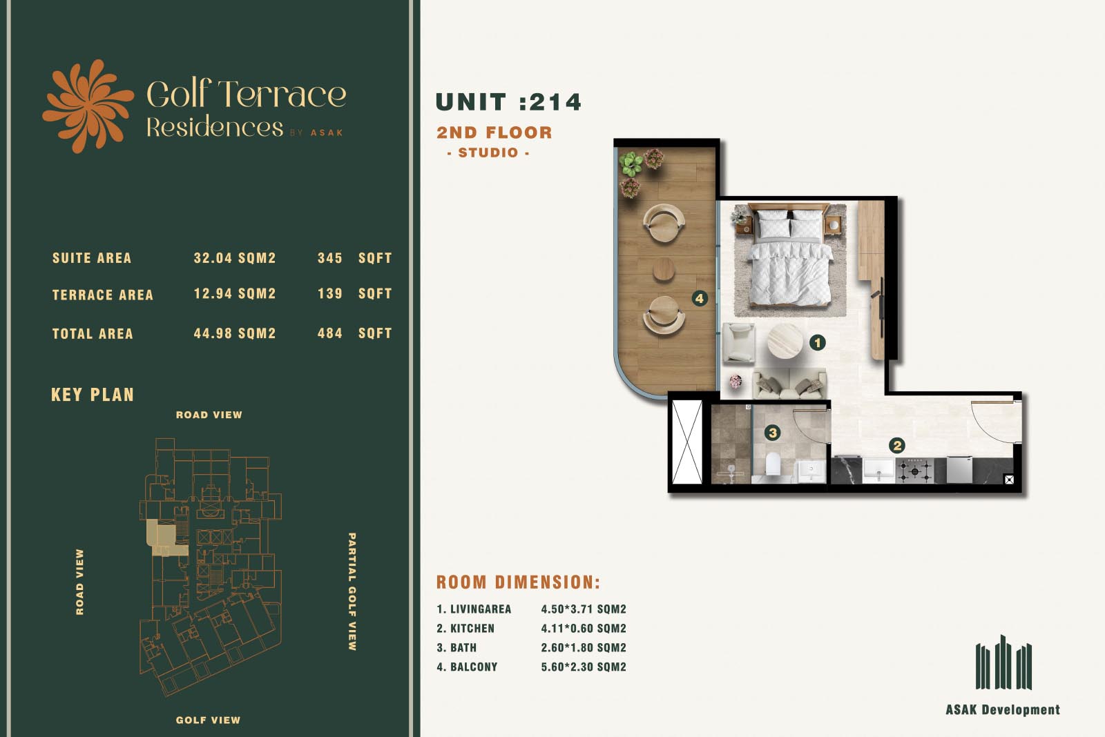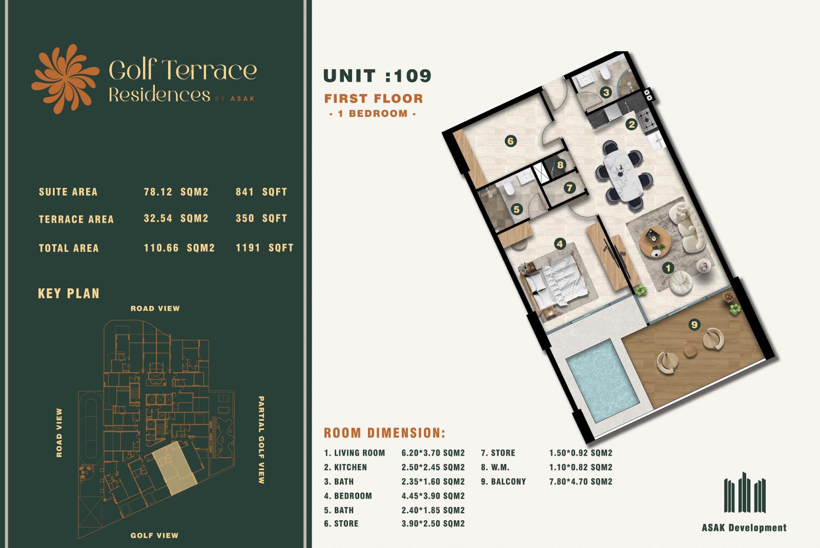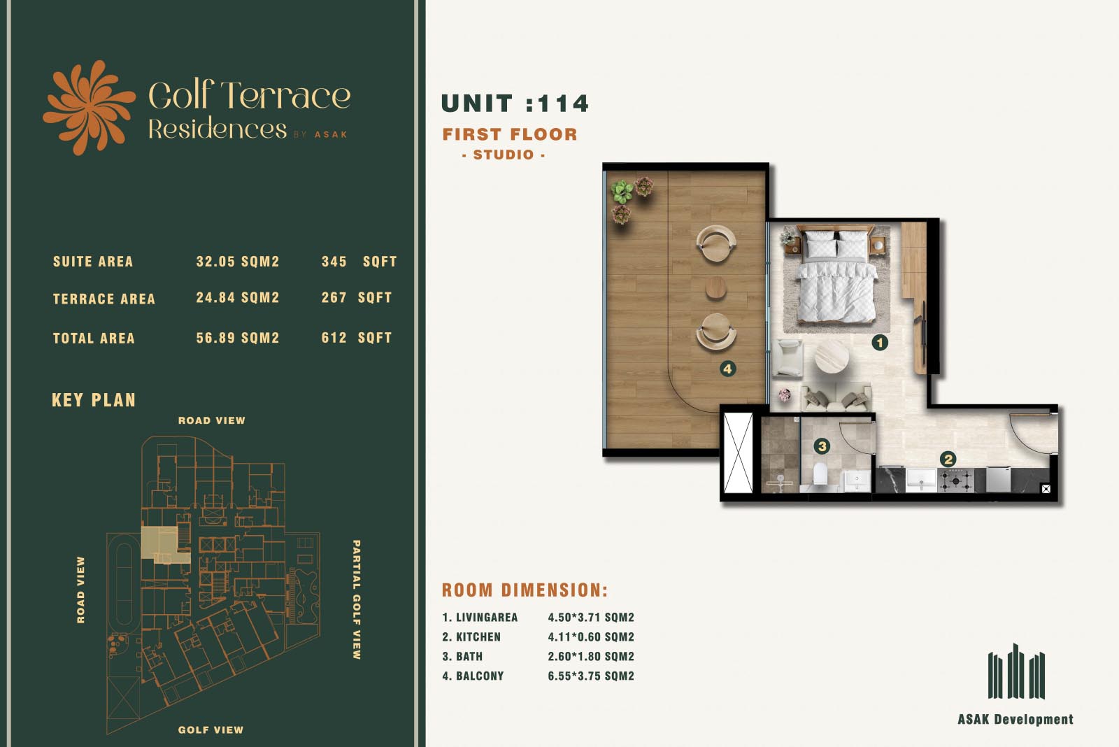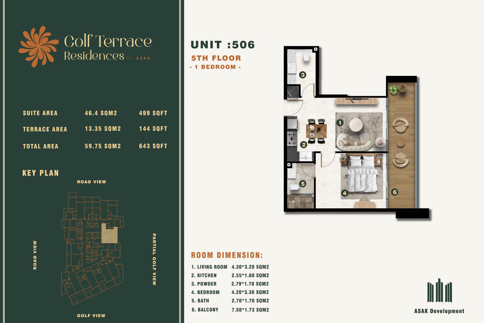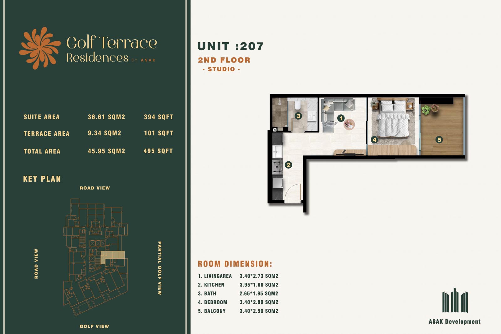In Golf Terrace Residences the floor plans are dictated by practicality and the comfort of space, offering studios, 1 and 2-bedroom apartments. The rooms will be as spacious as possible with each house being constructed with optimized area to make the rooms look open and well characterized without wastage space. Living and dining areas are designed in such a way that they get a lot of natural lighting, and bedrooms are at a position where privacy and tranquillity are given. Kitchens and bathrooms are designed in accordance with the modern style that ensures their daily utility and includes considerate storage systems.