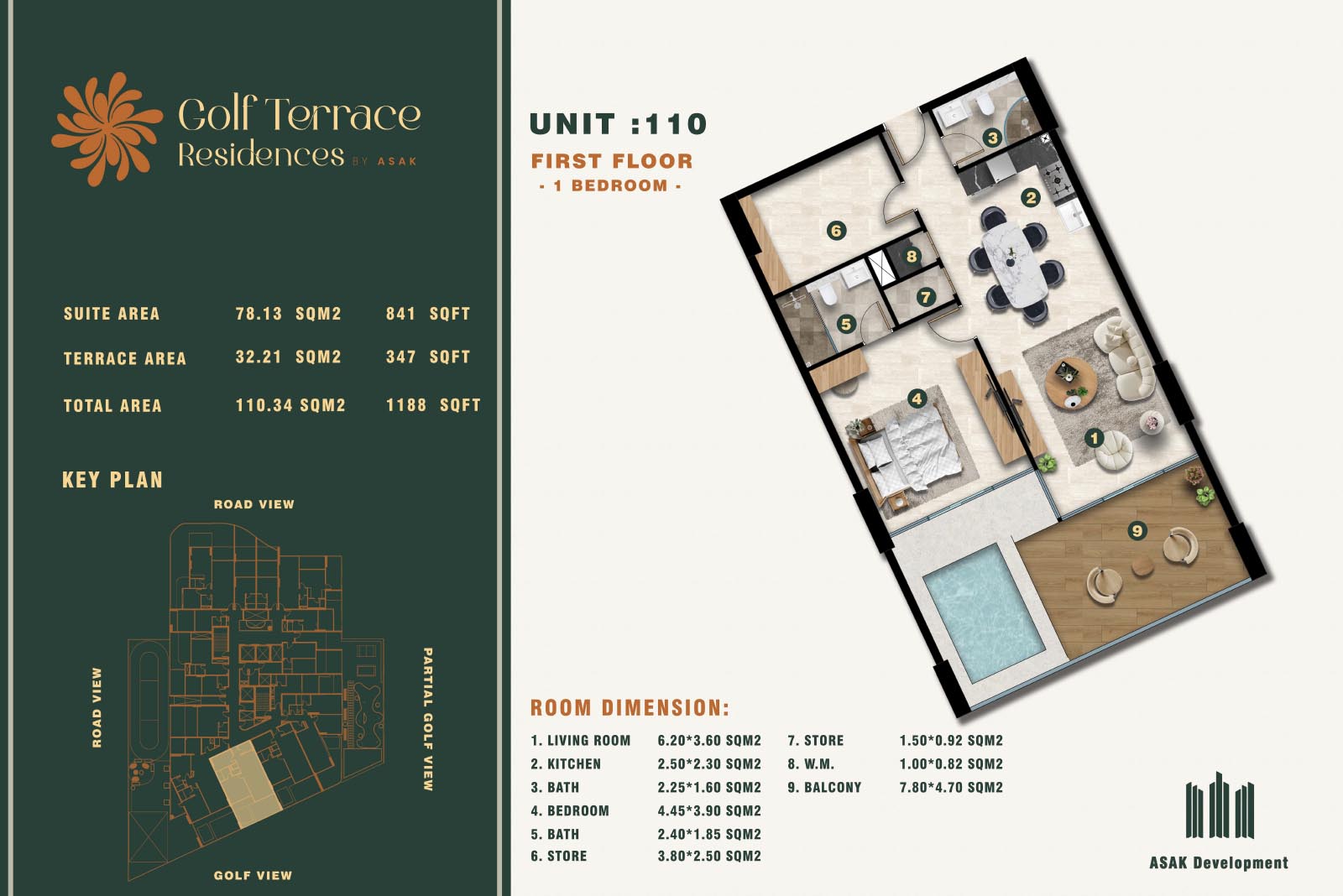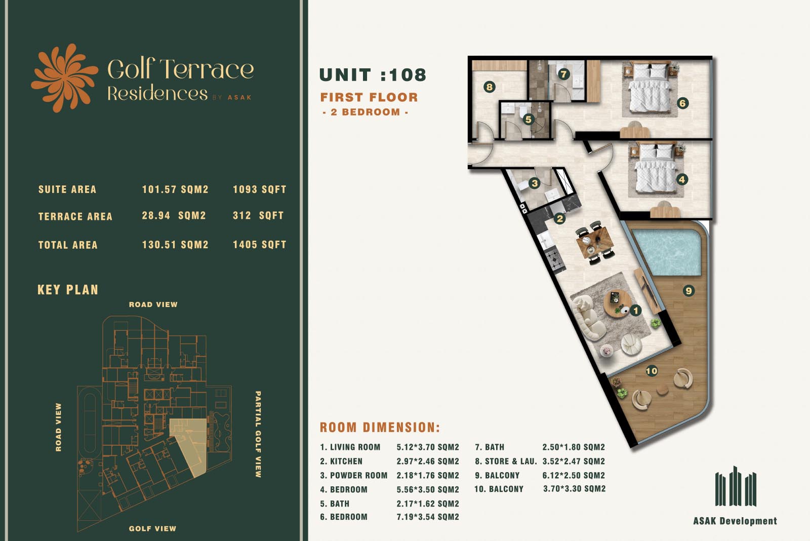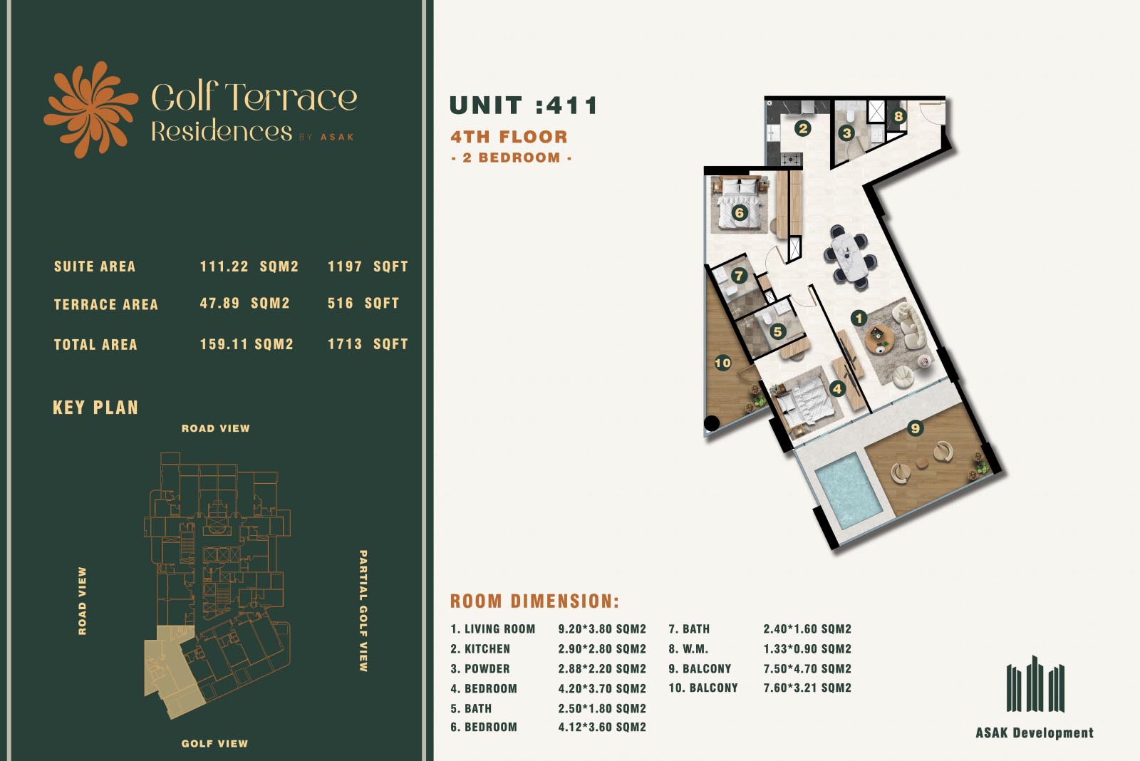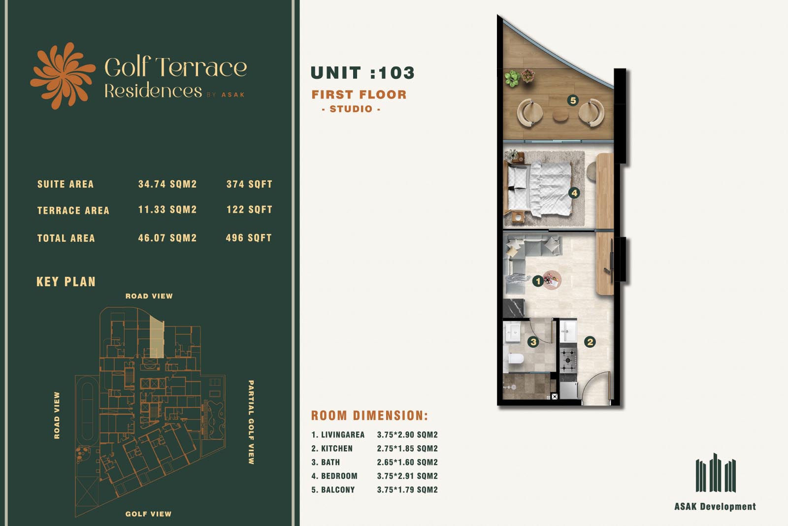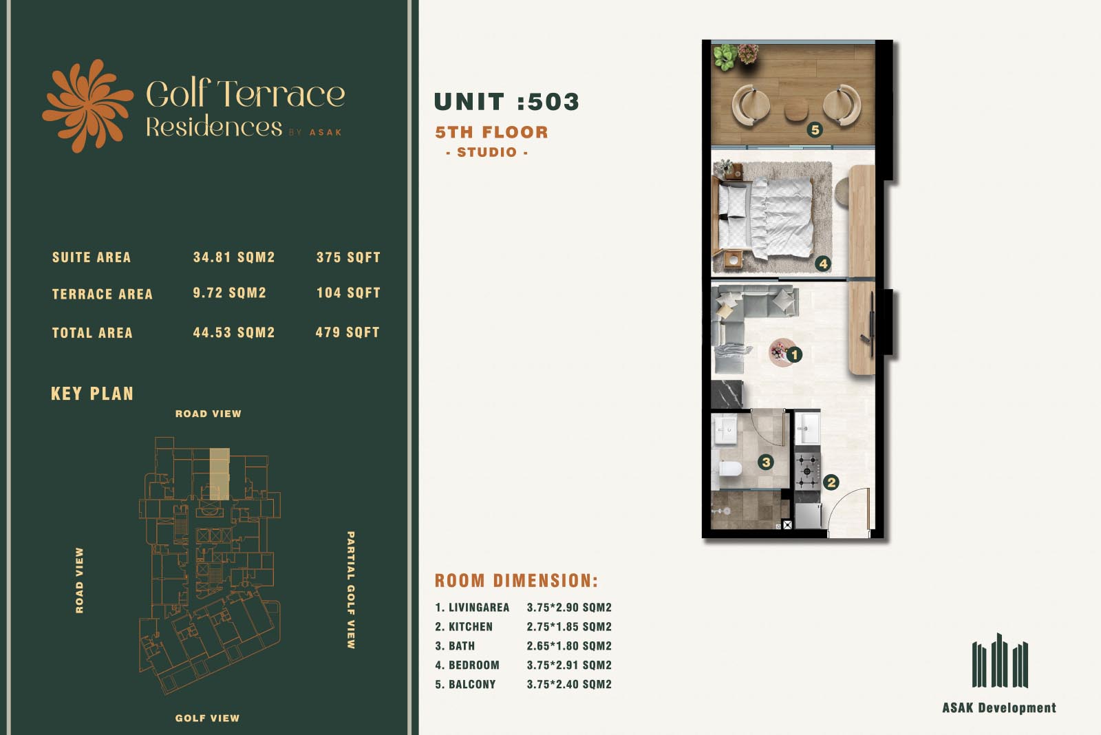 In Golf Terrace Residences the floor plans are dictated by practicality and the comfort of space, offering studios, 1 and 2-bedroom apartments. The rooms will be as spacious as possible with each house being constructed with optimized area to make the rooms look open and well characterized without wastage space. Living and dining areas are designed in such a way that they get a lot of natural lighting, and bedrooms are at a position where privacy and tranquillity are given. Kitchens and bathrooms are designed in accordance with the modern style that ensures their daily utility and includes considerate storage systems.