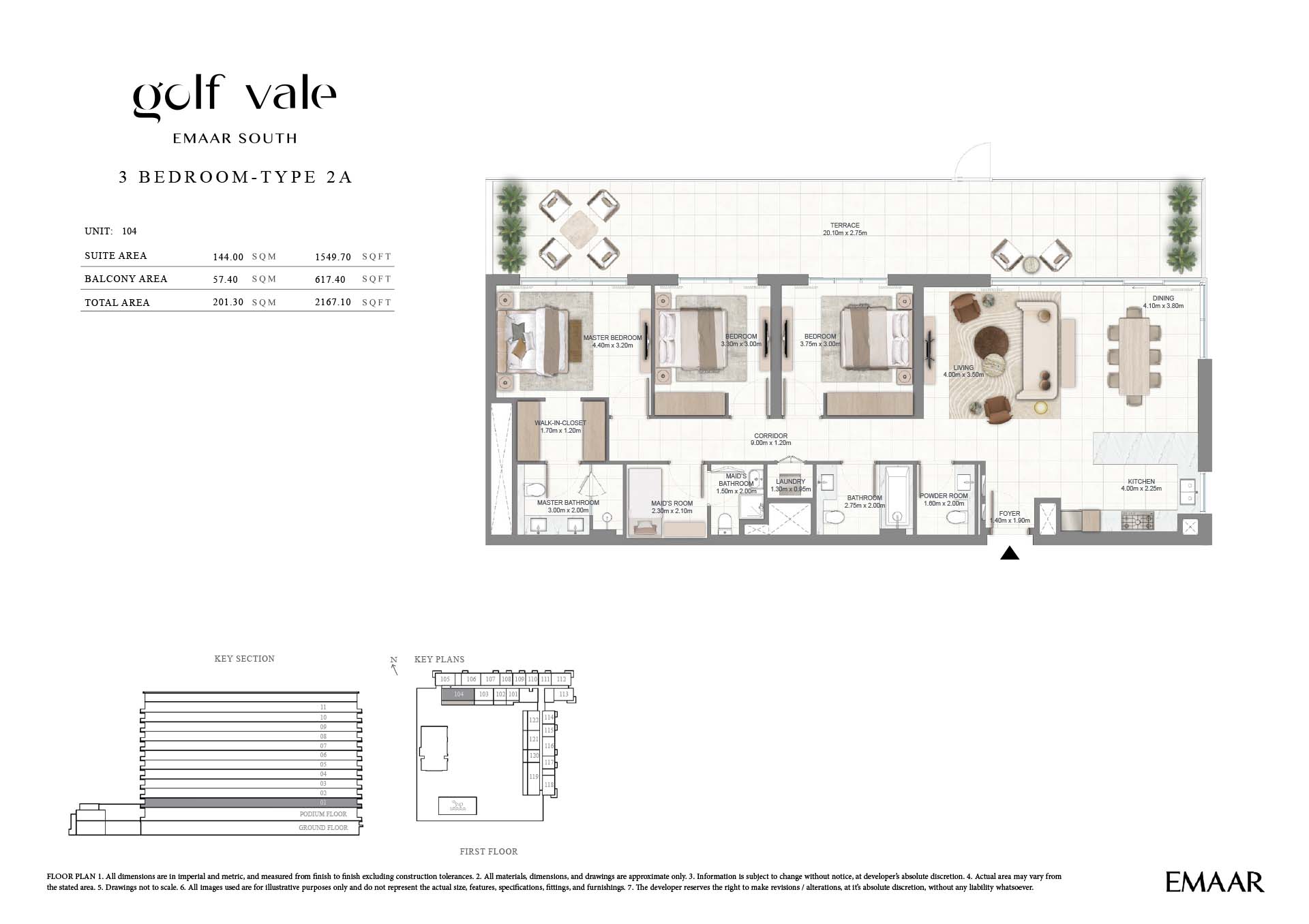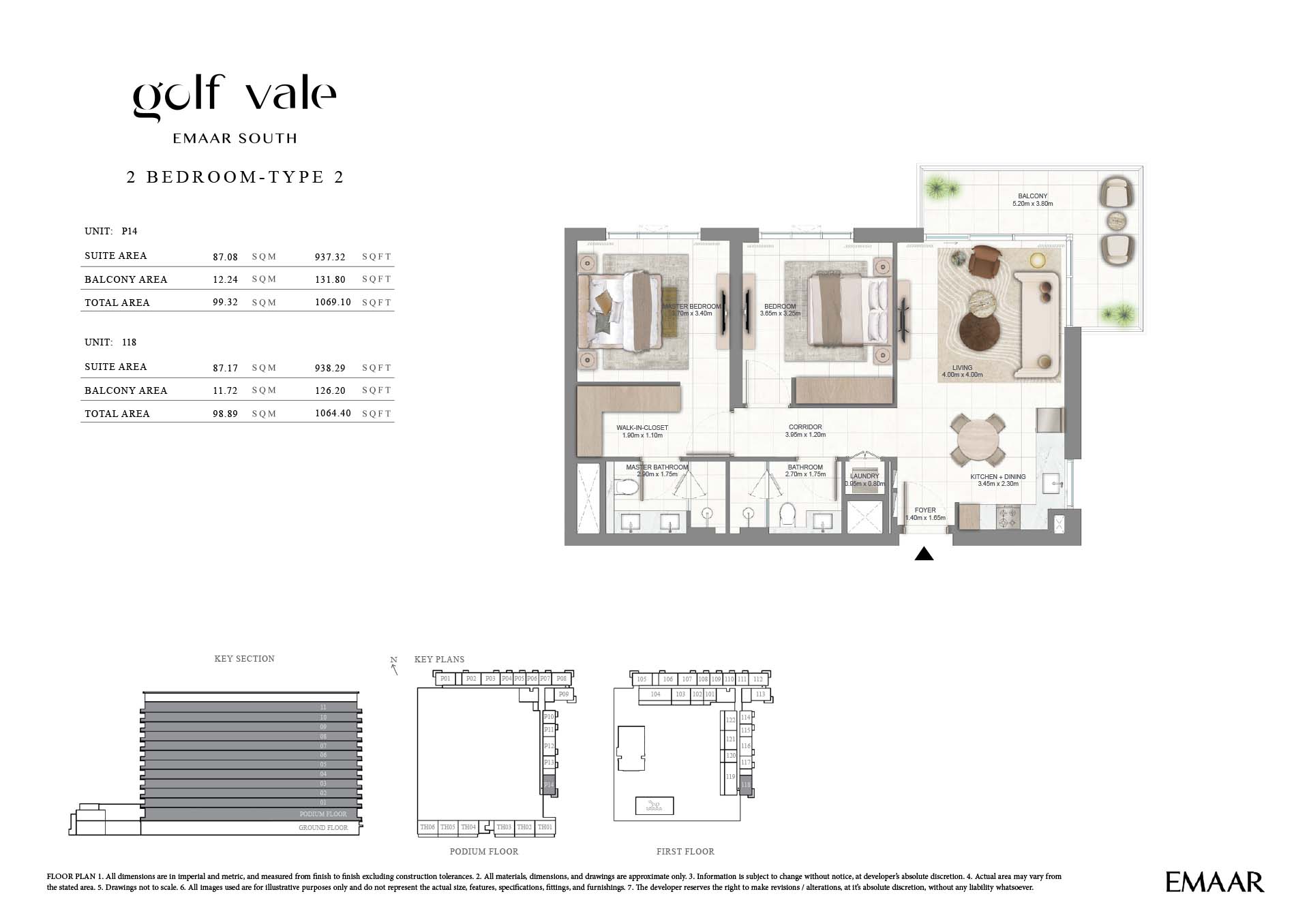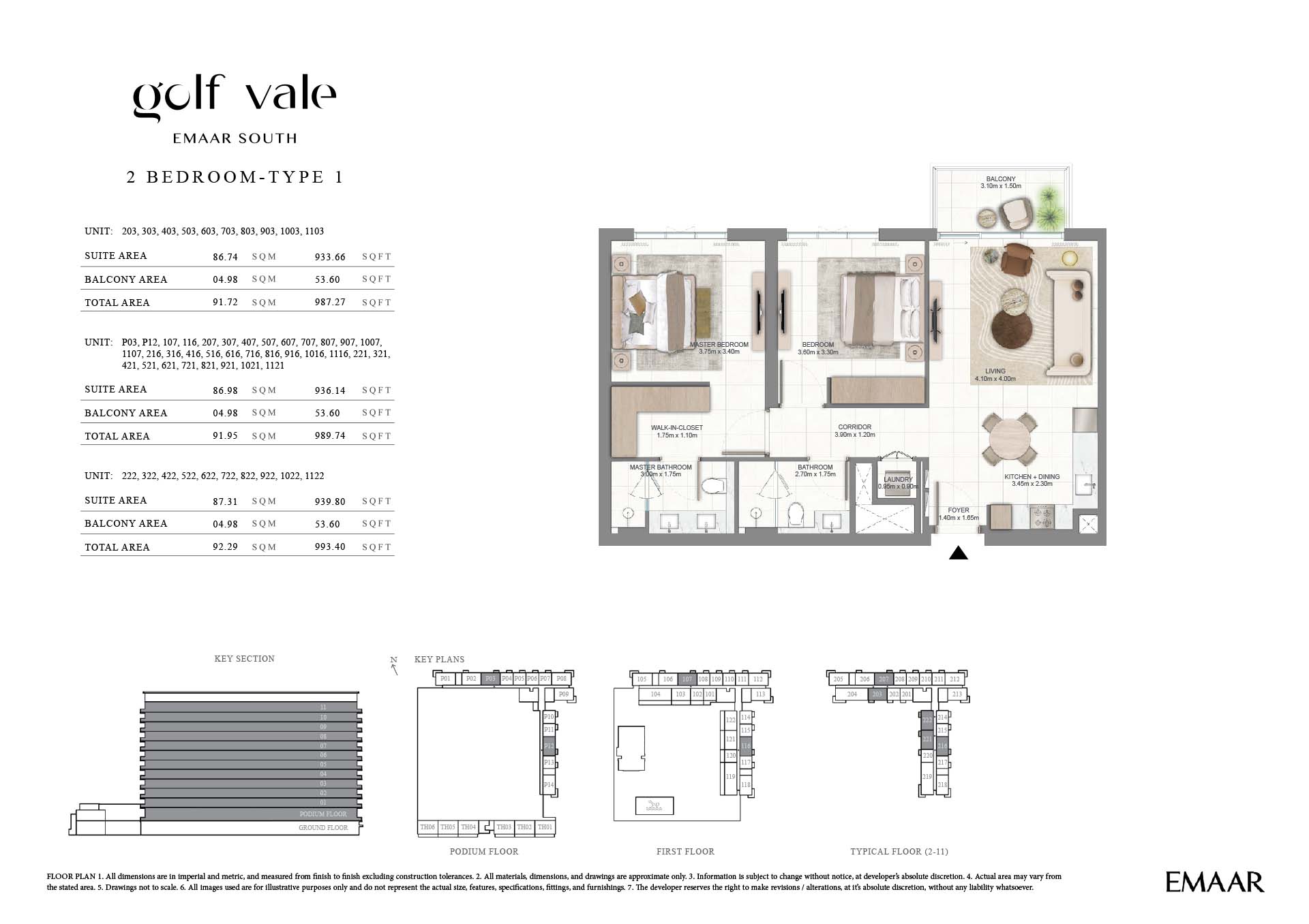 Emaar Golf Vale floor plan comprises varieties of well-planned 1, 2, and 3 bedroom apartments and 3-bedroom townhouses that focus on comfort, space optimization and modern lifestyle. The homes will also have open-space living and dining areas that ensure that they provide the feeling of spaciousness, yet they are surrounded by the practicality. The kitchens have modern finishes and functional designs, which make daily lifestyle in the kitchen convenient and trendy. Bedrooms are comfortable and come with built storage and bathrooms that are well designed.