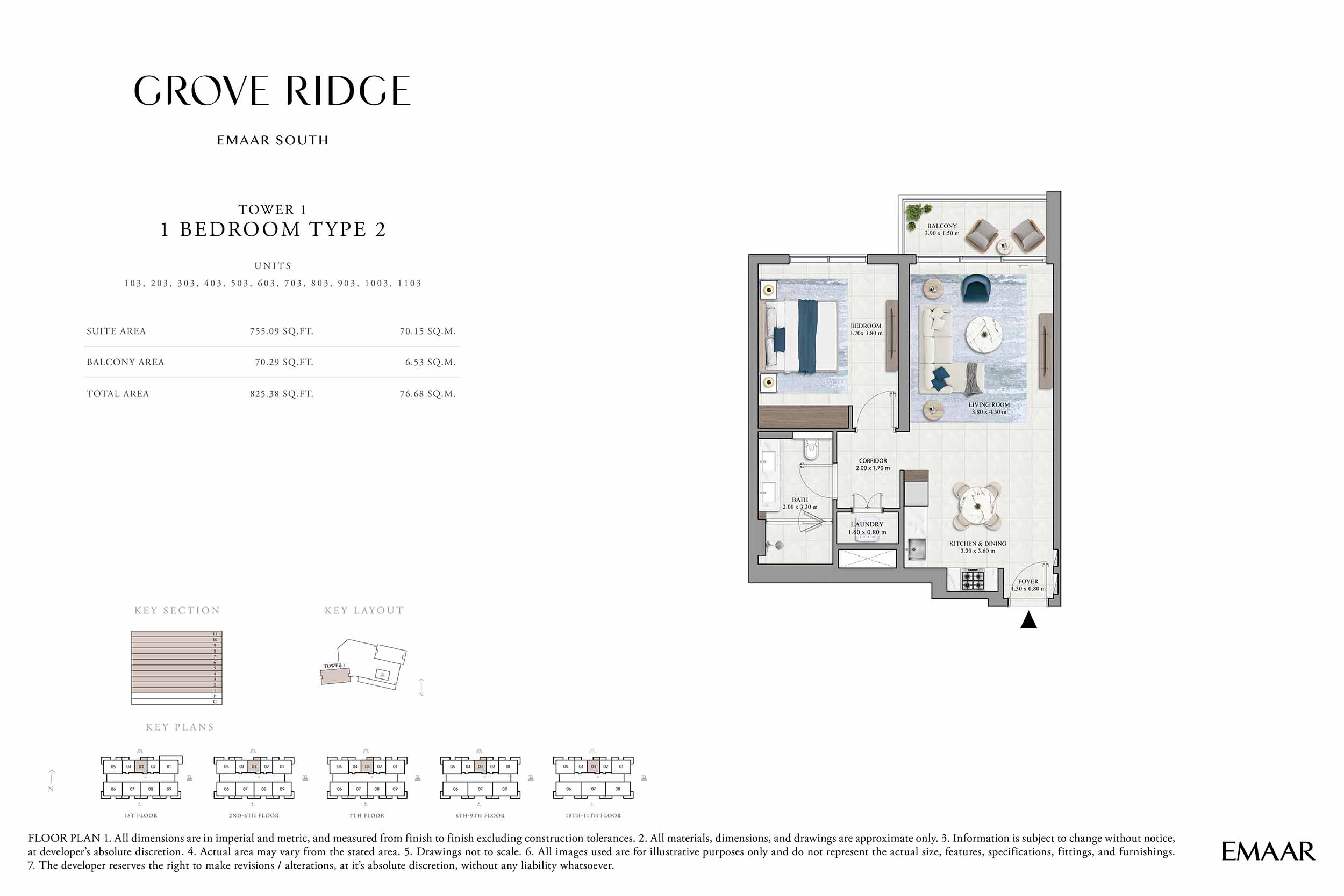 | Tower 1 | 1 Bedroom | 1st-11th Floor (Type 2-Unit-103-1103) | 825.38 Sq Ft | Click Here |